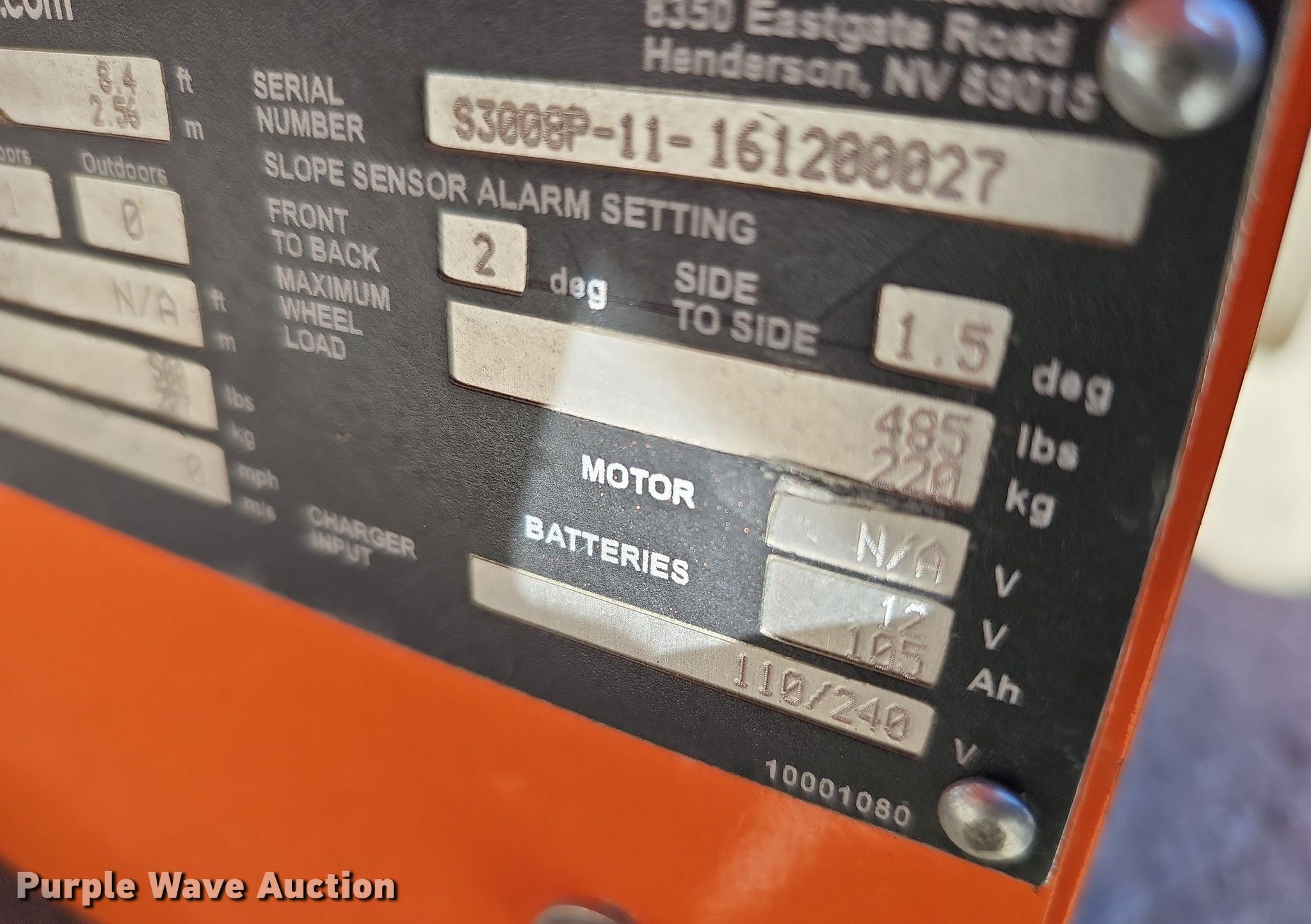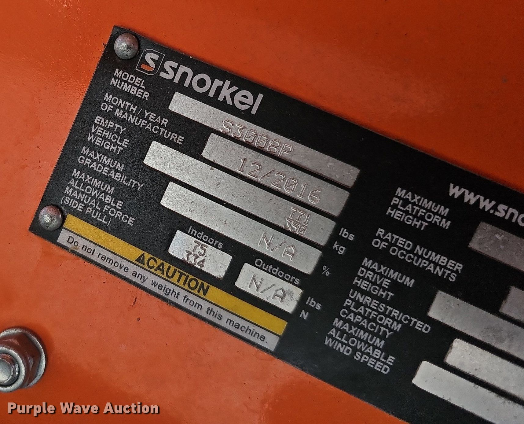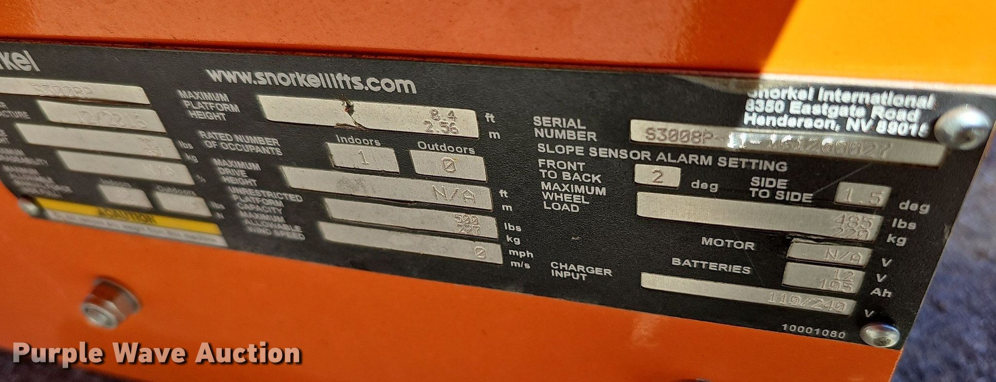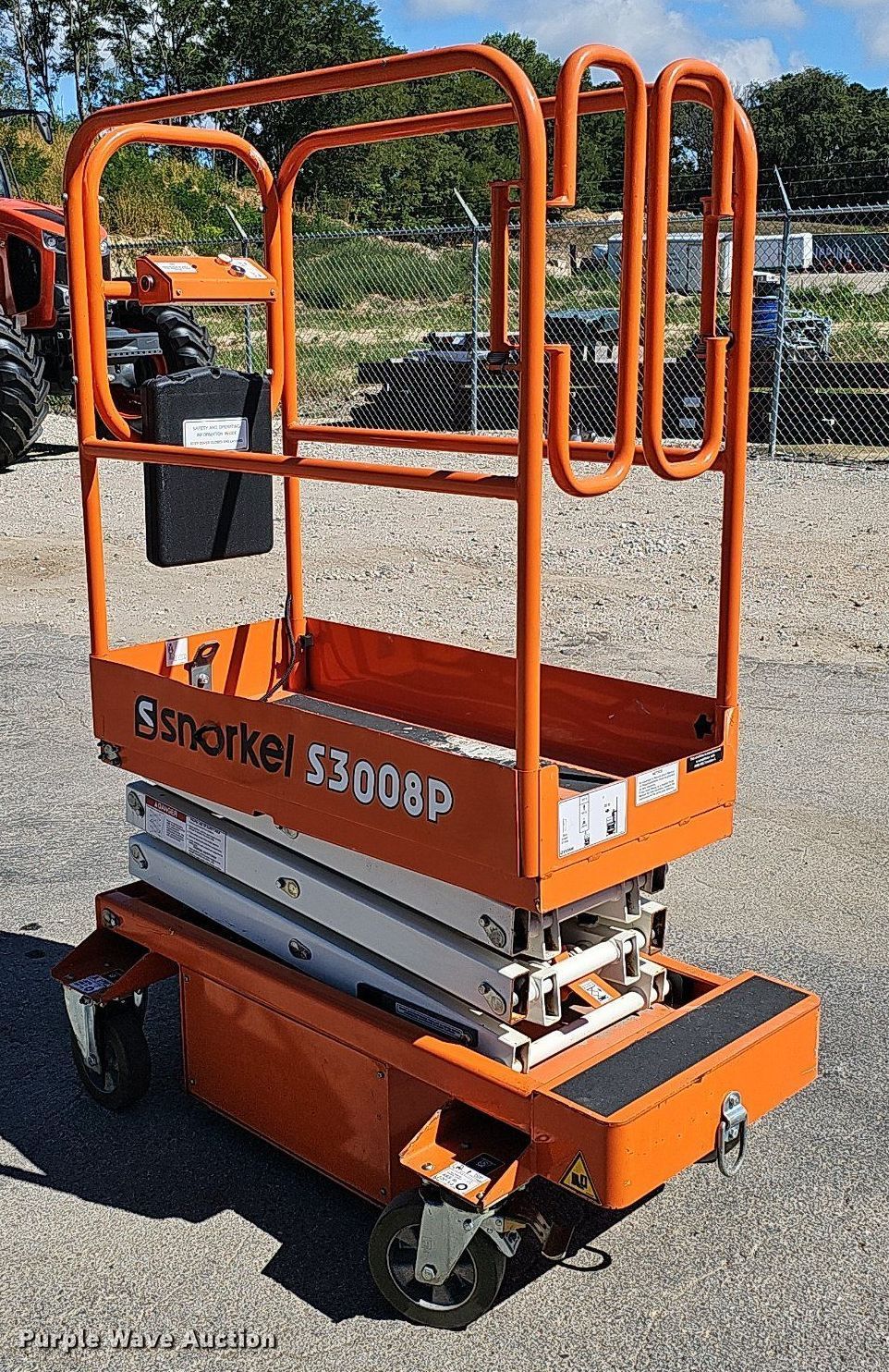 Purple Wave is selling a used Scissor or Vertical Lift in Nebraska. This item is a 2016 Snorkel S3008P scissor lift with the following: Serial: S3008P11161200027