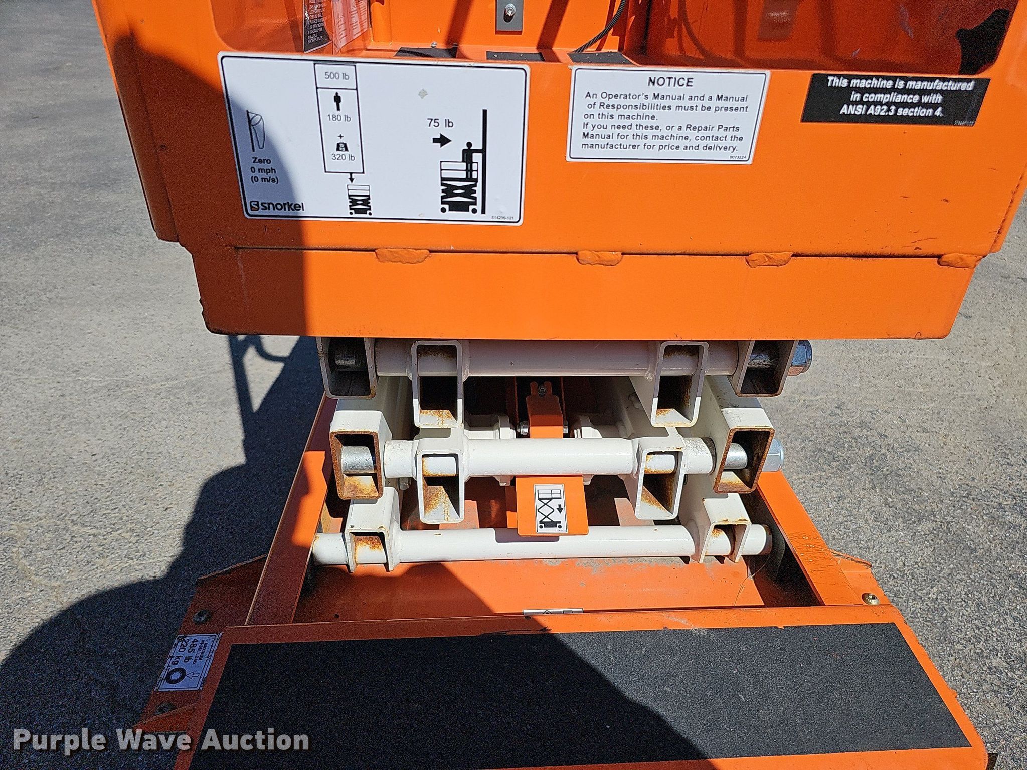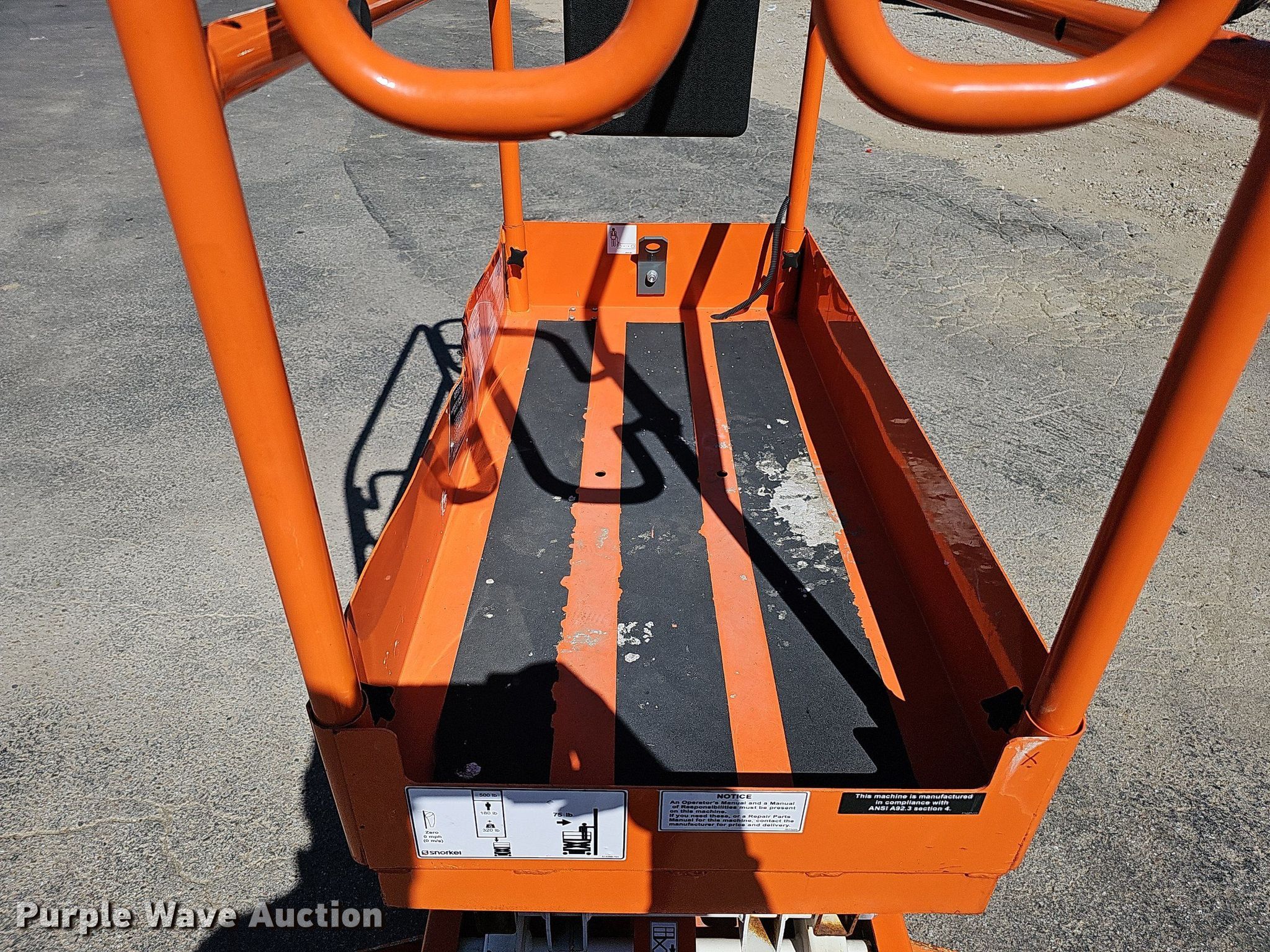 2016 Snorkel S3008P scissor lift. Serial: S3008P11161200027. Electric Motor Volts: 12. Features Maximum lift capacity: 500 lbs, Maximum lift height: 8.4', Platform: 43" L x 21" W, Controls: Platform, Safety alarm. Tires Tire size: 200x50, Solid, Non-marking. Notes Owners manual included. Nebraska Commercial Equipment. 10038 Kings Plaza. Omaha, NE 68122