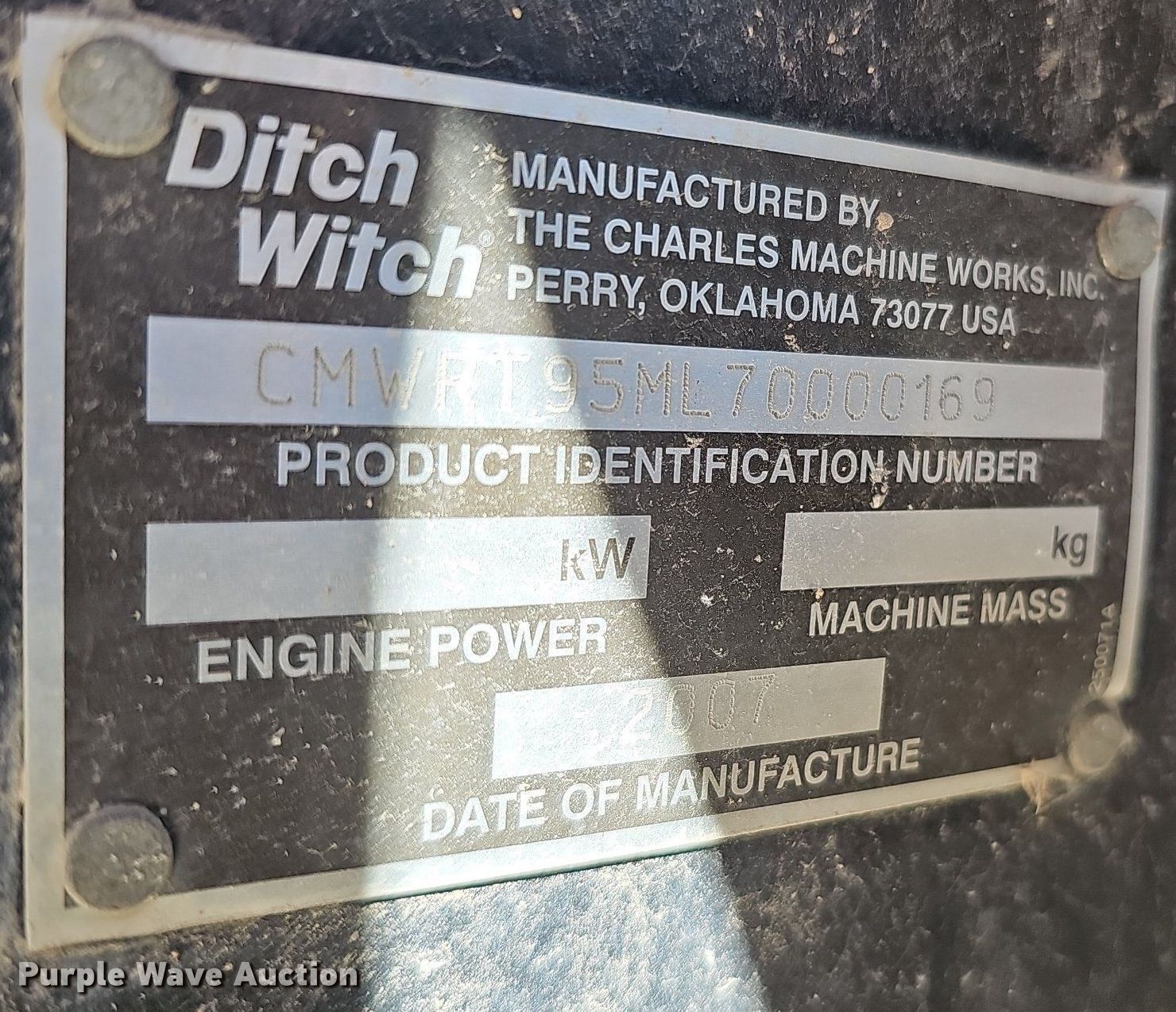 2007 Ditch Witch RT95 trencher. Hours: 1,915 on meter, Serial: CMWRT95ML70000169. Engine John Deere 4045TF270B, Displacement: 4.5L, Cylinders: 4, Fuel type: Diesel, kW: 74. Transmission Hydrostatic, Two speed travel, Four wheel drive, Differential lock, Four wheel steer. Features Trencher Model: M910, Serial: CMWM910XF70000221, Estimated dig depth: 96", Teeth: Rock, Dirt, Hydraulic crumber, Backfill blade Width: 80". Tires Size: 38x18.00-20. CL Construction. 3415 North 44th Street. Lincoln, NE 68504