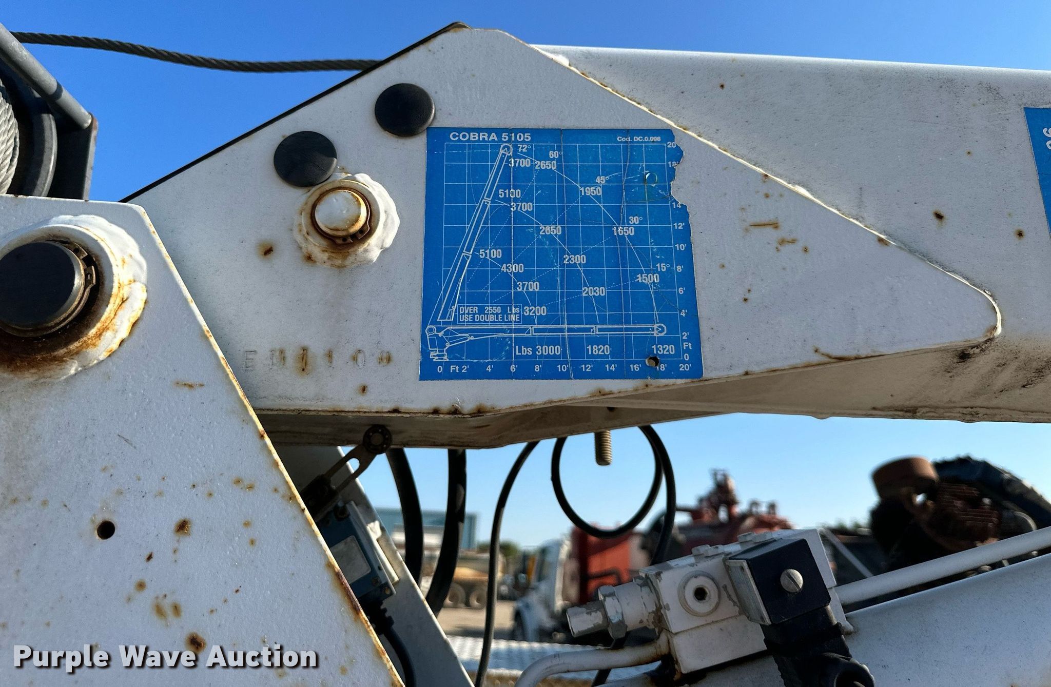 2001 Ford F550 utility / service truck. Miles: 239,336 on odometer, VIN: 1FDAF56FX1EA70830. Engine Displacement: 7.3L V8 OHV , Cylinders: 8, Fuel type: Diesel. Transmission Manual, Speed: 6. Chassis Axles: Single, Suspension: Spring, Brakes: Hydraulic, PTO. Interior AC, Heat, Cruise control, Auxiliary controls, Brake controller. Features Bed 158" L x 96" W, Schule Air compressor, Crane Cobra 5105, Maximum boom length: 20' Maximum lift capacity: 5,100 lbs.. Tires Size: 225/70R19.5. Notes Engine issues, knocks. Kansas title. Title distribution may be delayed up to 30 days from verification of funds. Schmidtlein Excavating, Inc.. 204 Northeast Rice Road. Topeka, KS 66616