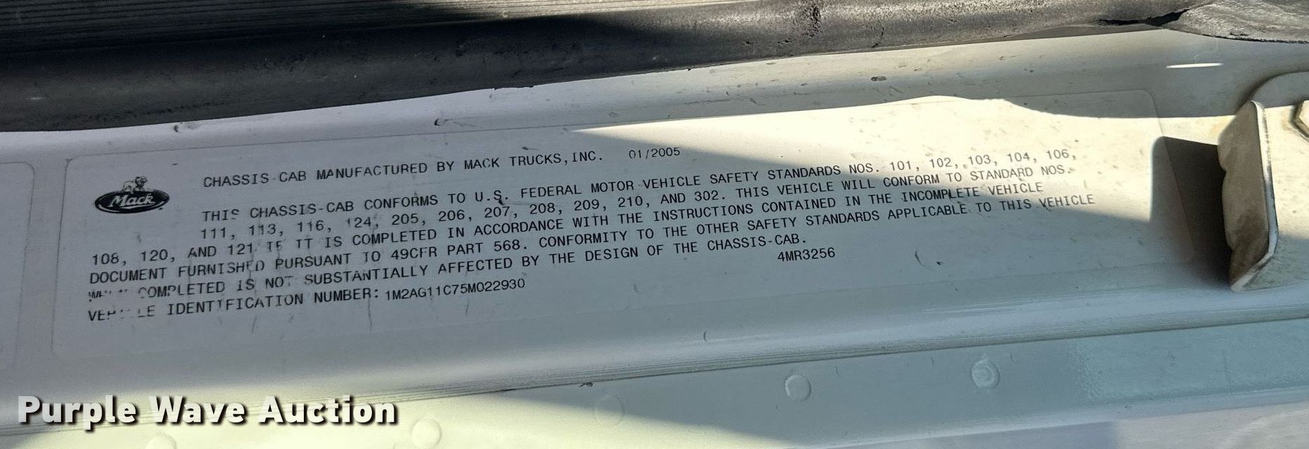 2005 Mack Granite dump truck. Miles: 322,921 on odometer, Hours: 22,954 on meter, VIN: 1M2AG11C75M022930. Engine Mack, Displacement: 12.0L, Cylinders: 6, Fuel type: Diesel. Transmission Mack Maxitorque, Manual, Speed: 10. Chassis Double frame, Axles: Triple, Pusher axle, Differential lock: Full, Suspension: Camelback, Brakes: Air, PTO. Interior AC, Heat, Cruise control. Features Dump bed Ox bodies , Capacity: 21 cu.yd., 16' x 96" W, Side height: 62", Bed type: Steel, Roll tarp, Ram: Single , End gate: Air operated. Tires Size: 385/65R22.5, Lift axle: 11/R22.5. Notes Frame rail damage, cracked. Kansas title. Title distribution may be delayed up to 30 days from verification of funds. Schmidtlein Excavating, Inc.. 204 Northeast Rice Road. Topeka, KS 66616
