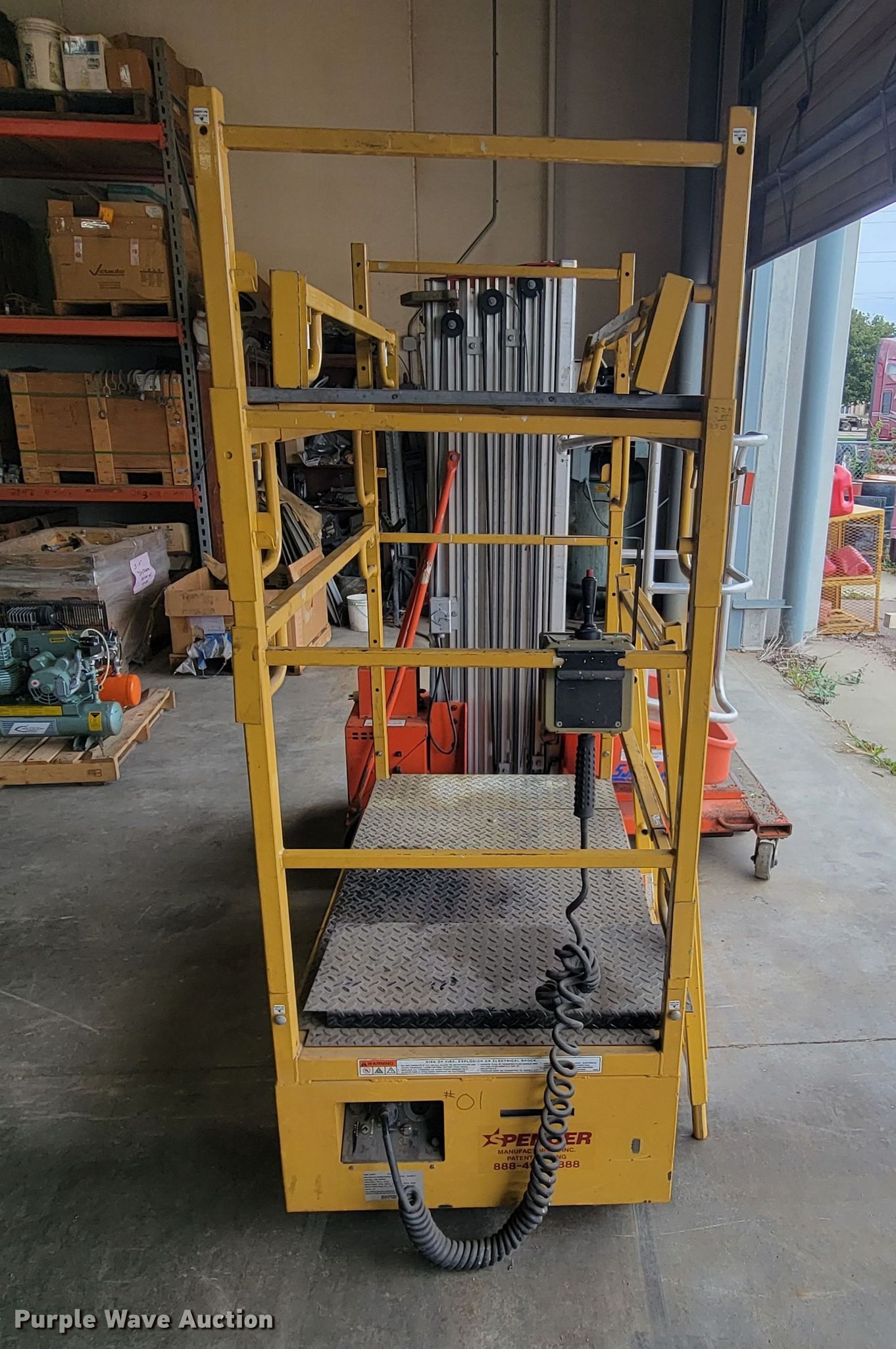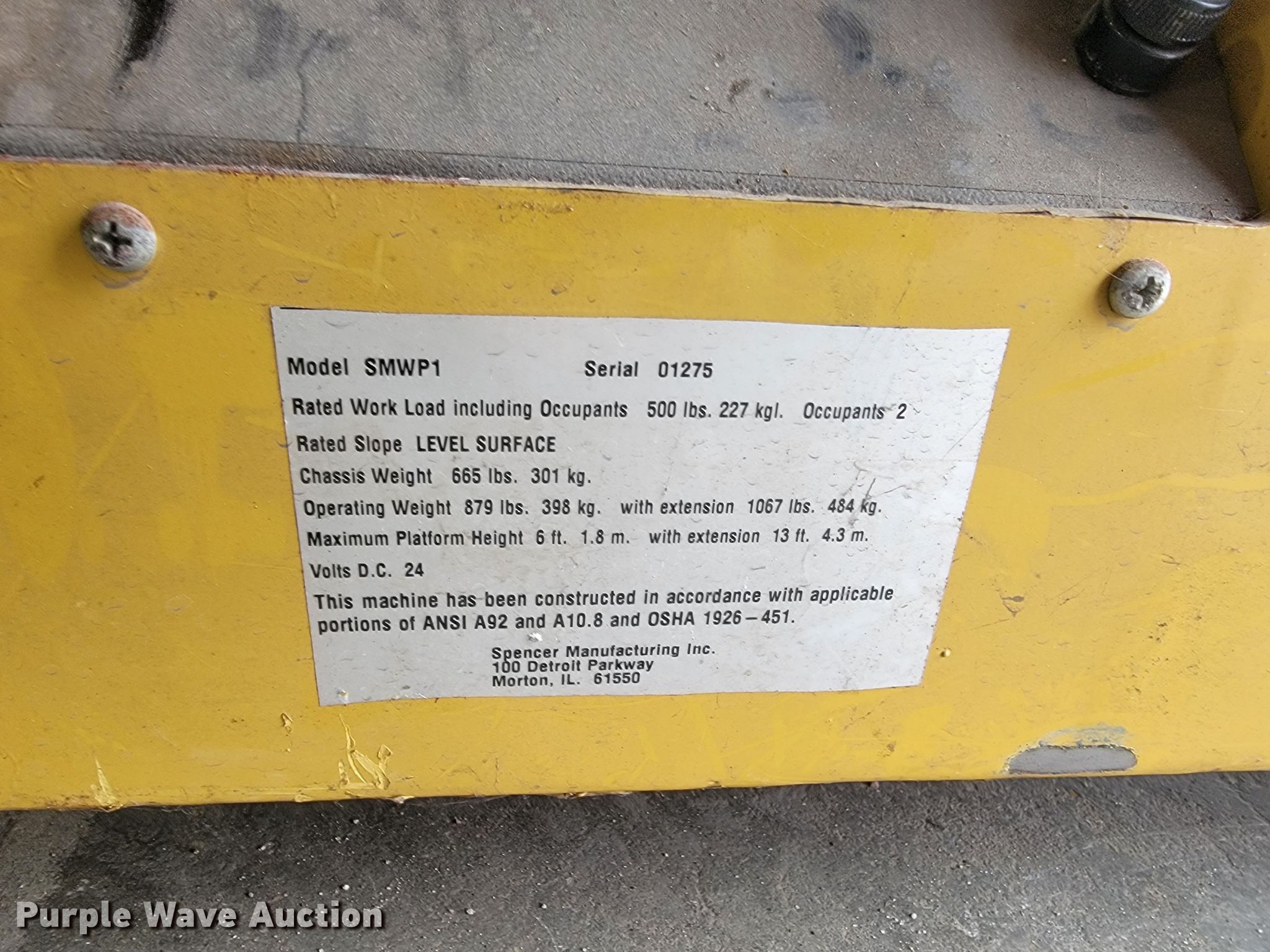 (2) vertical lifts. 1995 Sky Jack SJPI 25 vertical lift. Serial: 01630. Electric Motor Volts: 12. Features Maximum lift capacity: 350 lbs, Maximum lift height: 25', Platform: 28" L x 24" W, Controls: Platform. Spencer SMWP1 vertical lift Serial: 01275. Electric Motor Volts: 24. Features Maximum lift capacity: 500 lbs, Maximum lift height: 13', Platform: 51" L x 29" W, Controls: Remote, Ground. Notes Dead batteries, Non-operational units. Total Fire Protection. 1004 7th Ave N. Brandon, SD 57005