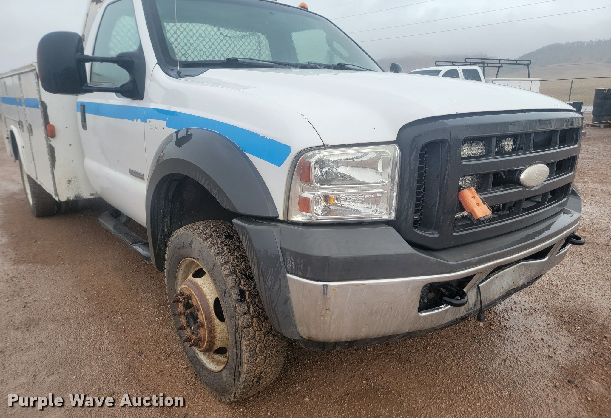 2005 Ford F550 Super Duty utility / service truck. Miles: 223,917 on odometer, VIN: 1FDAF56P45EC71363. Engine Displacement: 6.0L, Cylinders: 8, Fuel type: Diesel, HP: 325. Transmission Automatic. Chassis Axles: Single, Suspension: Spring, Brakes: Hydraulic, GVWR: 17,950 lbs. Interior AC, Heat, Power windows, Power locks, Auxiliary controls. Features Bed 11' L x 96" W, Torch bottle rack. Tires Size: 225/70R19.5. Notes Ignition switch issues Push button installed. South Dakota title. Title distribution may be delayed up to 14 days from verification of funds. Heavy Construction. 4101 Deadwood Avenue North. Rapid City, SD 57709