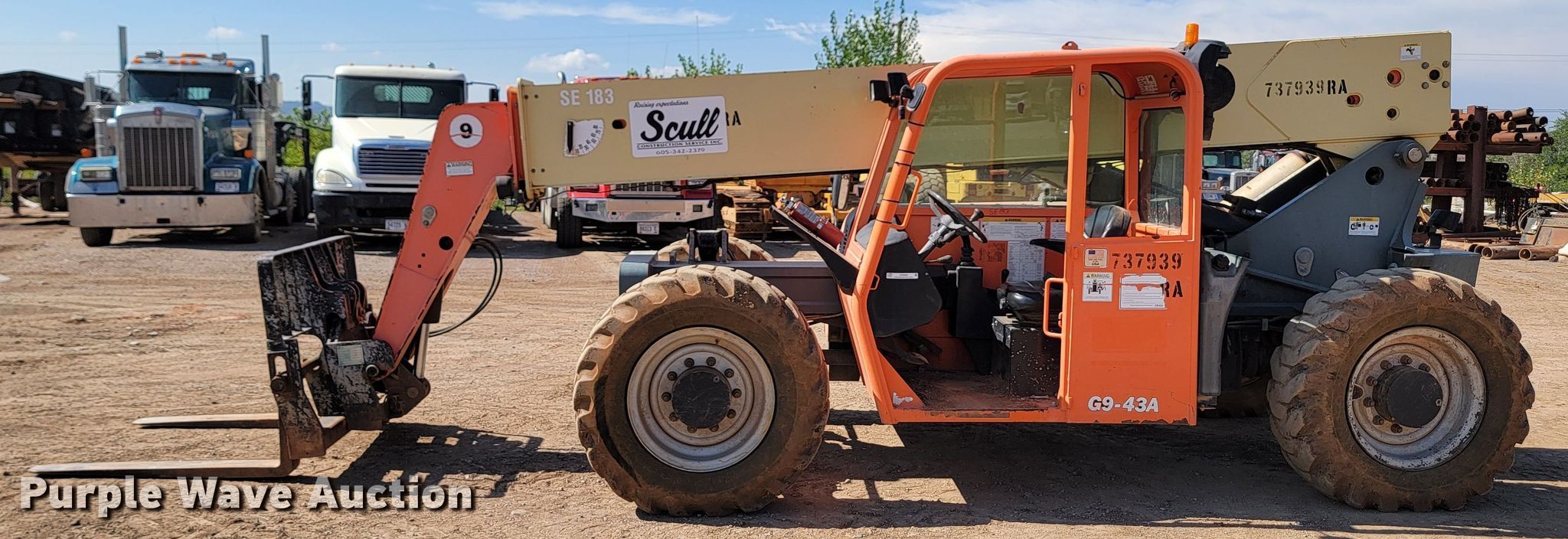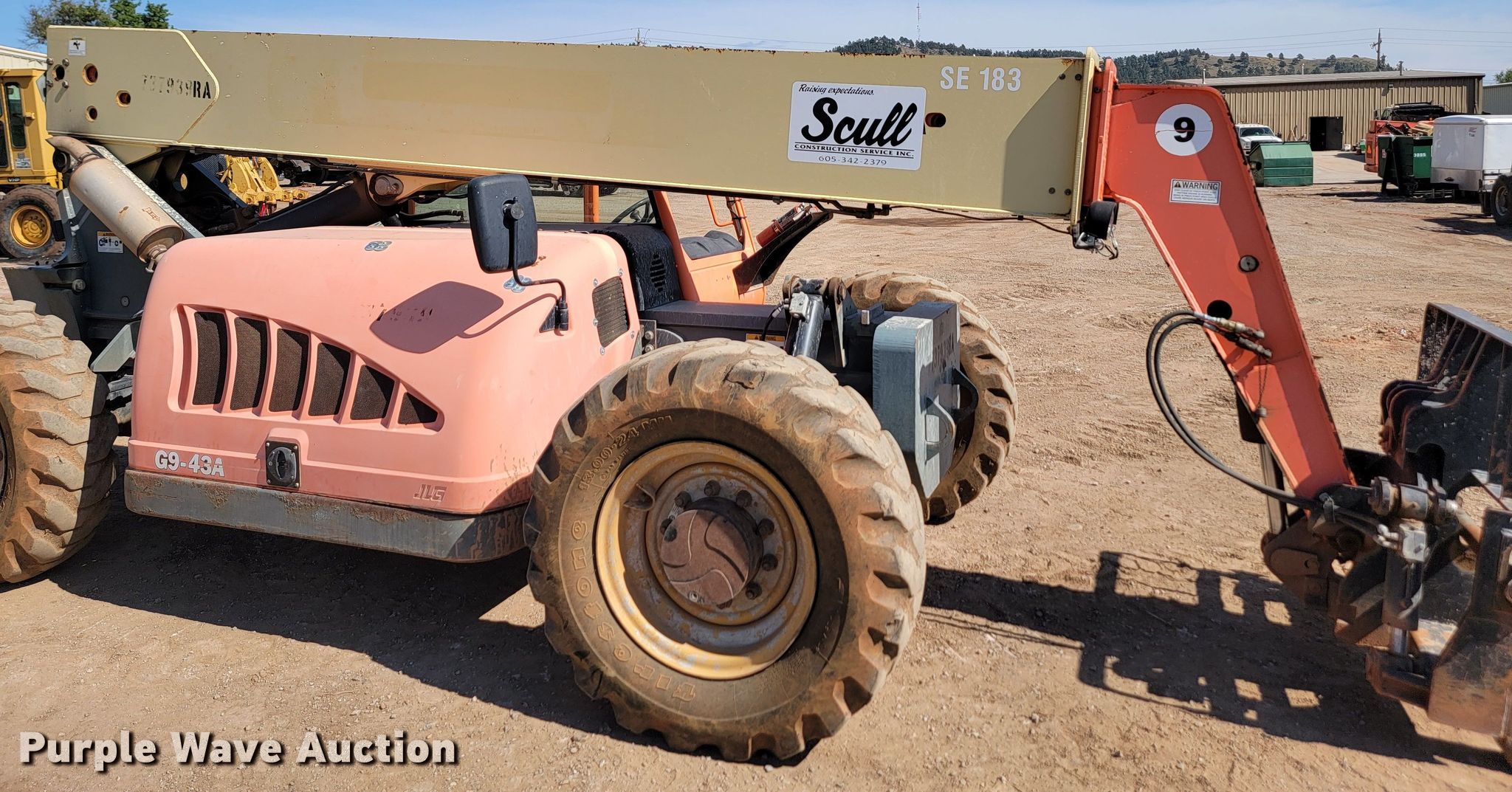 2008 JGL G9-43A telehandler. Hours: 1,793 on meter, Serial: 0160033677, Unit #: SE183. Engine John Deere, Displacement: 4.5L, Cylinders: 4, Fuel type: Diesel. Transmission Powershift, 4F - 4R, Four wheel drive. Operators station OROPS, Steering: Crab, Four wheel. Features Maximum lift capacity: 9,000 lbs, Maximum lift height: 43', Boom stages: 3, Fork length: 48", Auxiliary hydraulics, Tilt carriage, Hydraulic leveling, Quick attach: Manual. Tires Size: 13.00-24, Foam filled. Scull Construction. 803 Industrial Avenue. Rapid City, SD 57702