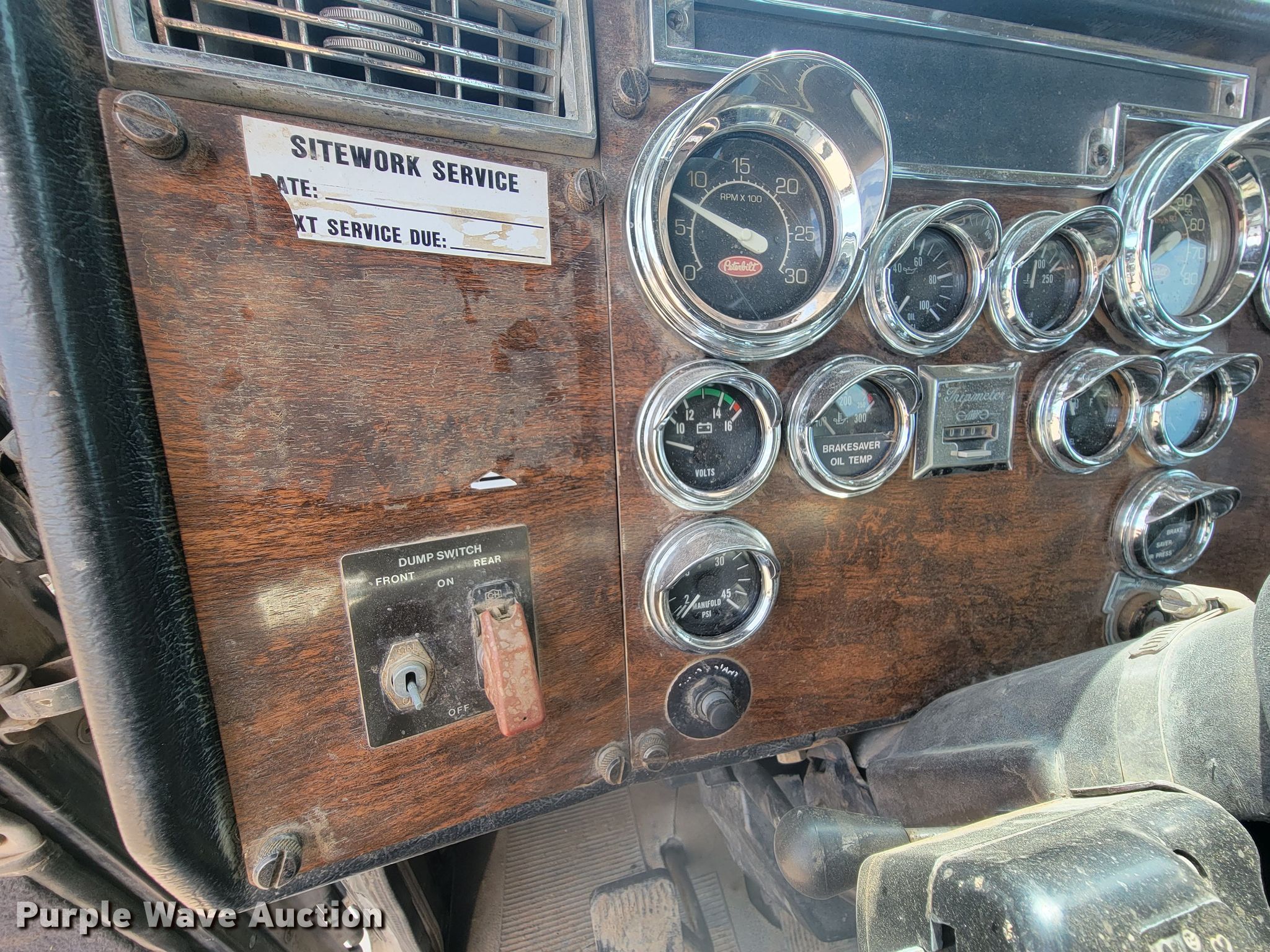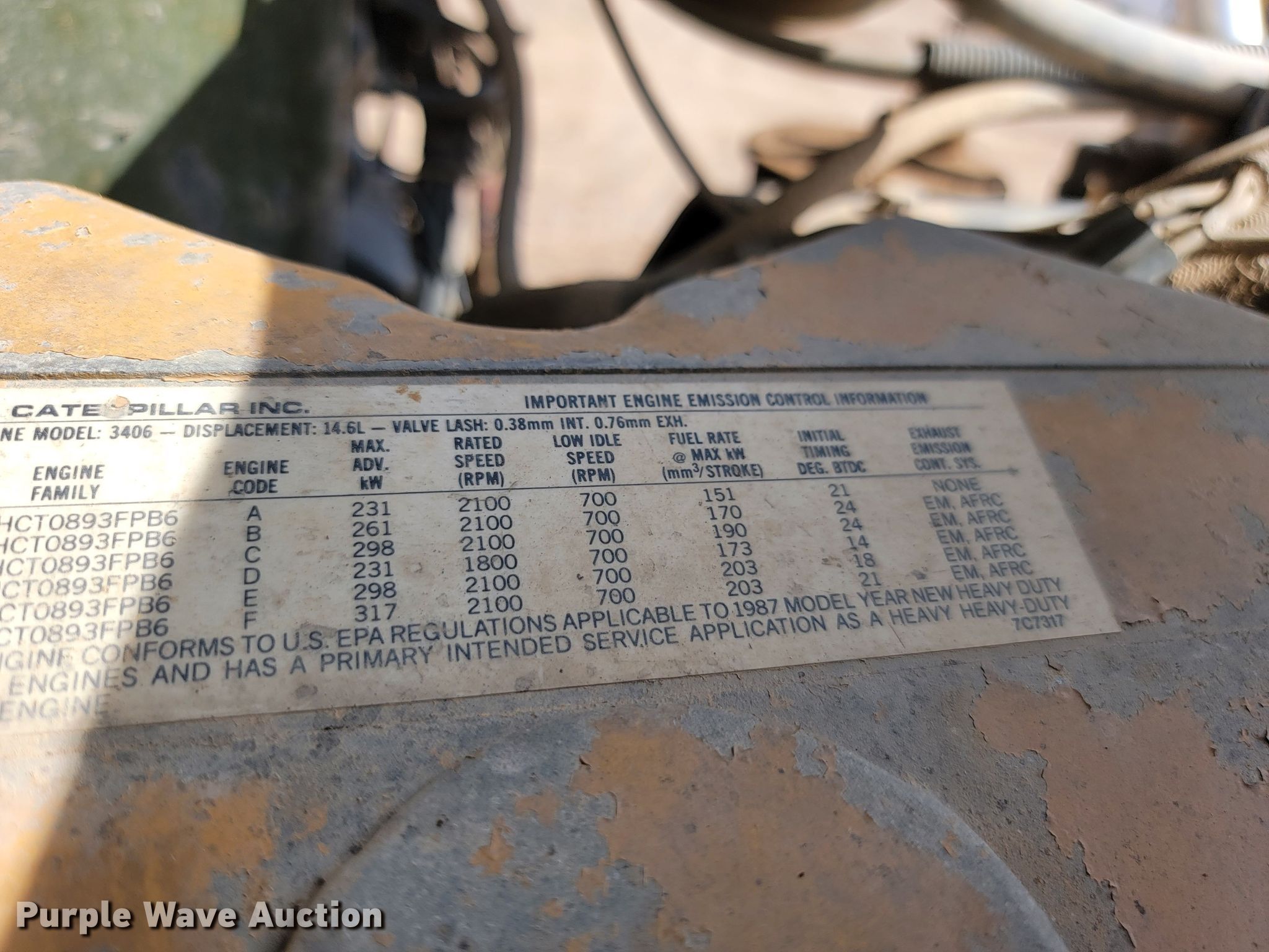 1995 Peterbilt 378 semi truck. Miles: 1,103,898 on odometer, VIN: 1XPFDB9X4SD363681, Unit #: 902-17. Engine Caterpillar 3406, Displacement: 14.6L, Cylinders: 6, Fuel type: Diesel, Engine brake. Transmission Eaton Fuller, Manual, Speed: 15. Chassis Axles: Tandem, Pusher axle Steerable, Differential lock: Inter-axle, Suspension: Air Dump valves, Brakes: Air, PTO, Wet kit, Truck chassis: 15' 8" L, GVWR: 52,000 lbs FAWR: 12,000 lbs, IAWR: 20,000 lbs, RAWR: 20,000 lbs. Interior AC, Heat, Heated mirrors. Features Fifth wheel type: Air operated, Sliding, Fuel tank: Dual. Tires Size: 11R24.5, Lift axle: 255/70R22.5. Notes Dead battery. South Dakota title. Title distribution may be delayed up to 14 days from verification of funds. Site Work Specialist Inc.. 803 Industrial Avenue. Rapid City, SD 57702