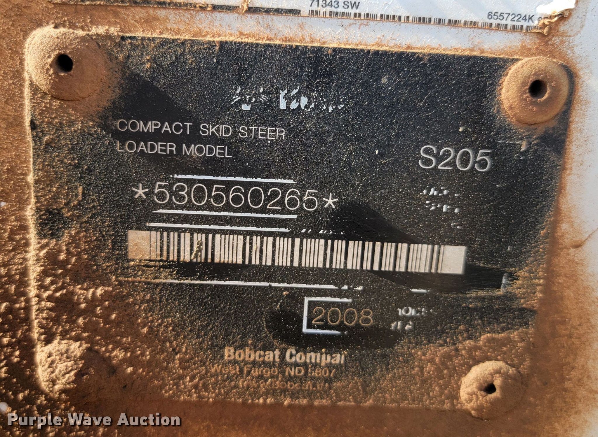 Purple Wave is selling a used Skid Steer Loader in South Dakota. This item is a 2008 Bobcat S205 skid steer loader with the following: Hours: 3,892 on meter, Serial: 530560265, Unit #: SE118