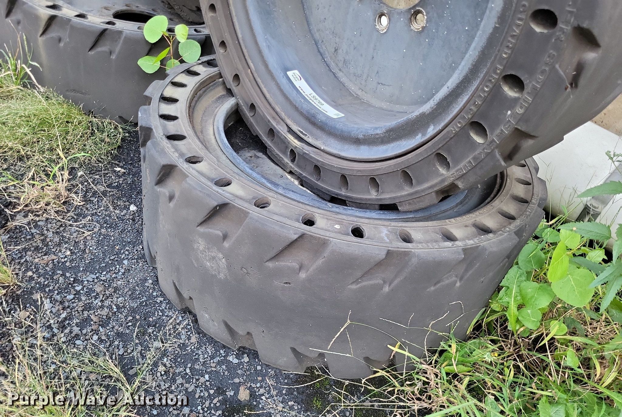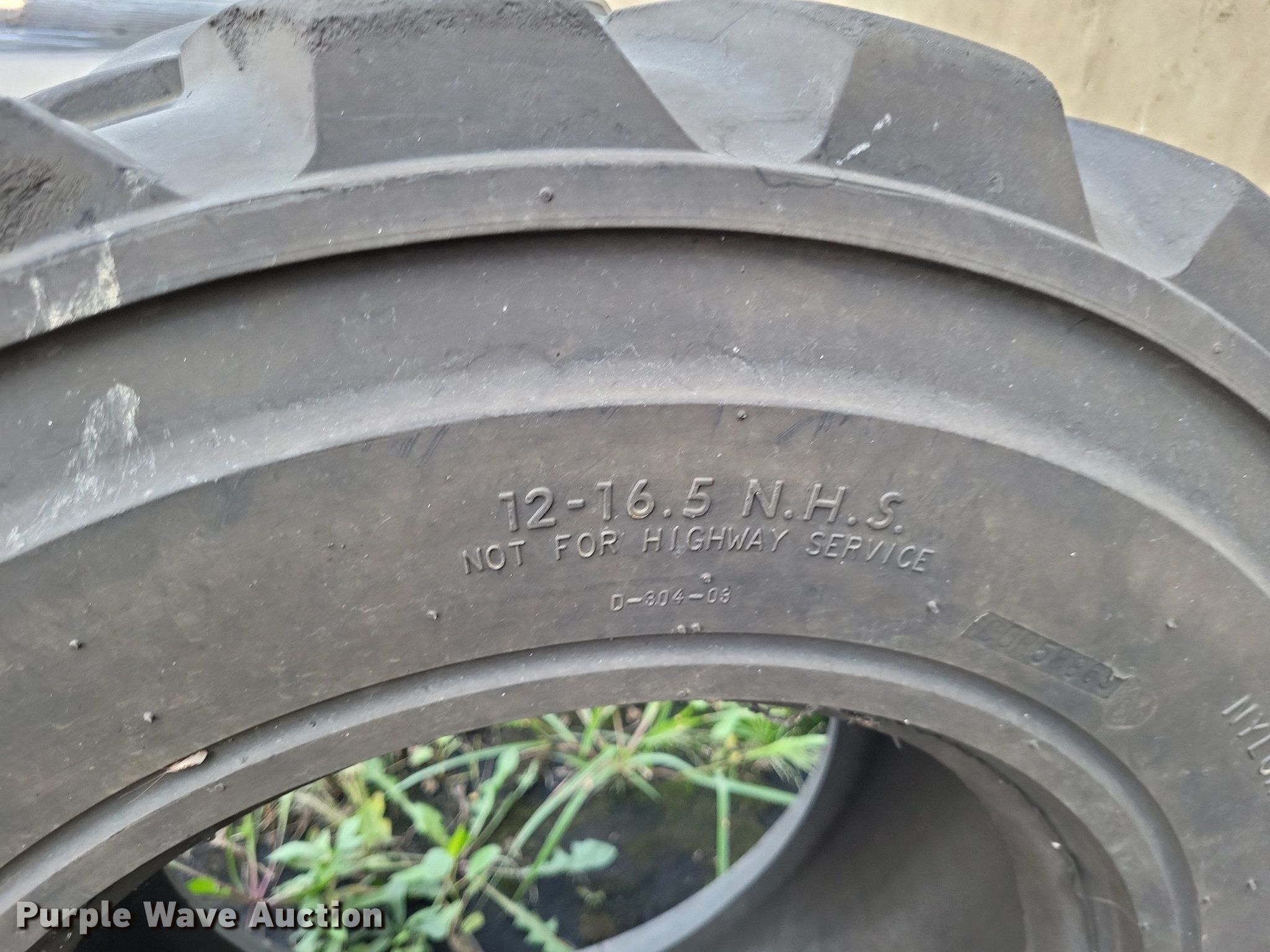 (5) skid steer tires. 12-16.5, (4) skid steer tires and wheels 33x12-20, Solid. Associated Electric Cooperative. 41 Saint Jude Industrial Park. Marston, MO 63866