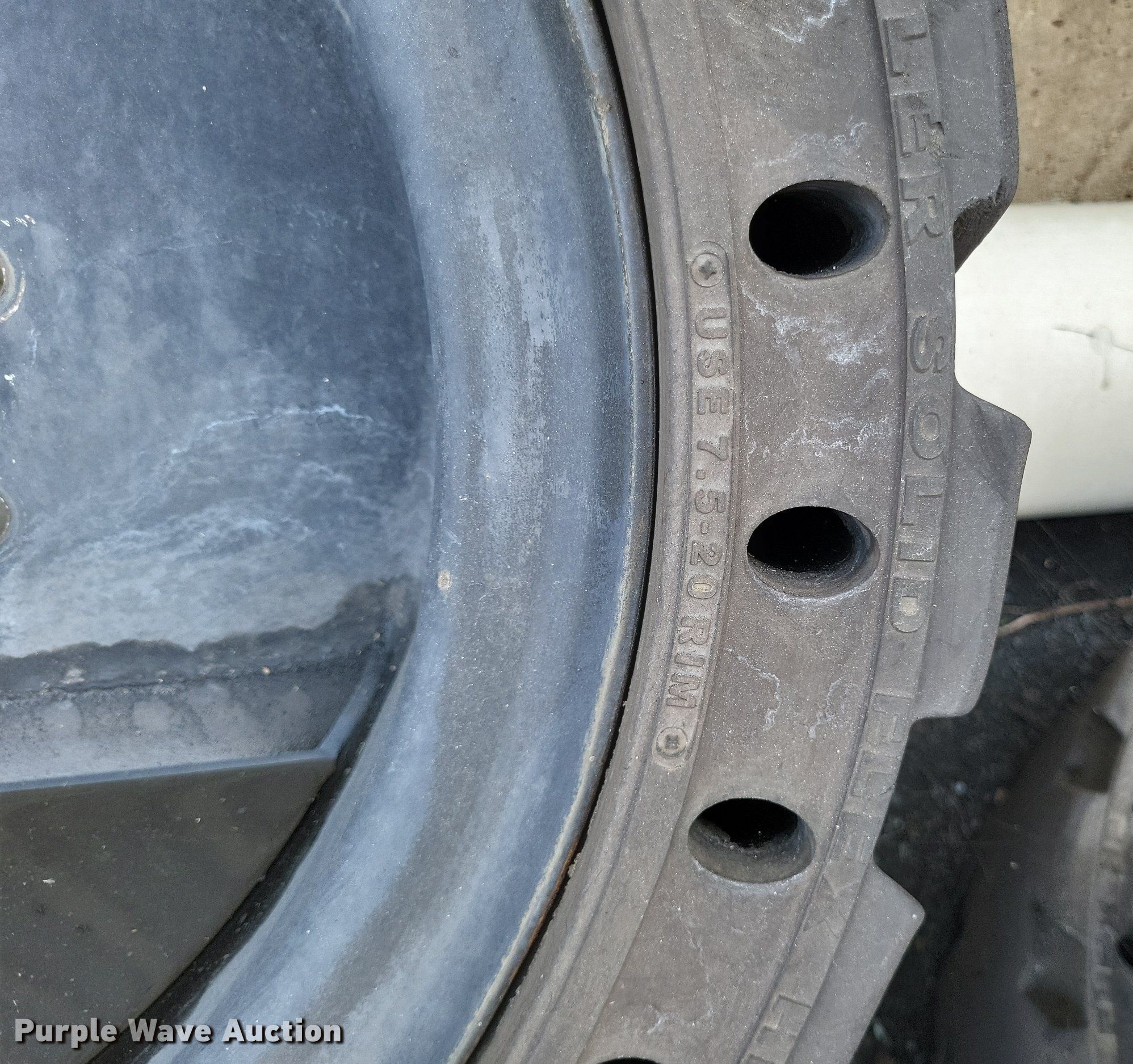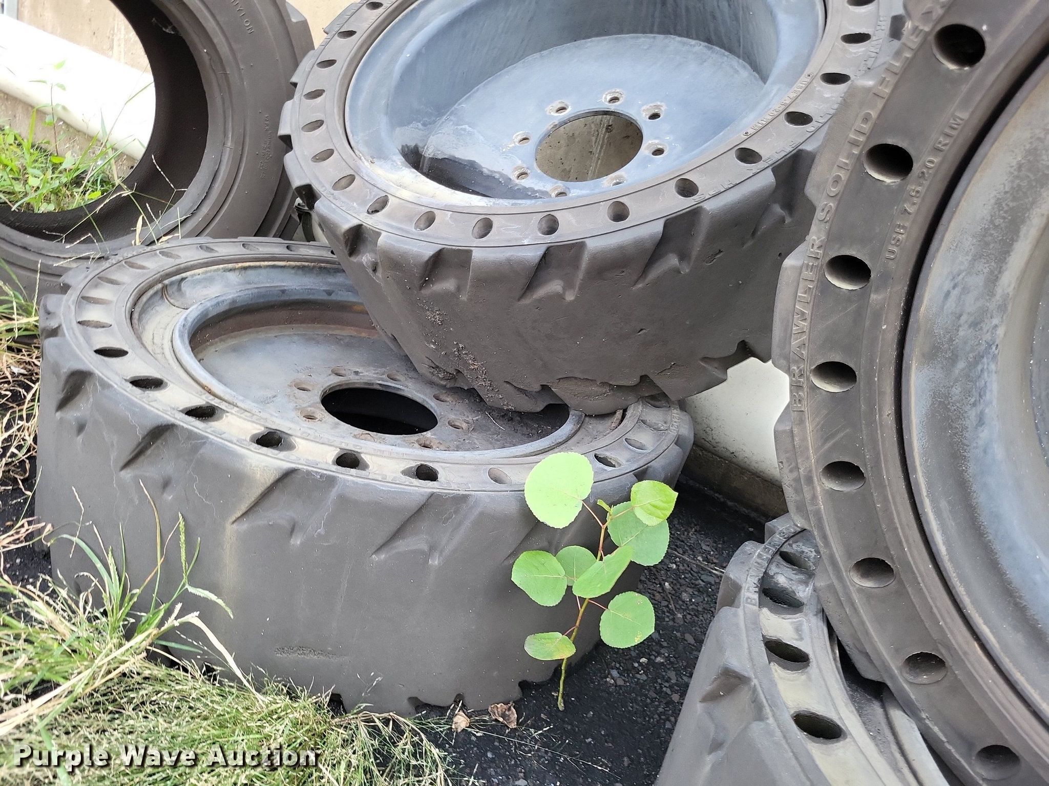 Purple Wave is selling a used Industrial Tires or Tracks in Missouri. This item is a (5) skid steer tires with the following: 12-16.5, (4) skid steer tires and wheels, 33x12-20, Solid
