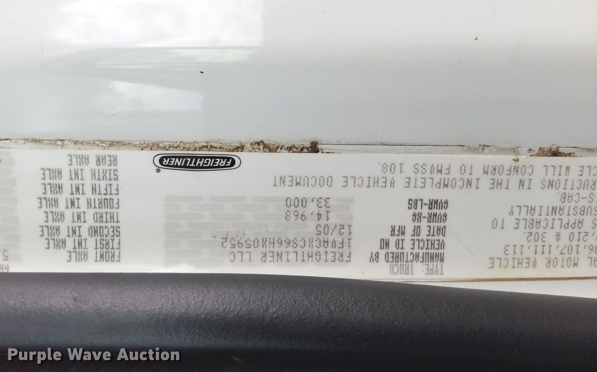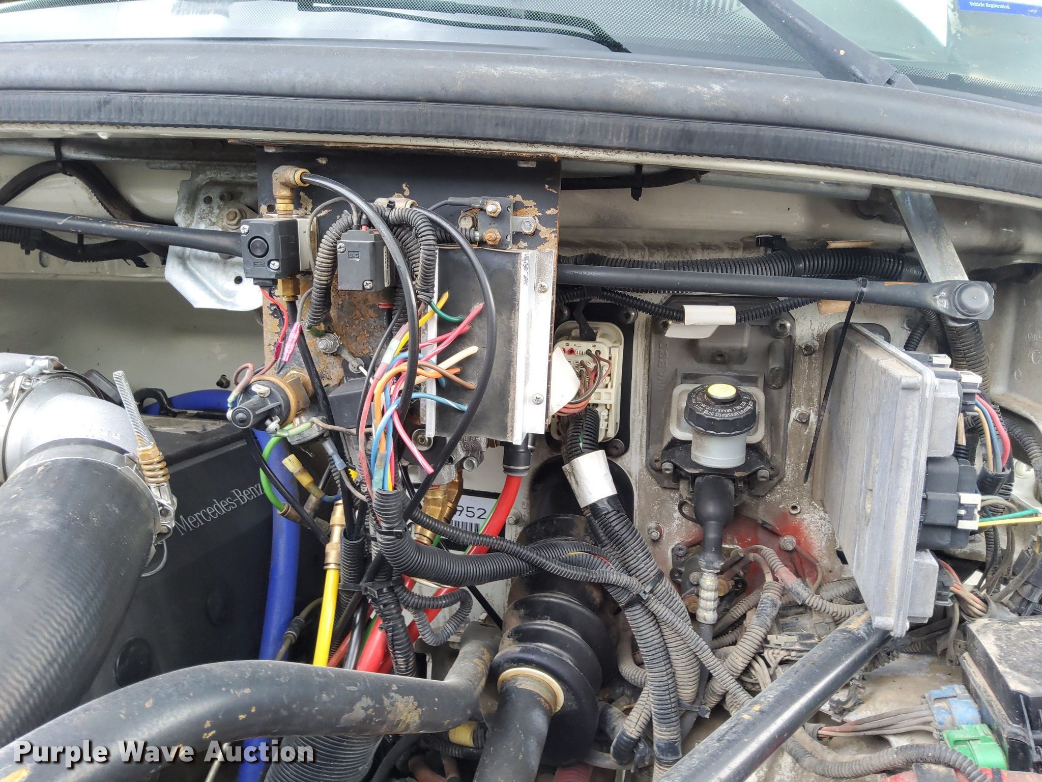 2006 Freightliner M2 106 utility / service truck. Miles: 289,820 on odometer, Hours: 30,072 on meter, VIN: 1FVACXCS66HX05952. Engine Mercedes Benz MBE 900, Displacement: 6.4L, Cylinders: 6, Fuel type: Diesel. Transmission Eaton Fuller, Manual, Speed: 9. Chassis Axles: Single, Suspension: Spring, GVWR: 33,000 lbs. Interior AC, Heat, Cruise control. Features Bed 16' 10" L x 96" W, Crane Palfinger PSC6000, Maximum boom length: 21' Maximum lift capacity: 3,300 lbs.. Tires Size: 11R22.5. Notes Windshield chipped or cracked, Non-operational remote boom controls. Oklahoma title. Title distribution may be delayed up to 14 days from verification of funds. 15107 North 137th East Avenue. Collinsville, OK 74021