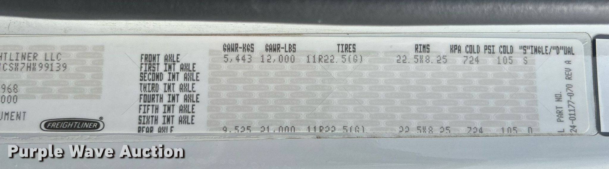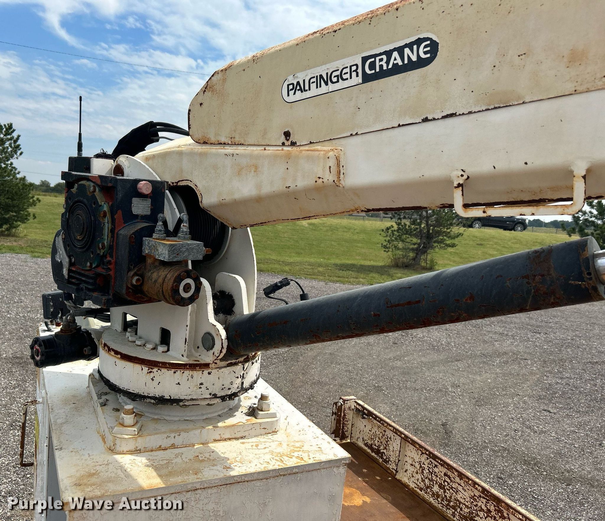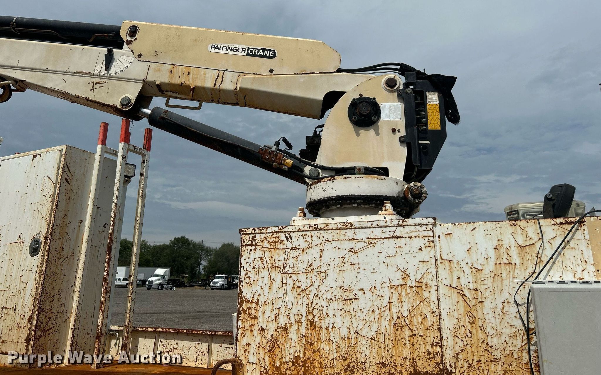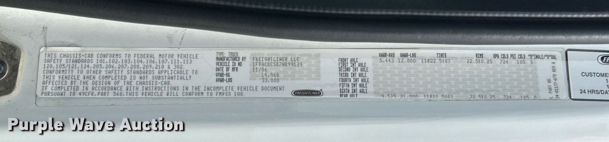 2007 Freightliner Business Class M2 crane truck. Miles: 235,326 on odometer, Hours: 2,432 on meter, VIN: 1FVACXCSX7HX99139. Engine Displacement: 6.4L, Cylinders: 6, Fuel type: Diesel, Engine brake. Transmission Manual. Chassis Axles: Single, Suspension: Spring, Brakes: Air, PTO, GVWR: 33,000 lbs FAWR: 12,000 lbs, RAWR: 21,000 lbs. Interior AC, Heat, Heated mirrors, Cruise control. Features Utility bed 19' 19" L x 96" W, Crane Palanger PSC6000, Boom Telescopic, Maximum boom length: 21' Sections: 2, Maximum lift capacity: 3,300 lbs, Boom controls Ground, Lift chart. Tires Size: 11R22.5. Notes Windshield chipped or cracked. Oklahoma title. 15107 North 137th East Avenue. Collinsville, OK 74021