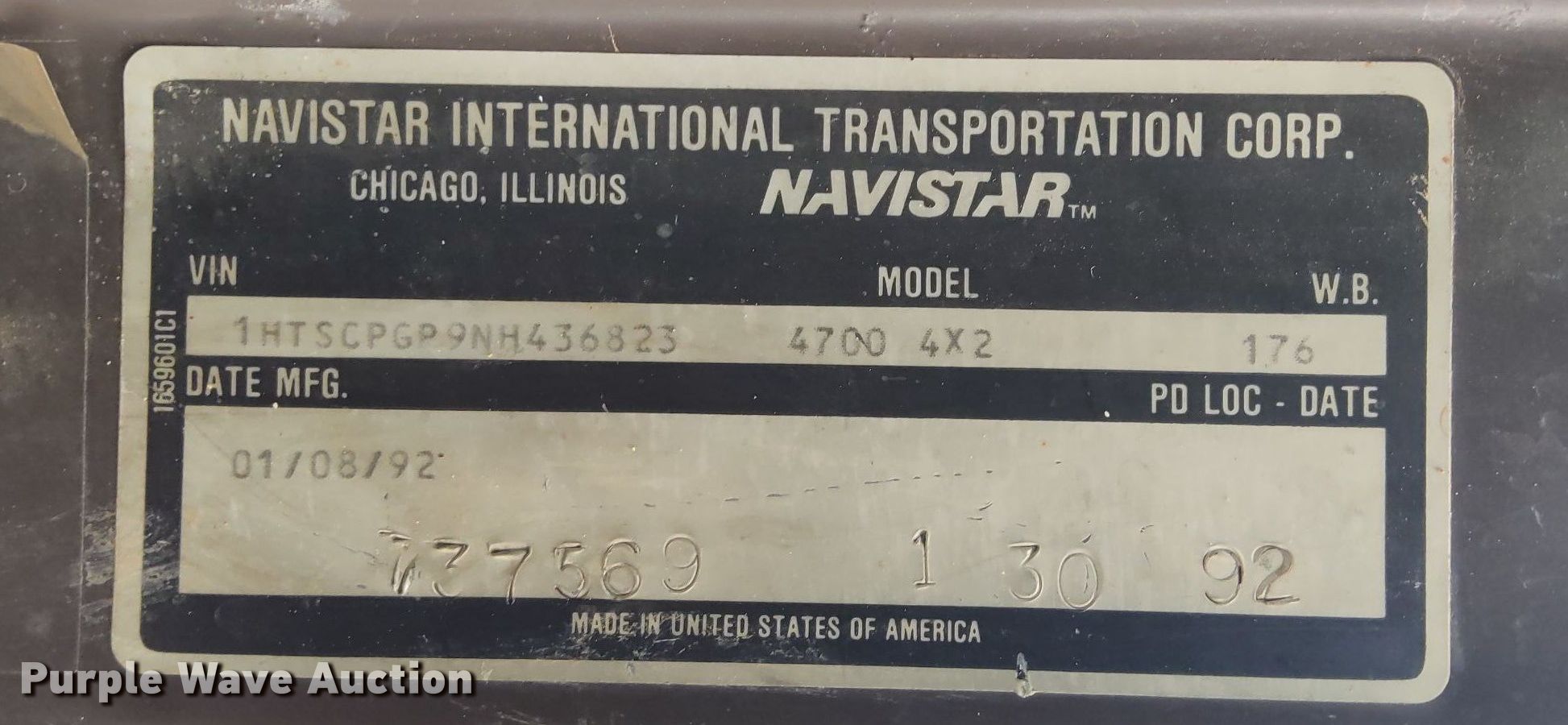 1992 International 4700 digger derrick truck. Miles: 60,592 on odometer, VIN: 1HTSCPGP9NH436823. Engine Displacement: 5.9L , Cylinders: 6, Fuel type: Diesel. Transmission Manual, Speed: 5, plus 2. Chassis Axles: Single, Suspension: Spring, Brakes: Hydraulic, PTO. Interior Heat. Features Bed Hi-Ranger HRL102, Serial: 39224, 14' 4" L x 93" W, Boom Boom controls, Material handler, Pole guide, Auger Diameter: 18".. Tires Size: 11R22.5. Oklahoma classic title. 15107 North 137th East Avenue. Collinsville, OK 74021