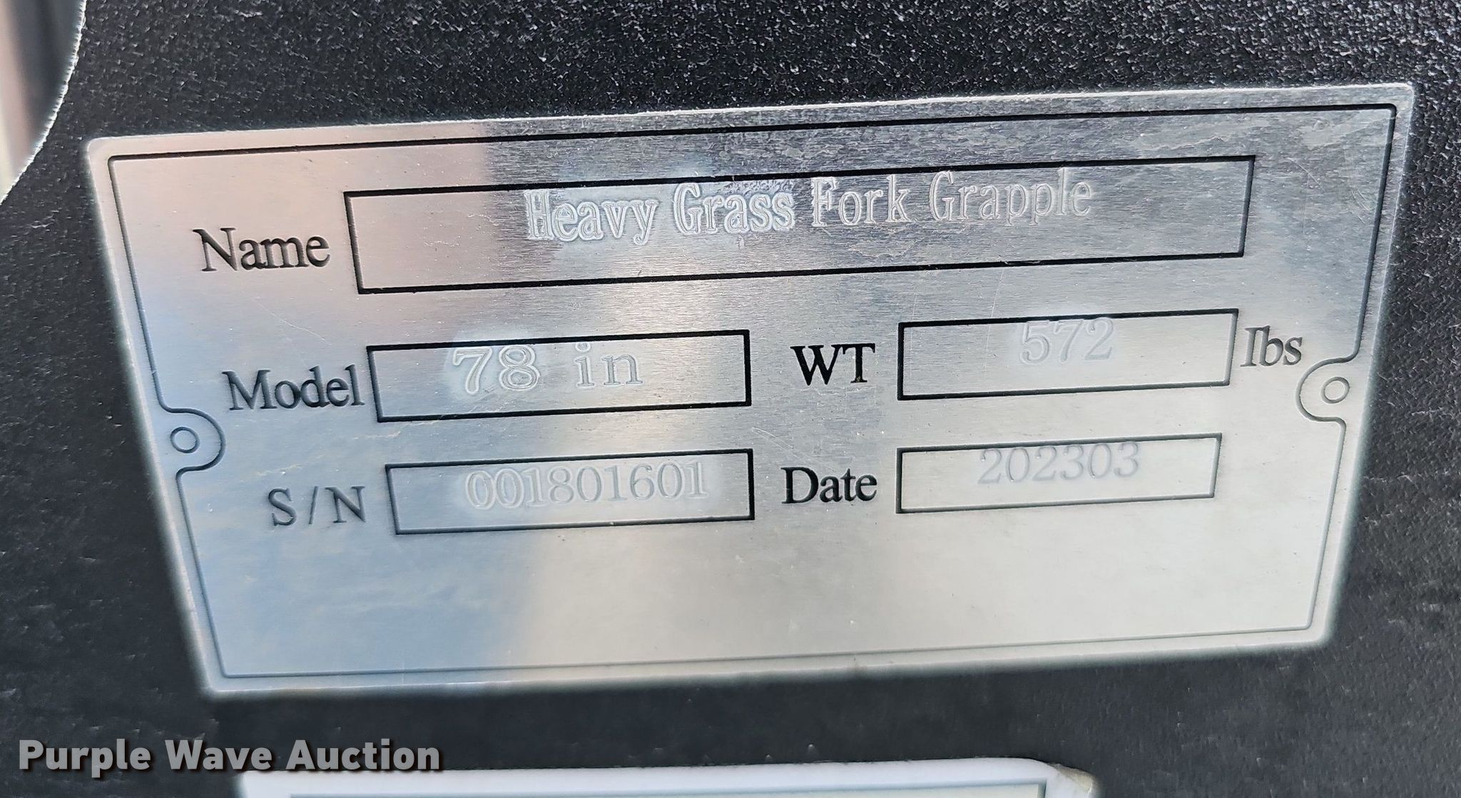 2023 Heavy Grass Fork Grapple 78 in skid steer root grapple bucket. Serial: 001801601, Width: 78", Teeth: Bolt-on (8) teeth, Unused. Jordan Machinery / S & N Auto Sales. 25050 U.S. 275. Waterloo, NE 68069