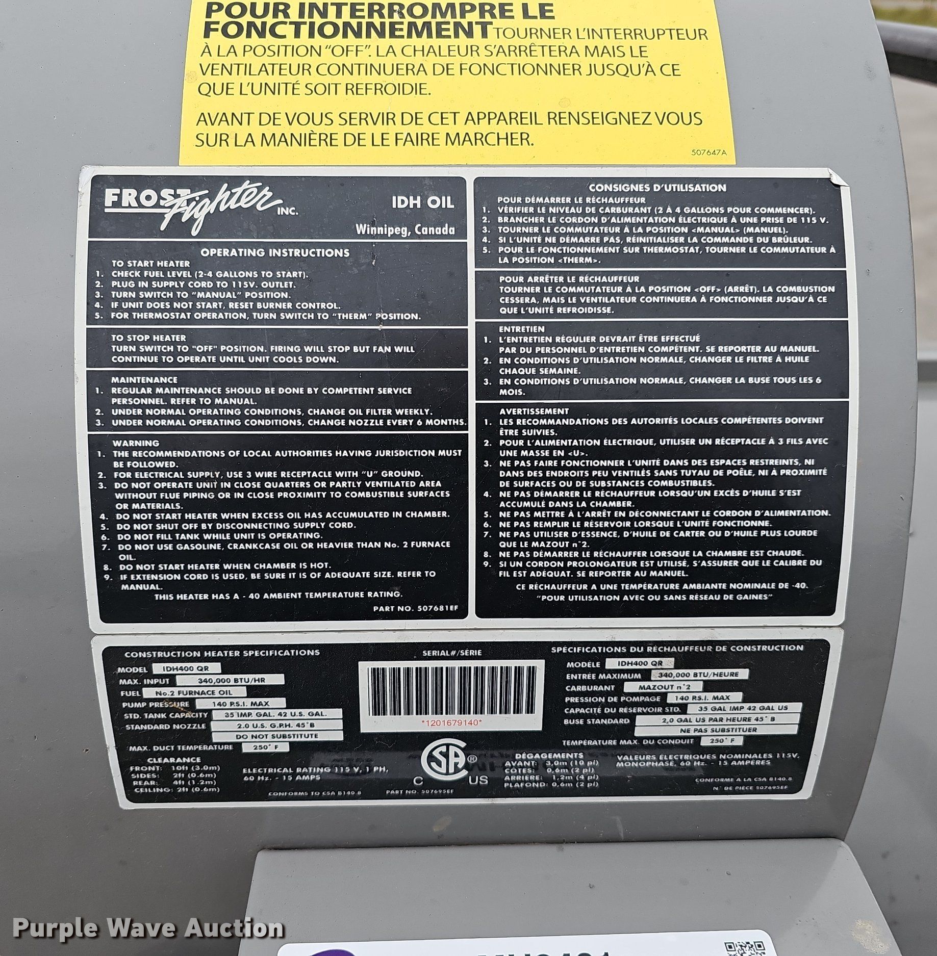 Intertek Frost Fighter Inc IDH400 QR heater. Serial: 1201679140. Electric Motor Volts: 115, Phase: Single. Features 6' L x 28" W x 89" H, Fuel: No. 2 furnace oil, Capacity: 42 gallon, BTU: 340,000. Jordan Machinery / S & N Auto Sales. 25050 U.S. 275. Waterloo, NE 68069