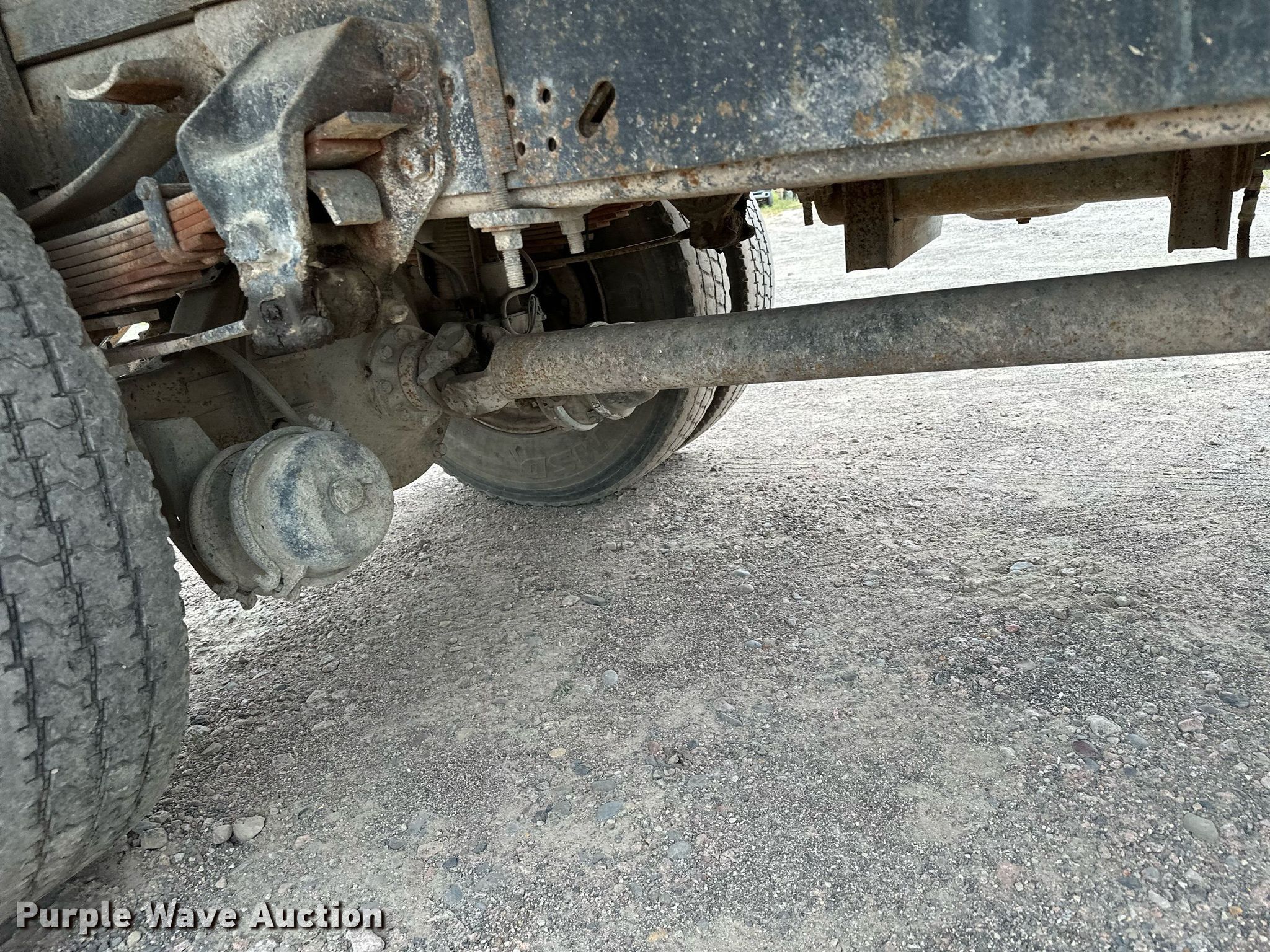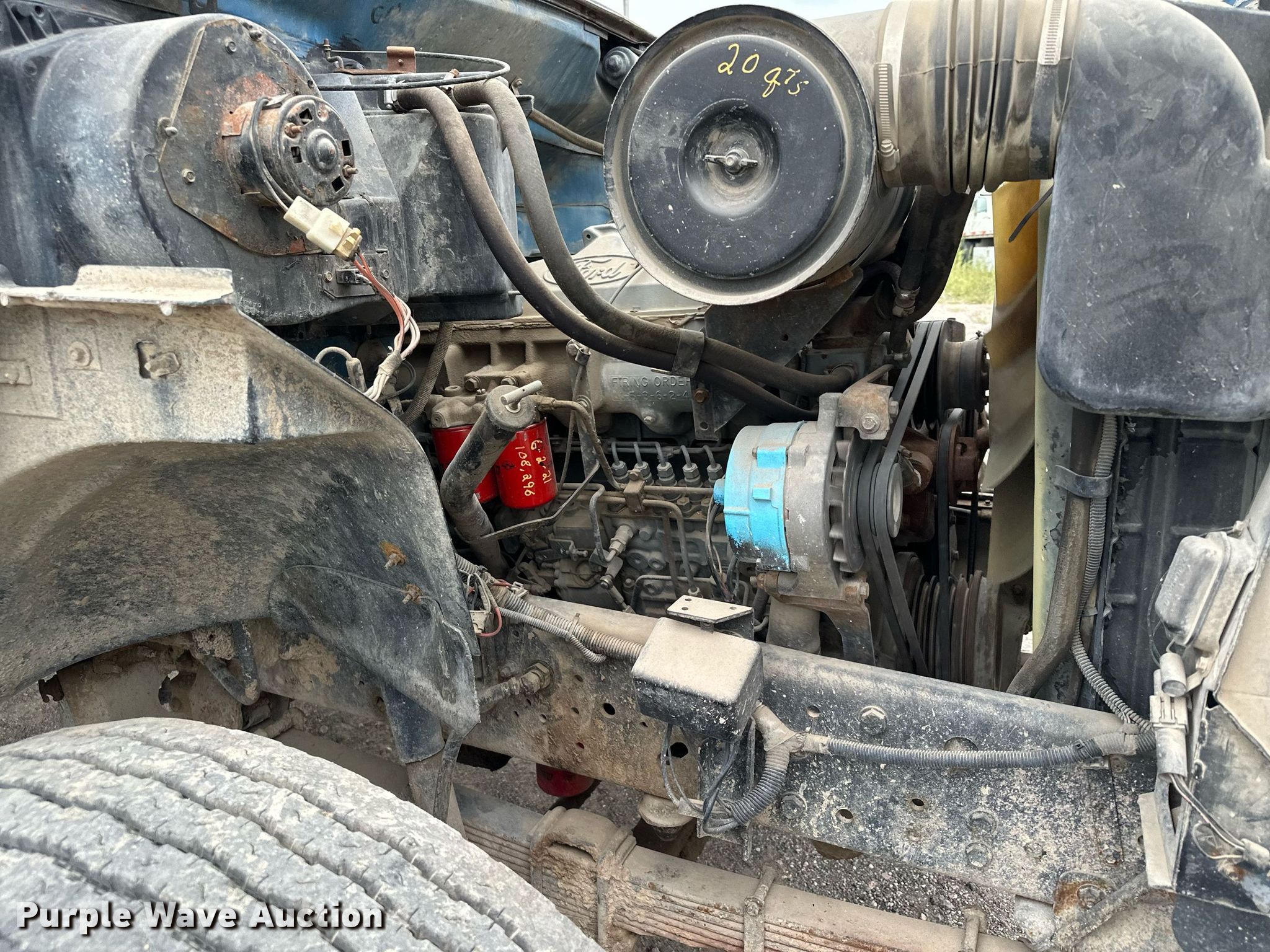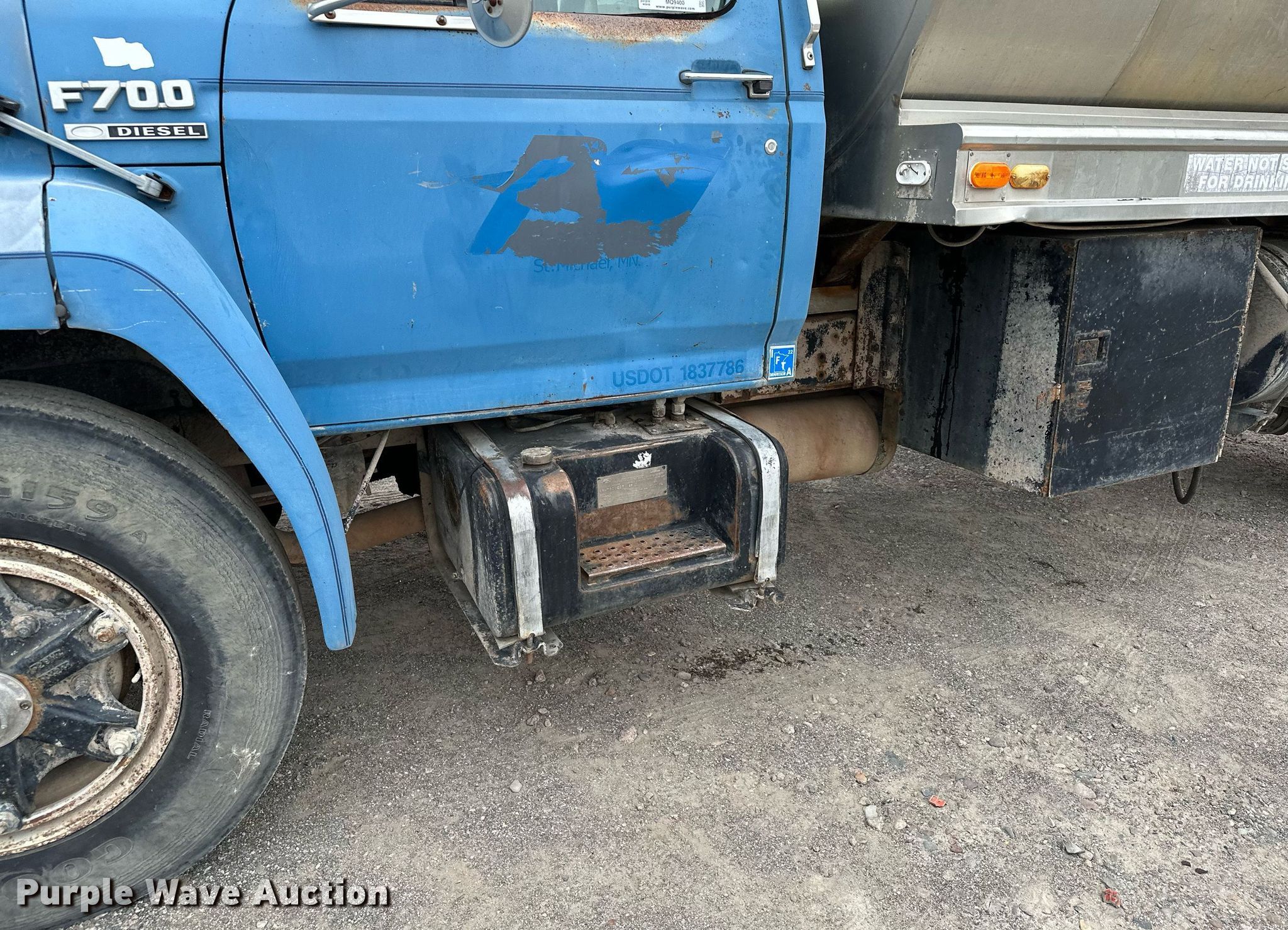 1990 Ford F700 water truck. Miles: 108,323 on odometer, VIN: 1FDXK74A0LVA11555, Unit #: 52-136. Engine Displacement: 7.8L, Cylinders: 6, Fuel type: Diesel. Transmission Manual, Speed: 5. Chassis Axles: Single, Suspension: Spring, Brakes: Air, GVWR: 30,000 lbs, Wheelbase: 189". Interior Heat, Brake controller. Features Bed / tank 11' 5" L x 96" W, Top fill, Sight tube, Rear drain: 2", Rear outlet: 2-3". Tires Size: 11R22.5. Minnesota title. Title distribution may be delayed up to 14 days from verification of funds. PCI Roads, LLC. 14123 42nd Street Northeast. St. Michael, MN 55376