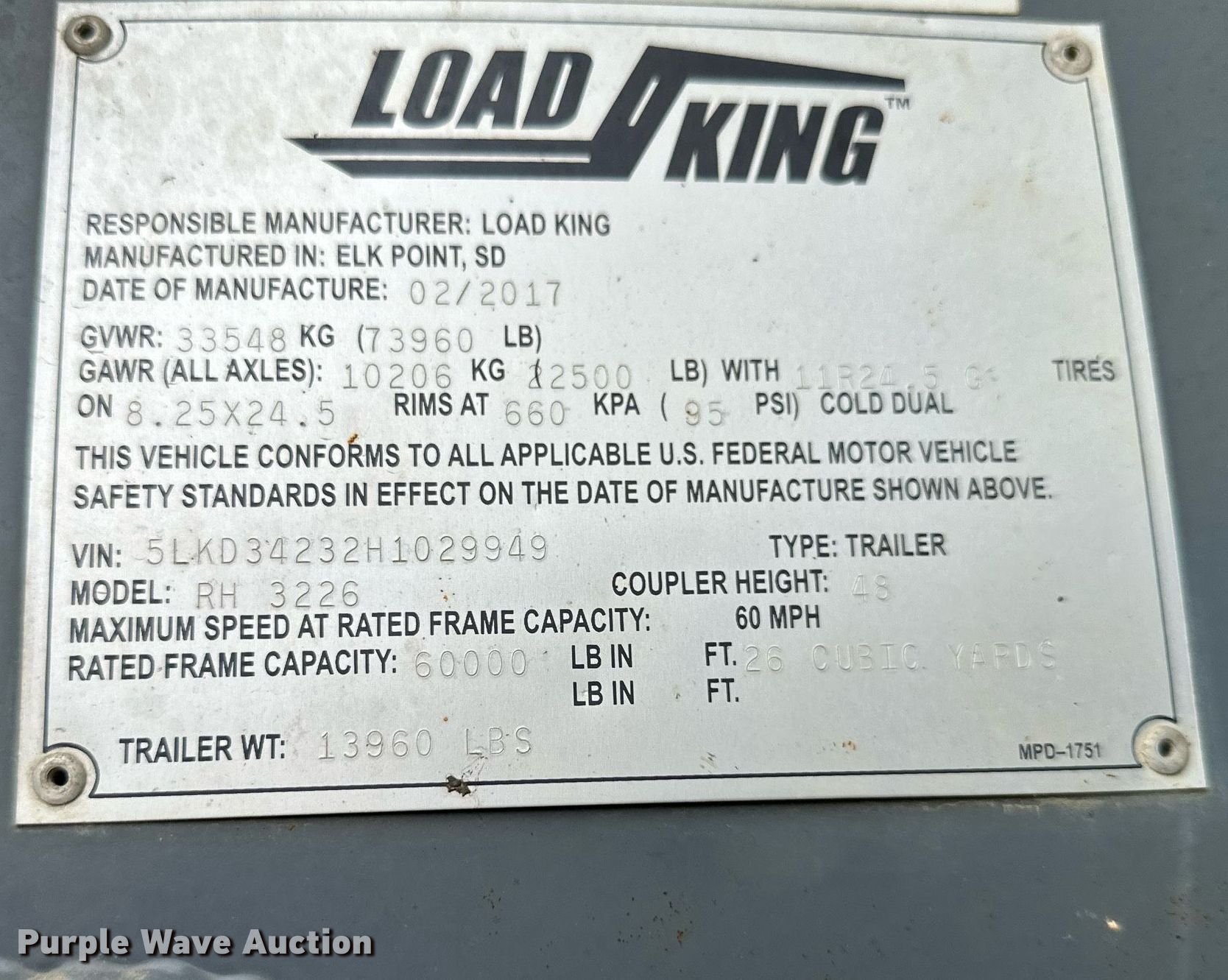 Purple Wave is selling a used End Dump Rock Trailer in Kansas. This item is a 2017 Load King RH3226 end dump trailer with the following: VIN: 5LKD34232H1029949