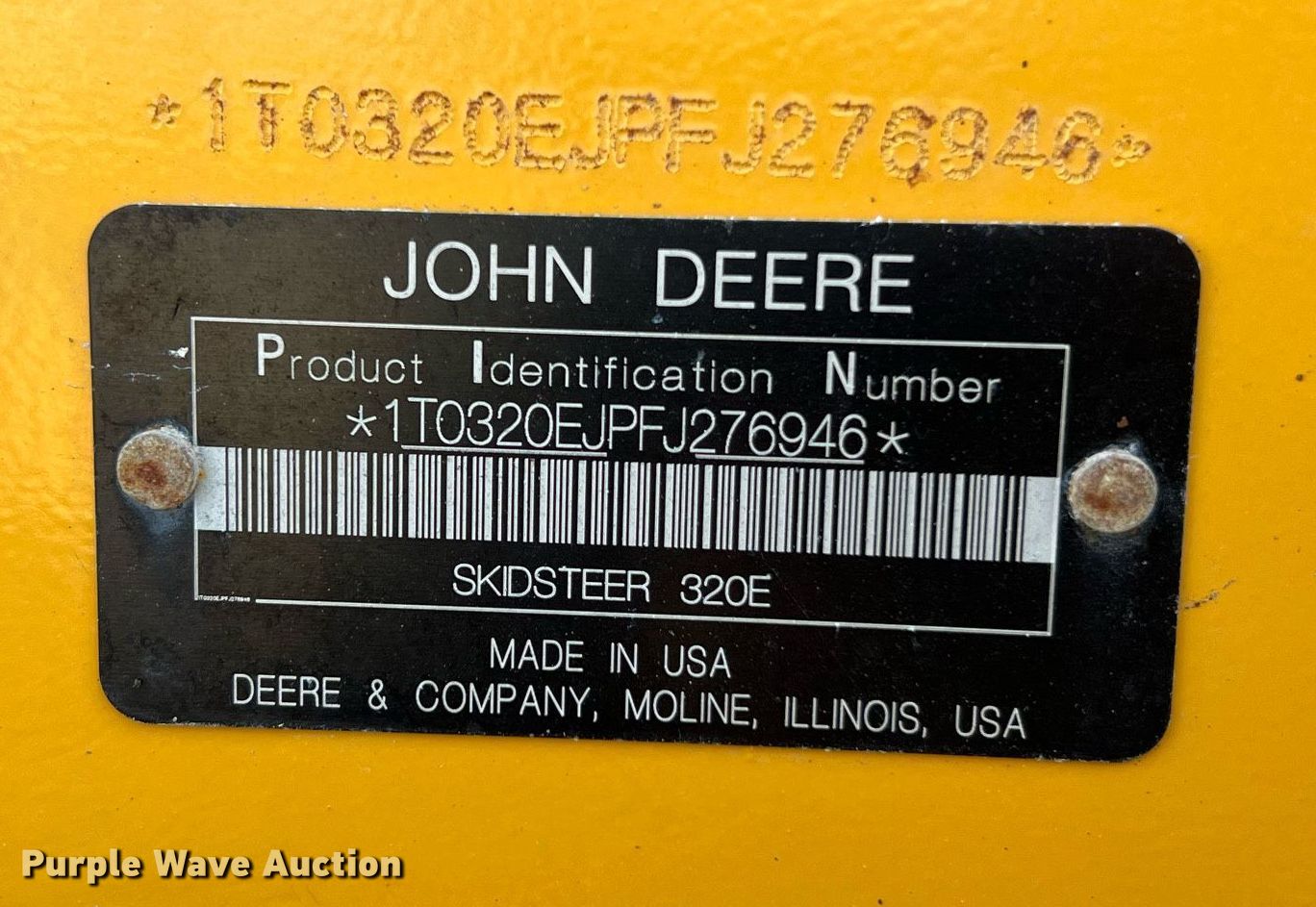 Purple Wave is selling a used Skid Steer Loader in Missouri. This item is a 2015 John Deere 320E skid steer loader with the following: Hours: 1,767 on meter, Serial: 1T0320EJPFJ276946, Unit #: 1