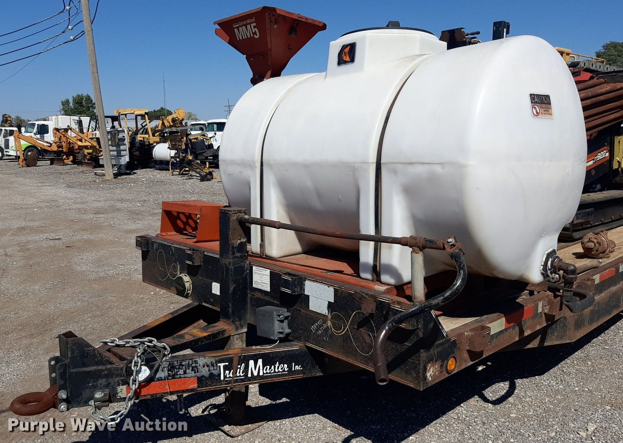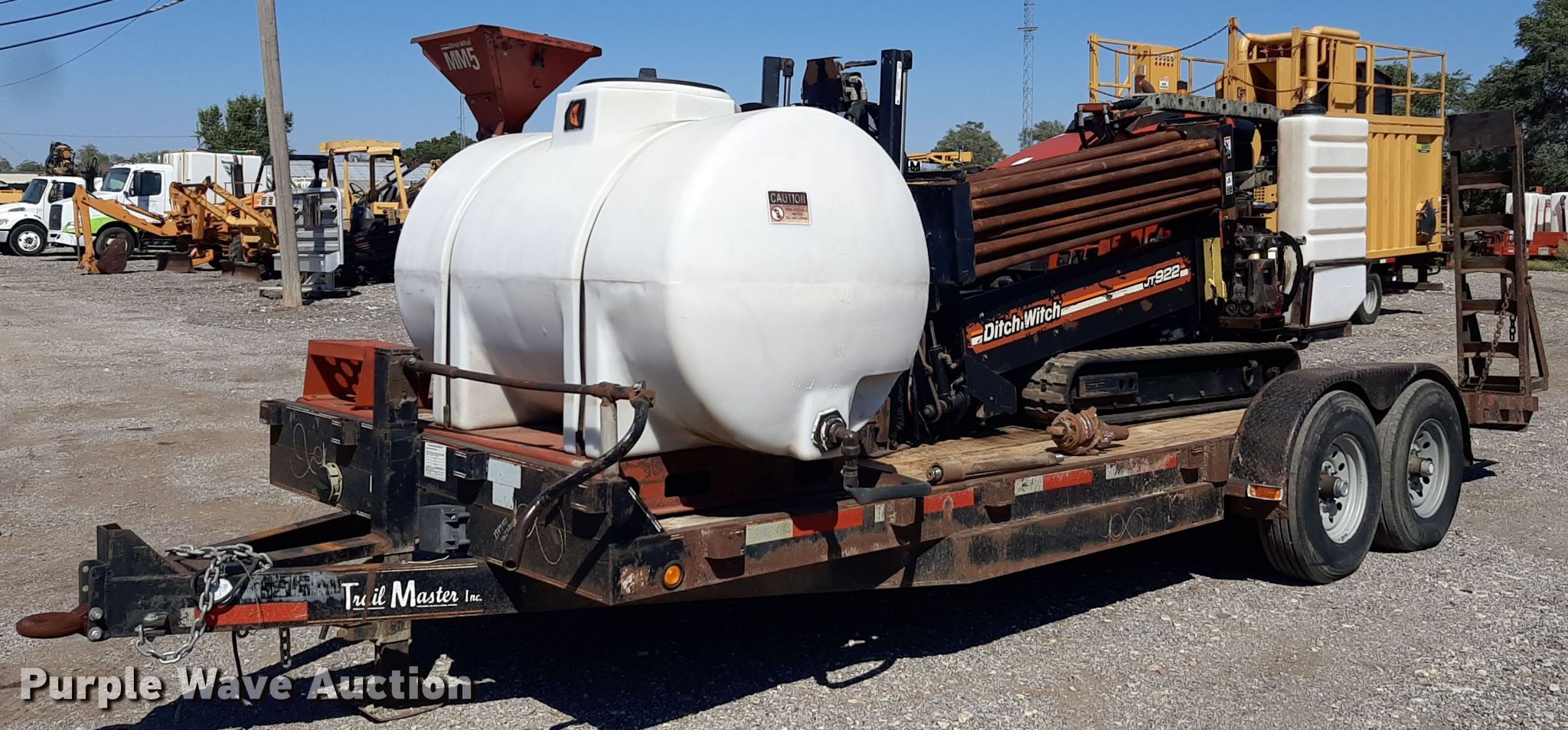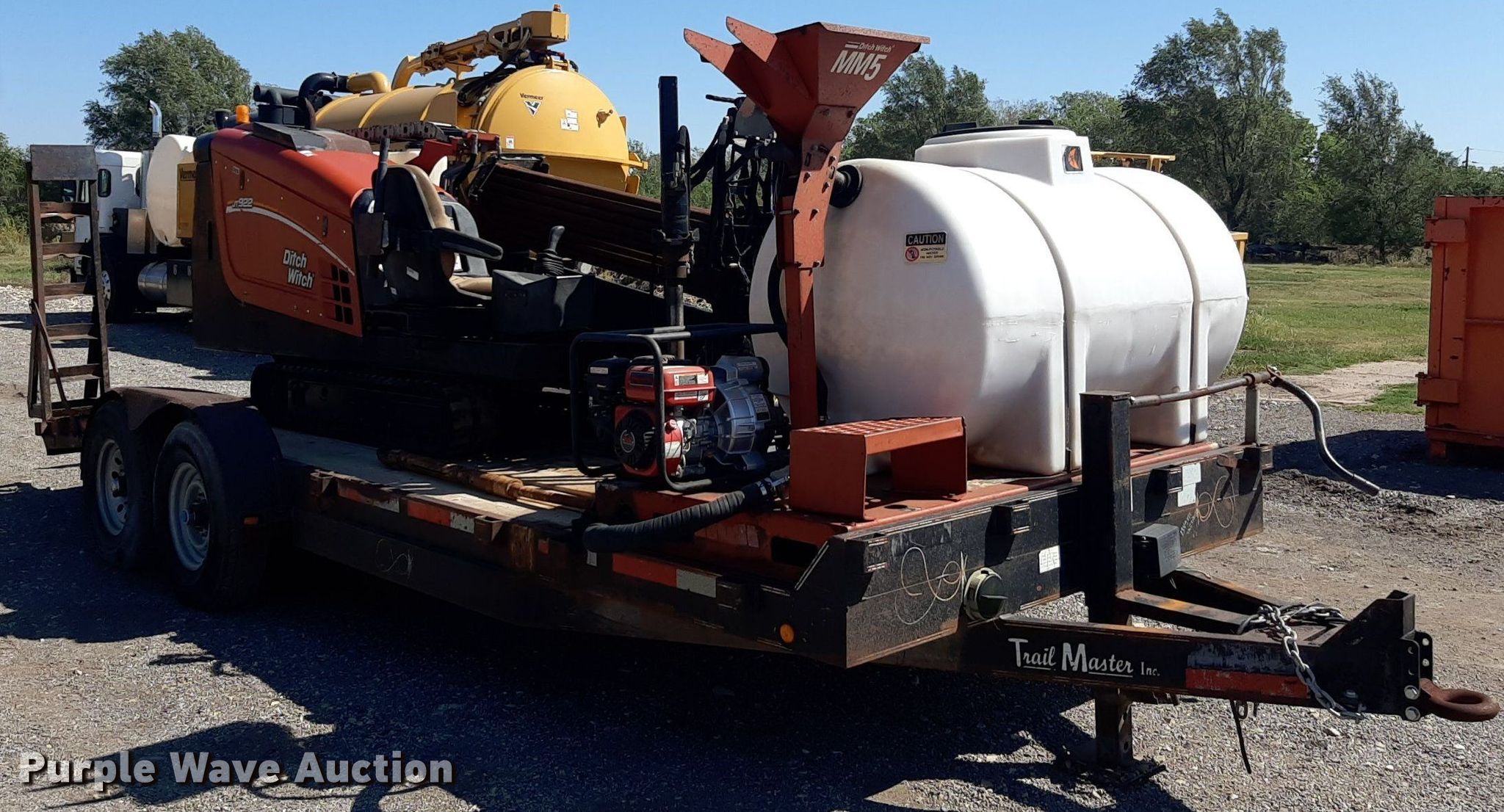 2012 Ditch Witch JT922 directional boring unit. Hours: 3,579 on meter, Serial: CMWJT922EC0000671. Engine Cylinders: 4, Fuel type: Diesel. Features Water pump Bean, GPM: 15, On board water capacity: 50 gallons, Drill stems On drill: 51, Drill stem length: 6', Drill head assembly, Transition rod, Ditch Witch MM5 mud mixer Predator 212 cc trash pump , Inlet/outlet: 3", Poly tank capacity: 300 gallons. Tracks Width: 9", Rubber. Trailer 2006 Trail Master, VIN: 5BEBU20256C140001, Overall length: 24' 102", Axles: Tandem, Tire size: 225/90R16. Notes Dead battery. Texas title. Seller is a licensed motor vehicle dealer. The buyer may be required to pay sales tax and/or registration fees to the dealer prior to taking possession. Title will be assigned and distributed by the dealer. Please contact the seller for distribution questions. Source: HDD. 1816 E. Wasp Road. Hutchinson, KS 67501