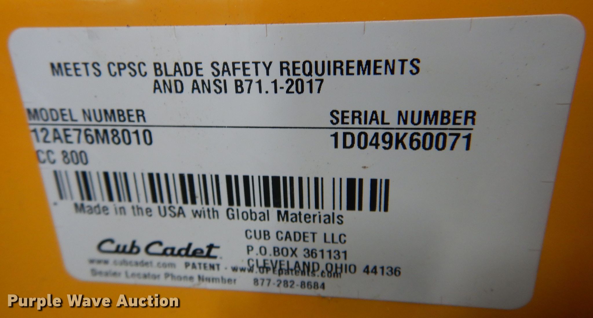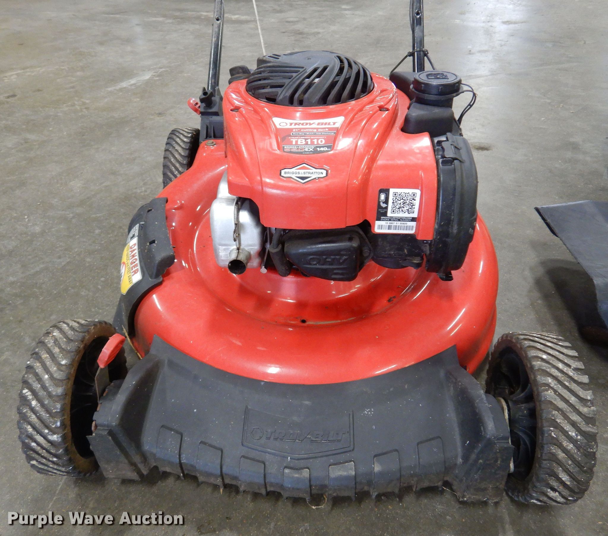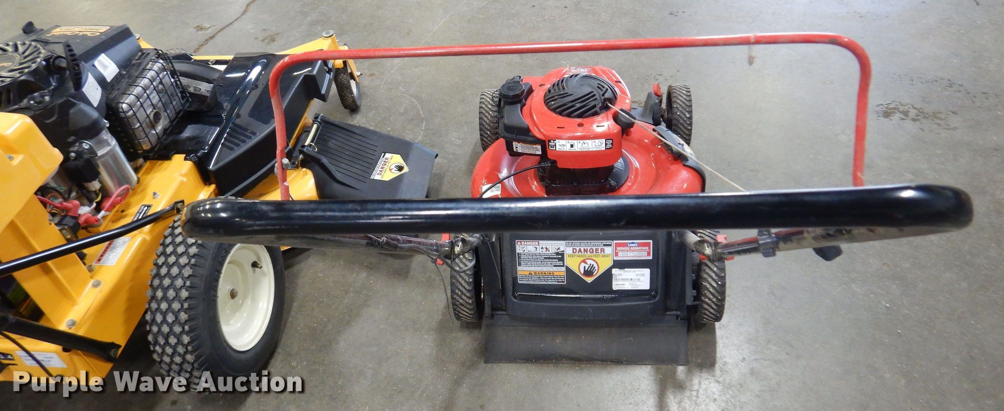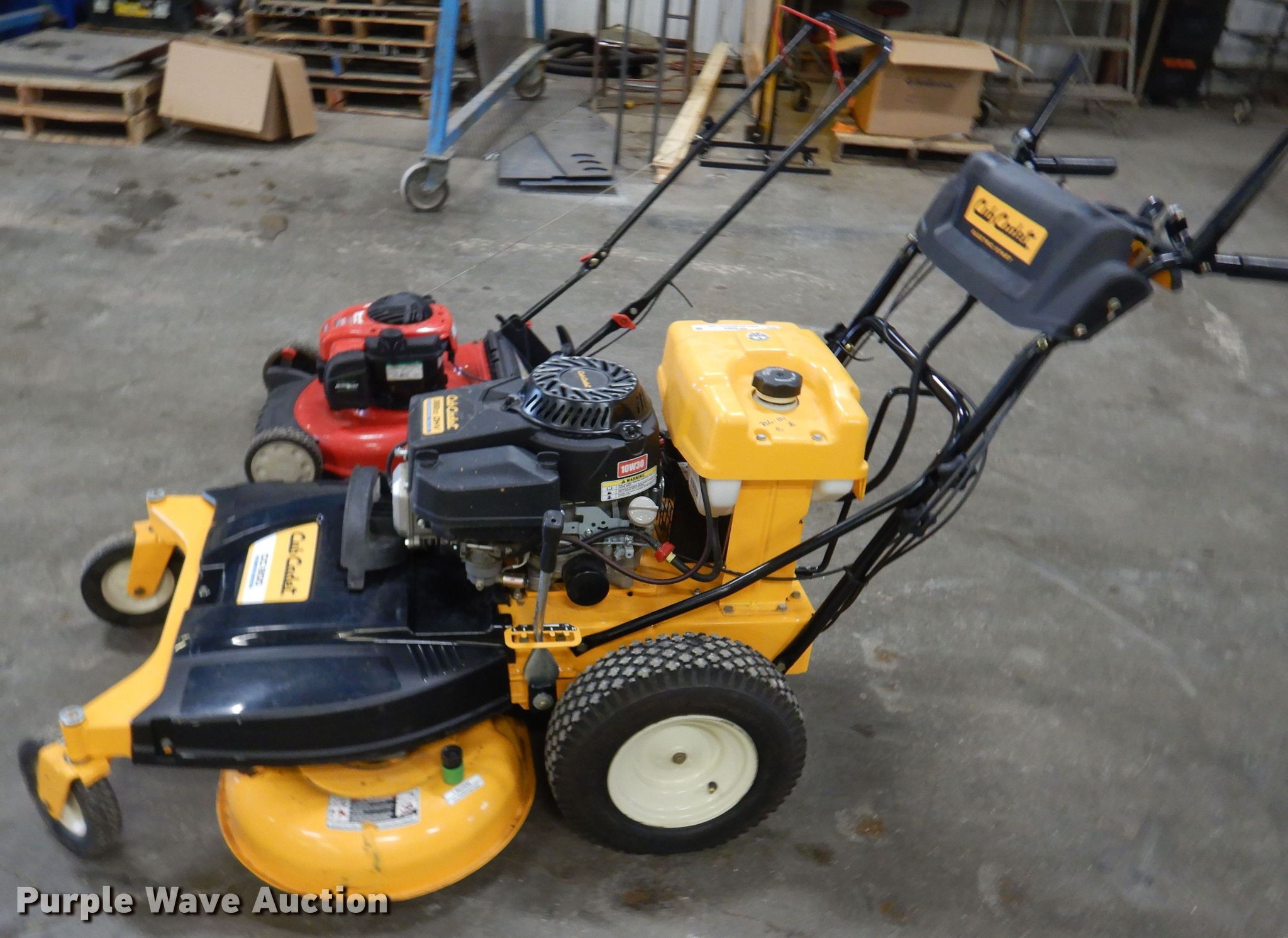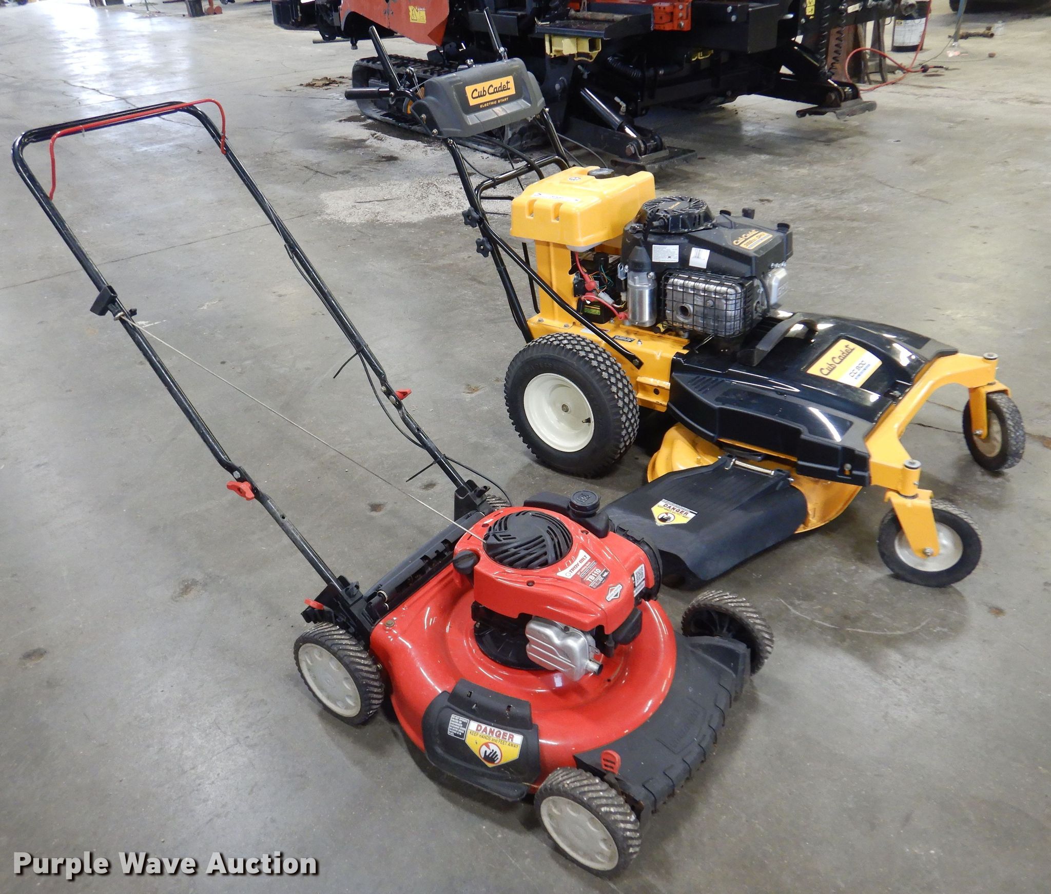Purple Wave is selling a used Lawn Mower in Kansas. This item is a (2) push lawn mowers with the following: 2017 Cub Cadet CC800, Serial 1D049K60071, Self-propelled, Cutting width: 33", Walk behind, Tires, Front: 8", Rear: 4.80-8,, 2003 Troy Bilt, Serial #1B114KF0933, Model: TB110, Cutting width: 21", Tires, Front: 7", Rear: 8",