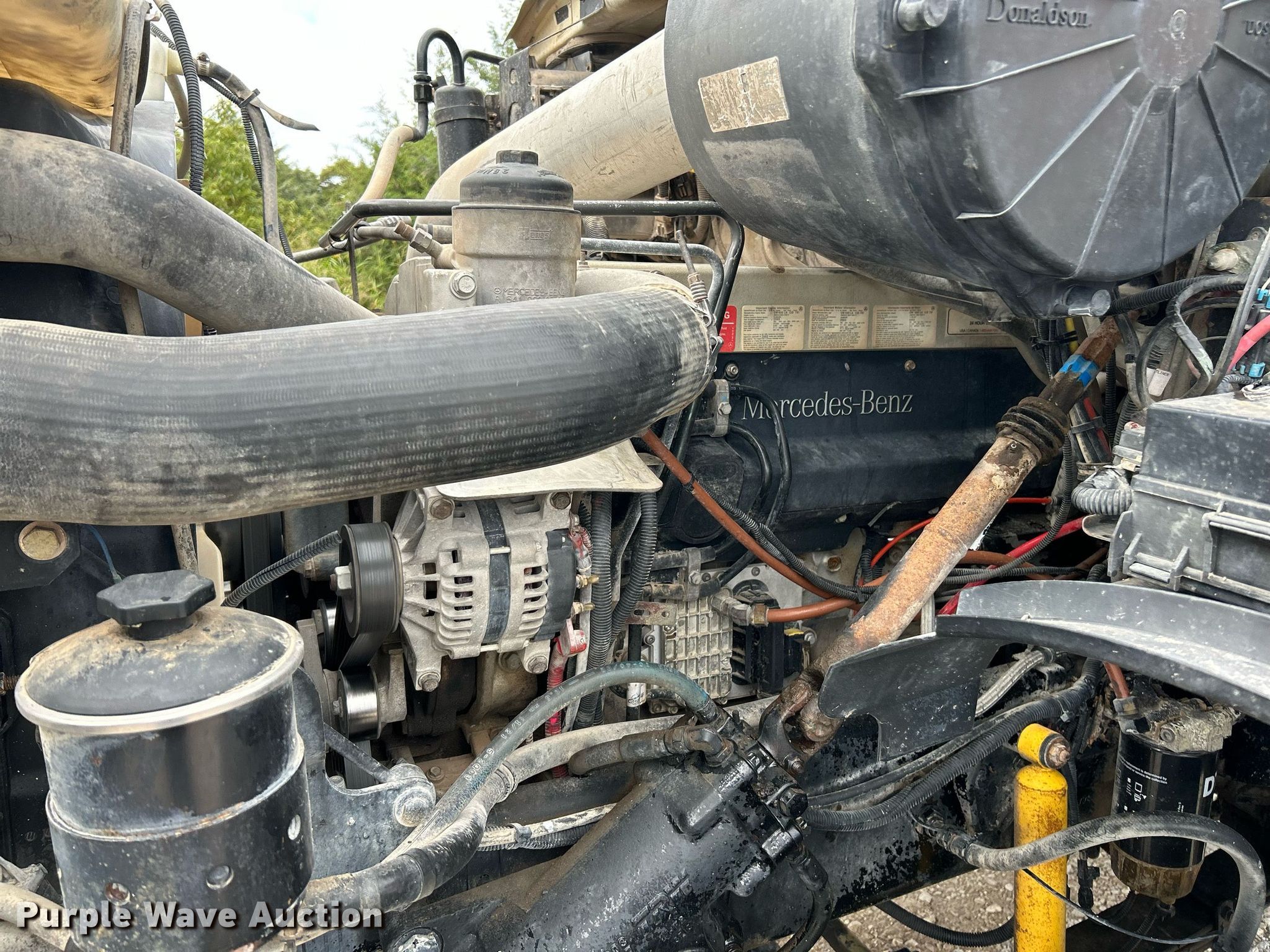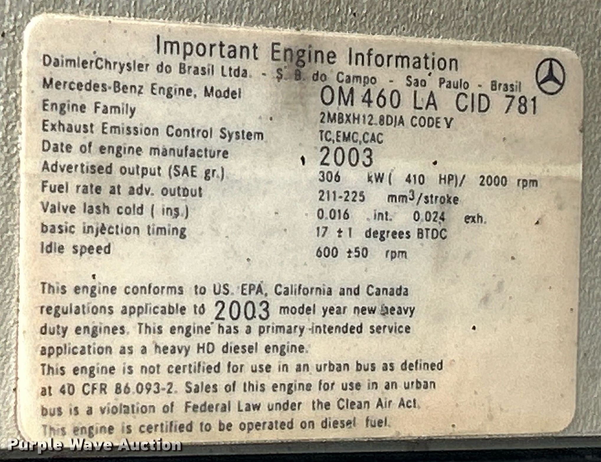 2004 Sterling L9500 dump truck. Miles: 448,077 on odometer, Hours: 120,090 on meter, VIN: 2FZHAZCV74AM57008. Engine Mercedes Benz OM 460 LA CID 781, Displacement: 12.8L, Cylinders: 6, Fuel type: Diesel, Engine brake. Transmission Model: Roadranger RT/RTO-8LL, Manual. Chassis Double frame, Axles: Tandem, Differential lock: Inter-axle, Suspension: Spring over walking beam, Brakes: Air, PTO, GVWR: 66,000 lbs FAWR: 20,000 lbs, IAWR: 23,000 lbs, RAWR: 23,000 lbs. Interior AC, Heat, Heated mirrors, Cruise control. Features Dump bed 15' L x 96" W, Side height: 52", Bed type: Steel, Roll tarp, Ram: Single , End gate: Air operated. Tires Size: 425/65R22.5. Notes Windshield chipped or cracked. Missouri Title. Rogers Backhoe. 1282 Flatwoods Rd. Rogersville, MO 65742