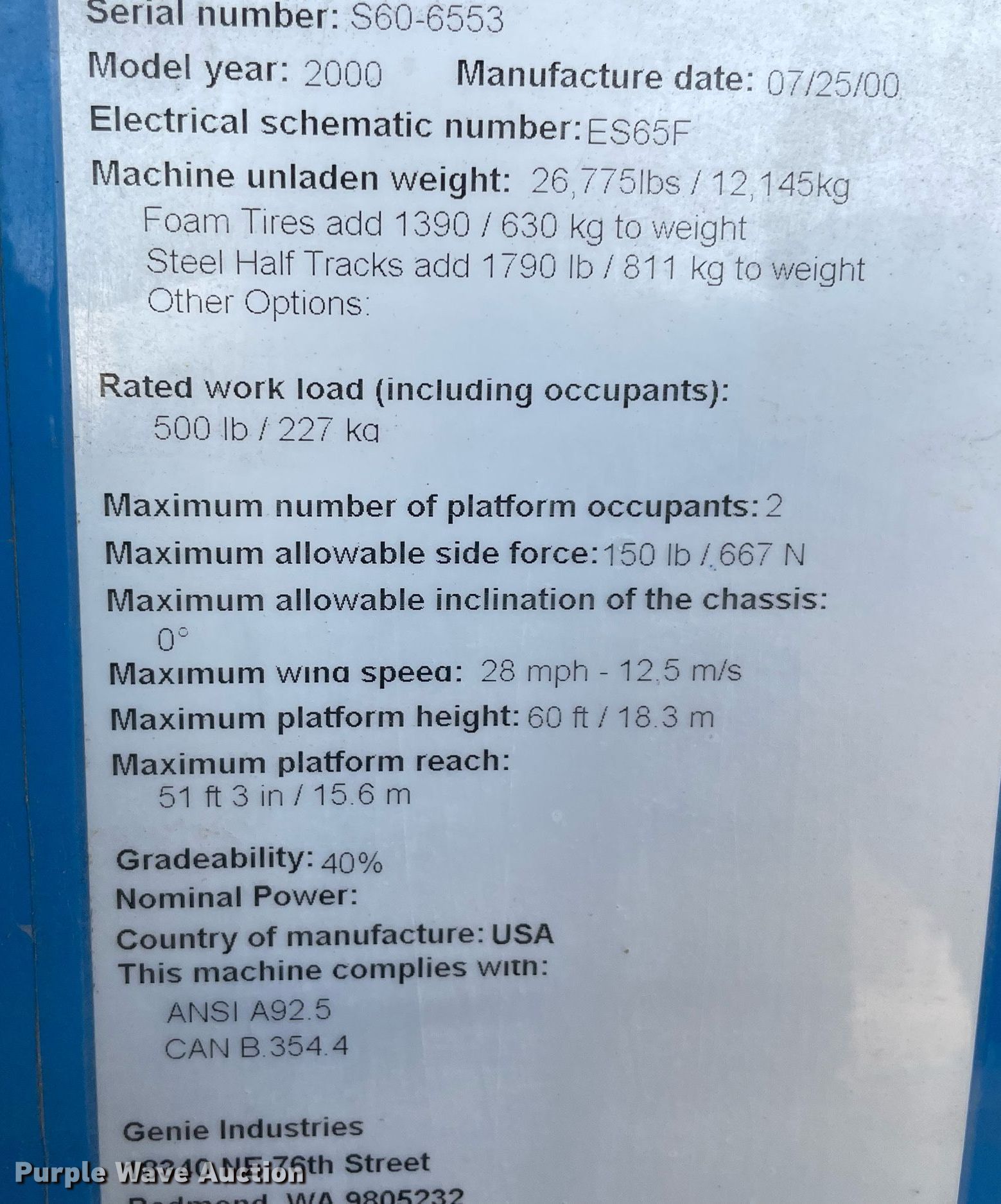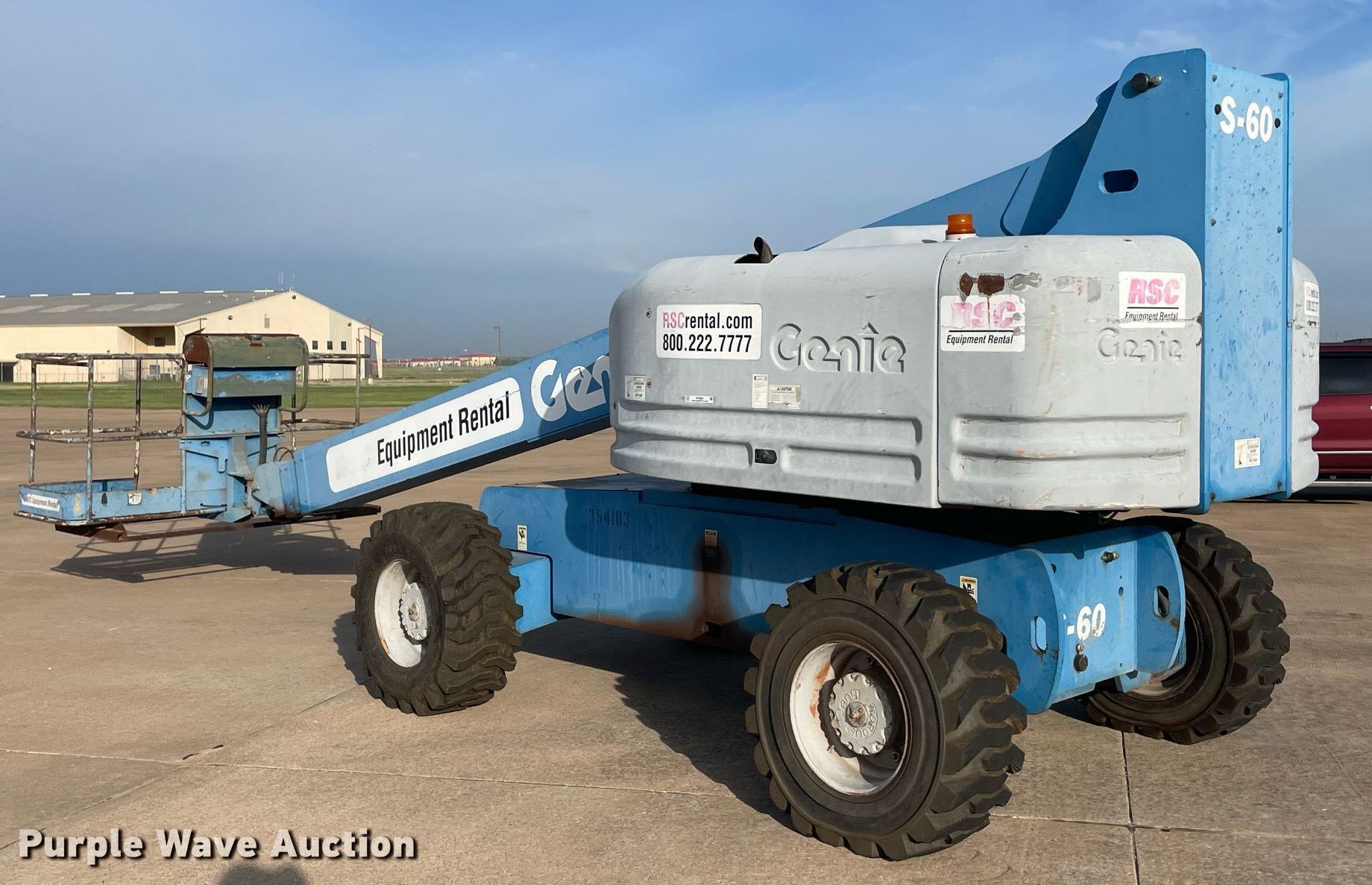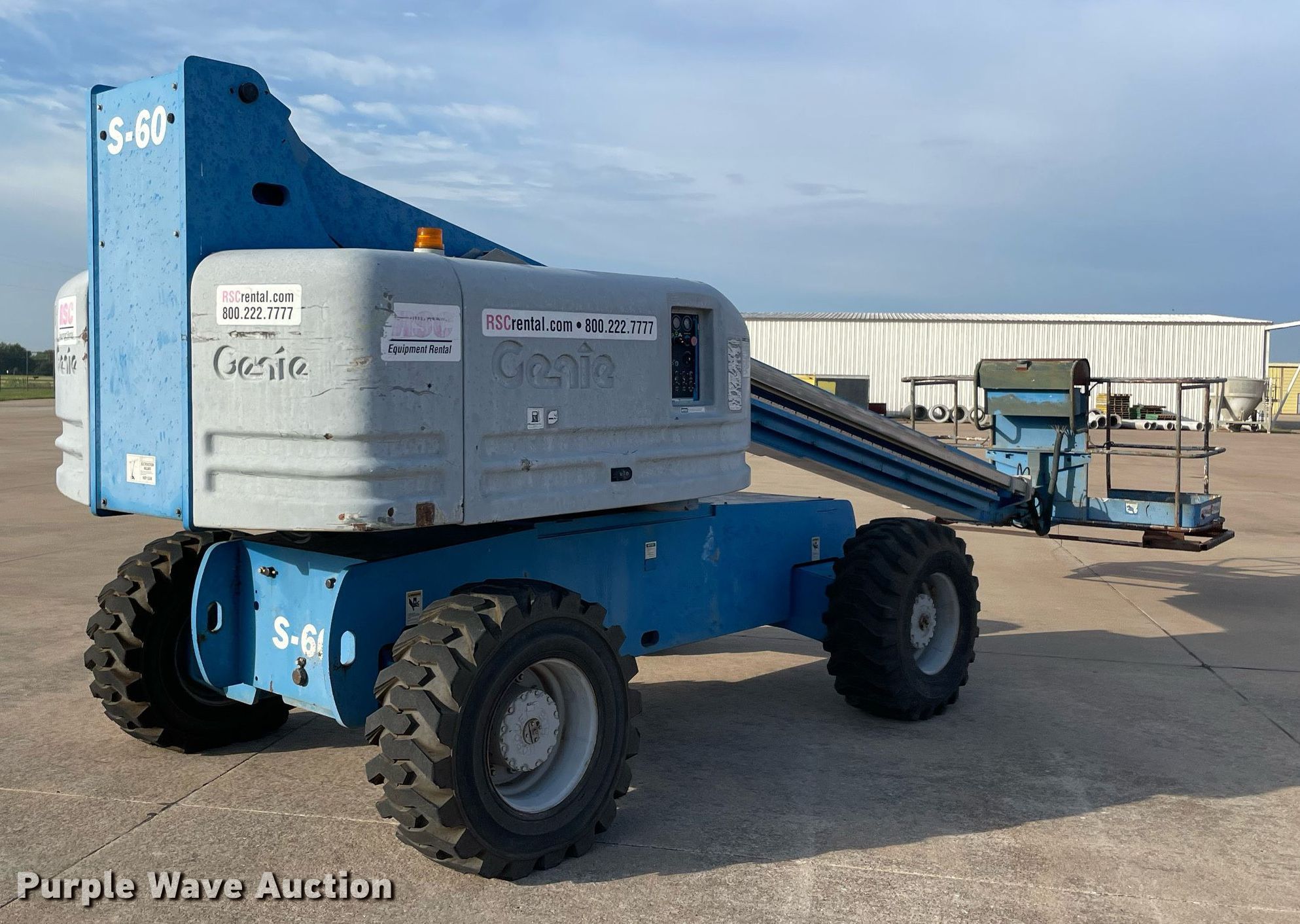 Purple Wave is selling a used Boom Lift in Oklahoma. This item is a 2000 Genie S-60 boom lift with the following: Hours: Unknown, Serial: S60-6553