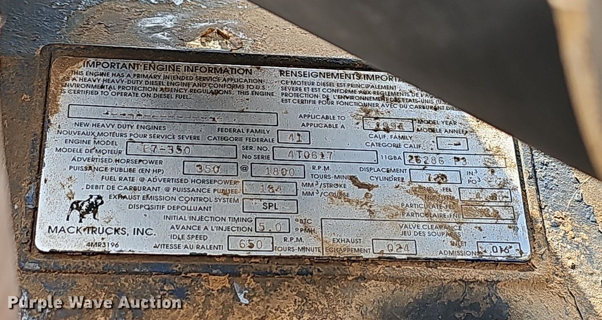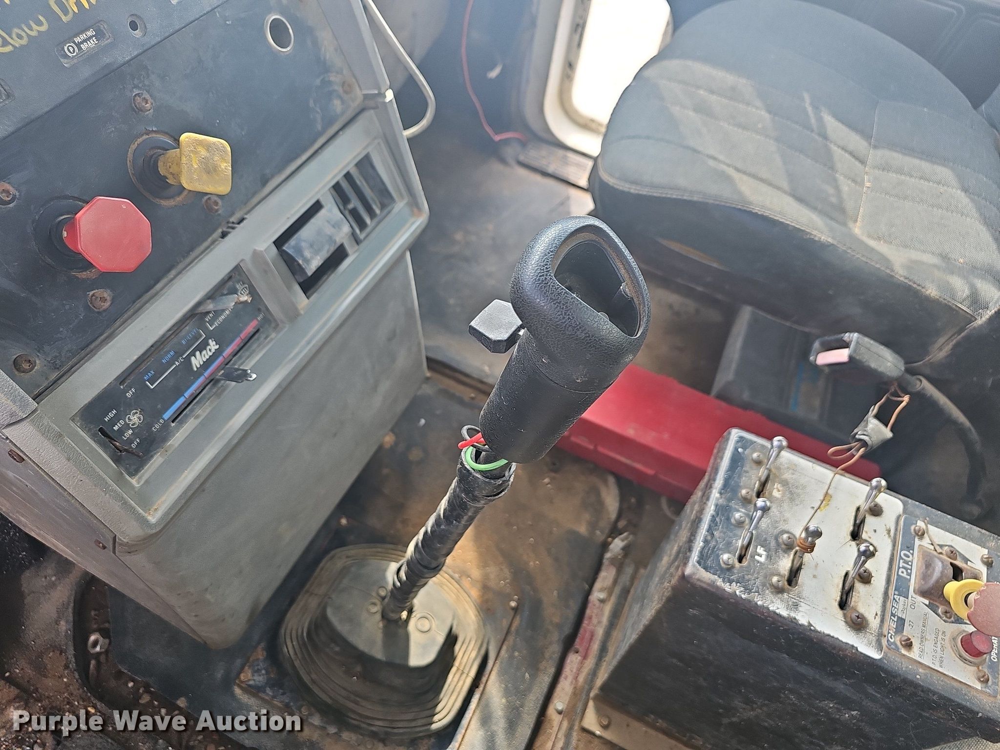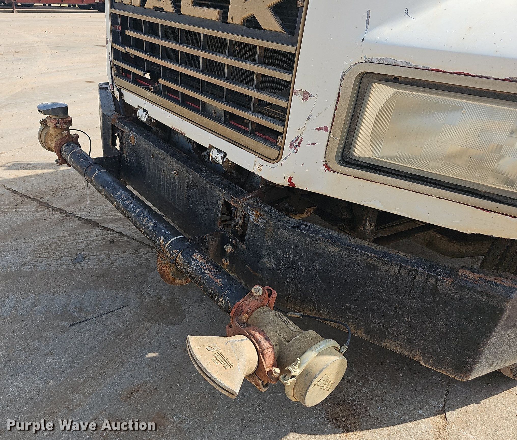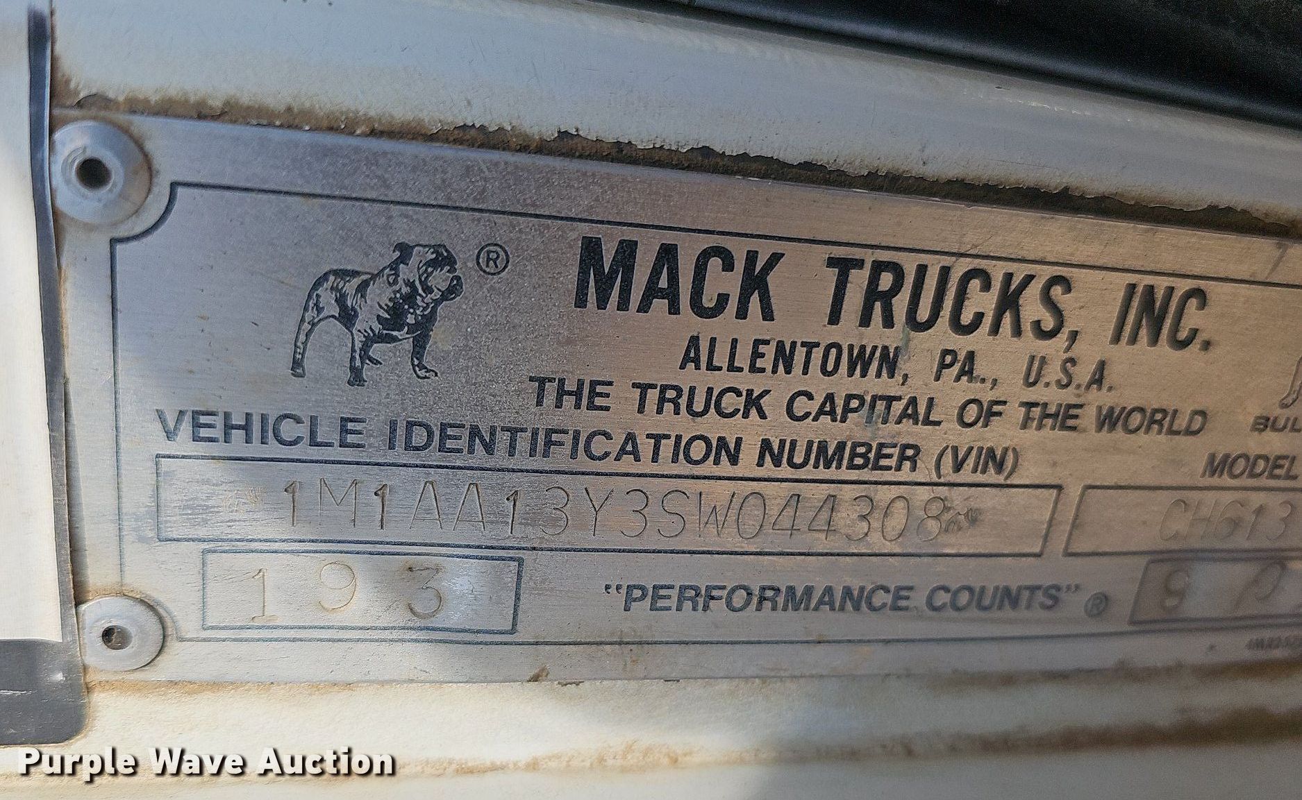 1995 Mack CH613 water truck. Kilometers: 116,951 on odometer, VIN: 1M1AA13Y3SW044308, Unit #: 5-121. Engine Mack E7-350 , Serial: 4T0617, Displacement: 12.0L, Cylinders: 6, Fuel type: Diesel, HP: 350. Transmission Eaton Fuller, Manual, Speed: 10. Chassis Axles: Tandem, Differential lock: Inter-axle, Suspension: Camelback, Brakes: Air, PTO. Interior AC, Heat, Heated mirrors, Cruise control. Features Bed / tank 13' 1" L x 96" W, Spray bar: Front, Rear, Side discharge, Top fill, Rear drain: 2", Rear outlet: 3". Tires Size: 11R22.5. Notes Driver window missing , Windshield chipped or cracked. Missouri title. Title distribution may be delayed up to 30 days from verification of funds. Emery Sapp & Sons, Inc.. 5350 E State Hwy AA. Springfield, MO 65803