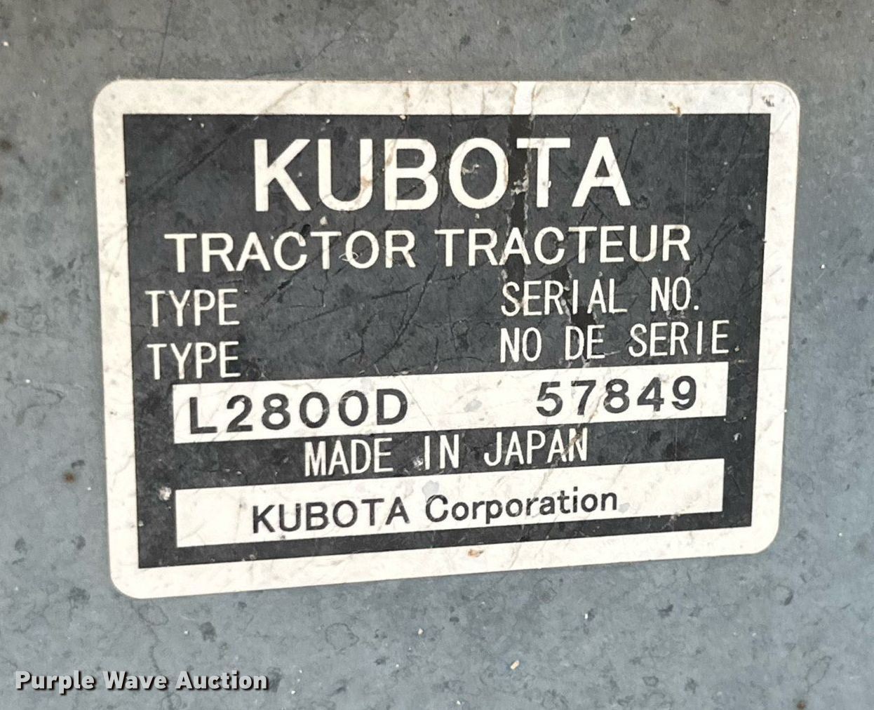 Purple Wave is selling a used Tractor in Texas. This item is a Kubota L2800D MFWD tractor with the following: Hours: 2,568 on meter, Serial: 57849