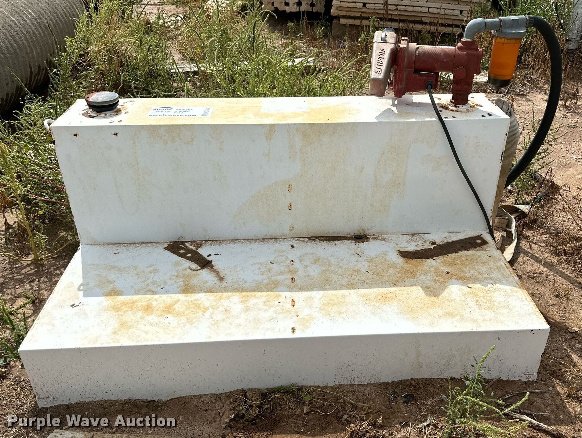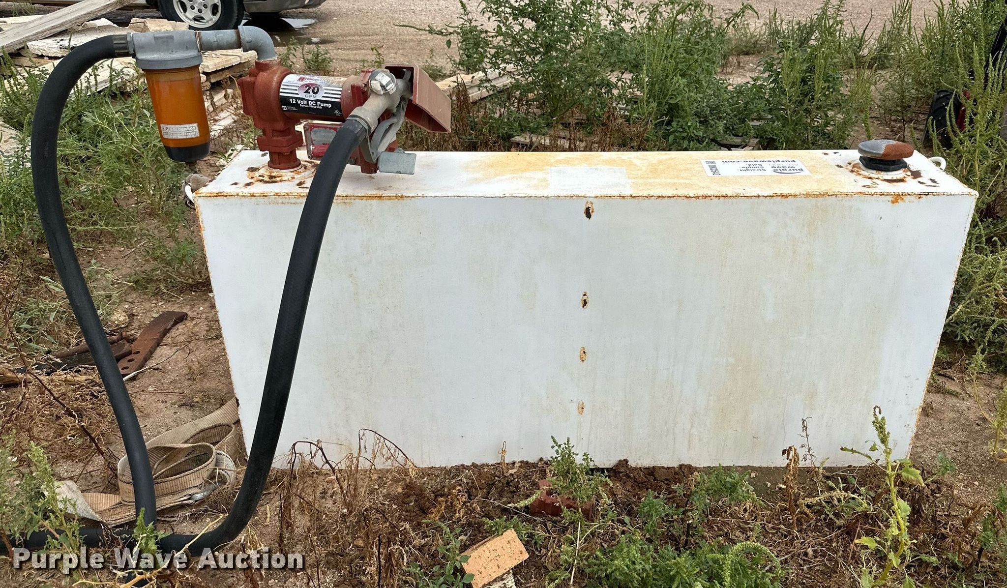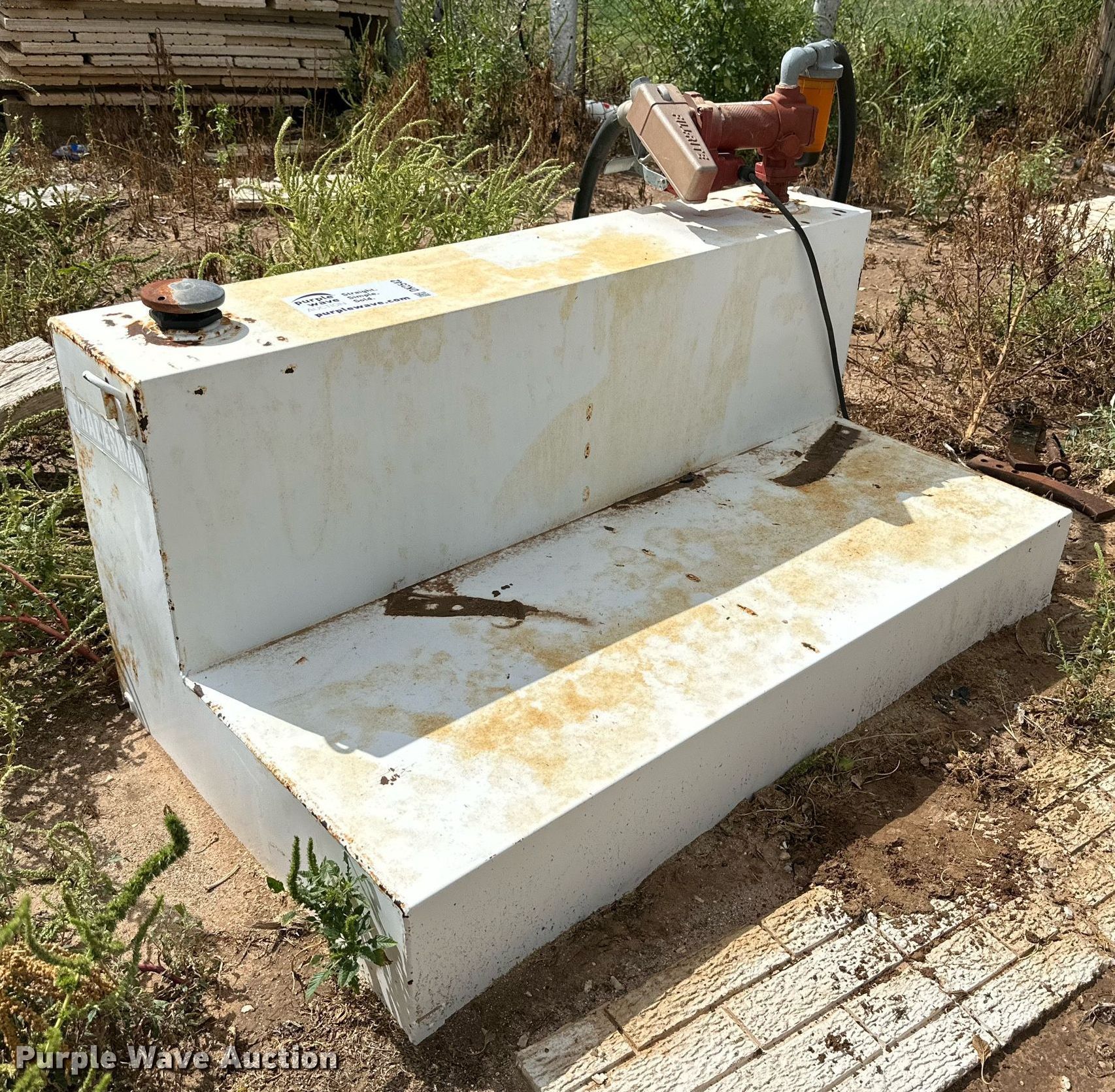 Purple Wave is selling a used Tanks in Texas. This item is a Tradesman L-shaped diesel tank with the following: 31" L x 56" W x 25" H, Fill-rite 20 GPM fuel pump