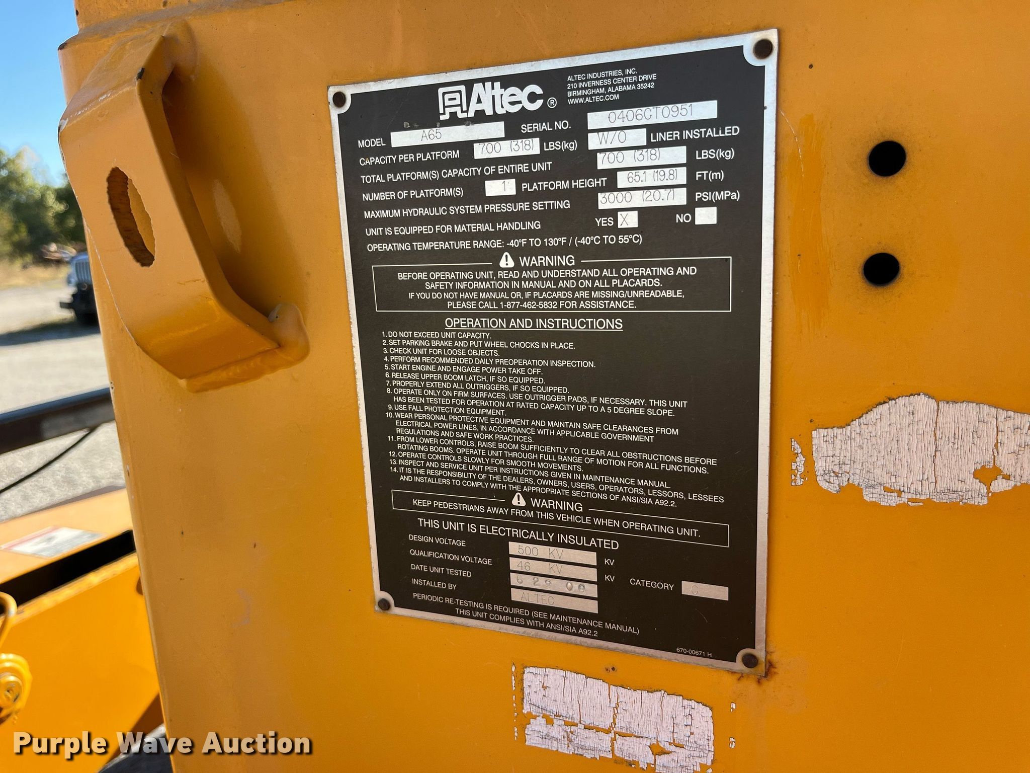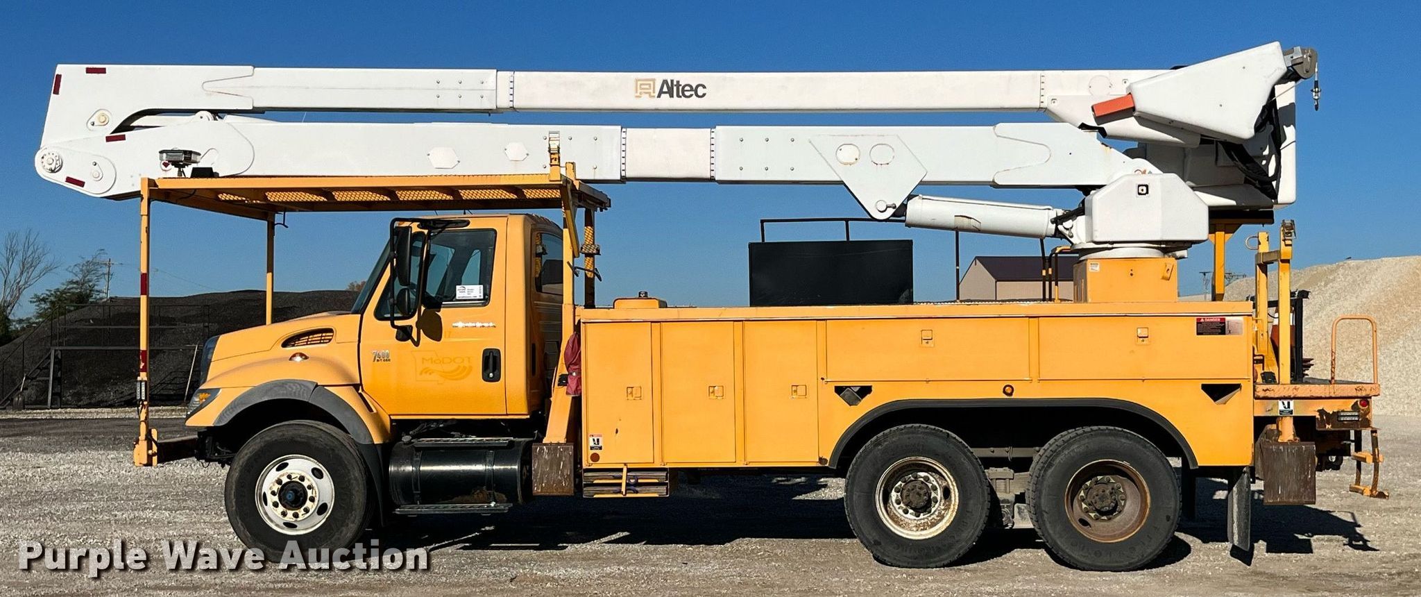 2006 International 7400 bucket truck. Miles: 73,086 on odometer, Hours: 4,393 on meter, VIN: 1HTWGAAR56J393945, Unit #: GP217. Engine International DT466, Displacement: 7.6L , Cylinders: 6, Fuel type: Diesel. Transmission Automatic. Chassis Axles: Tandem, Suspension: Spring over walking beam, Brakes: Air, PTO, Wheelbase: 525". Interior AC, Heat, Cruise control. Features Bed Altec, 190" L x 93" W, Boom Altec A65, Serial: 0406CT0951, Maximum lift capacity: 700 lbs, Maximum lift height: 65.1'H, Boom type: Articulating, Man basket, Boom controls Ground, Platform/ basket, Material handler. Tires Size: 315/80R22.5. Missouri title. Title distribution may be delayed up to 14 days from verification of funds. Missouri Department of Transportation (MODOT). 26826 US Hwy 63. Macon, MO 63552