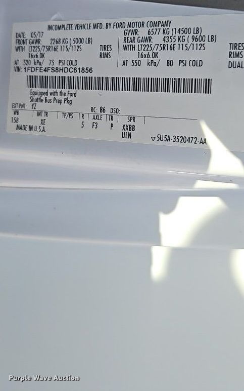 2017 Ford Econoline E450 shuttle bus. Miles: 212,909 on odometer, VIN: 1FDFE4FS8HDC61856. Engine Displacement: 6.8L , Cylinders: 10, Fuel type: Gas. Transmission Automatic. Chassis Axles: Single. Interior AC, Heat, Heated mirrors, Cruise control, Electric passenger sliding door, Passengers: 14, Wheelchair lift. Tires Size: 225/75R16. Notes Non-operational rear AC. Kansas title. Title distribution may be delayed up to 14 days from verification of funds. Burlington, KS 66839