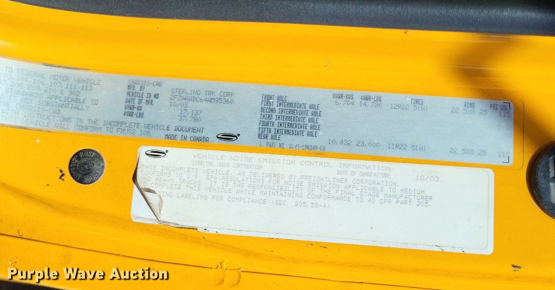 2004 Sterling L-Line dump truck. Miles: 55,932 on odometer, Hours: 4,218 on meter, VIN: 2FZAAWDC64AM95360, Unit #: 107. Engine Caterpillar 3126, Displacement: 7.2L, Cylinders: 6, Fuel type: Diesel, HP: 210, kW: 157. Transmission Allison, Automatic. Chassis Axles: Single, Suspension: Spring, Brakes: Air, PTO, GVWR: 37,780 lbs FAWR: 14,780 lbs, RAWR: 23,000 lbs. Interior AC, Heat, Heated mirrors. Features Dump bed Heil, 10' L x 8' W, Side height: 28", Side board height: 10", Bed type: Steel, Ram: Single , End gate: Air operated. Tires Front: 12R22.5, Rear: 11R22.5. Notes Dash warning indicator: ABS. Title distribution may be delayed up to 14 days from verification of funds. Washington County. 10629 Midwest Road. Cadet, MO 63630