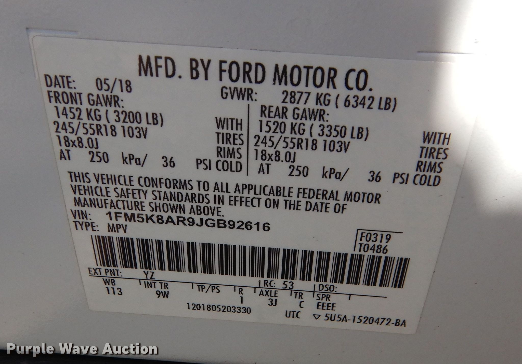 - VIN: 1FM5K8AR9JGB92616