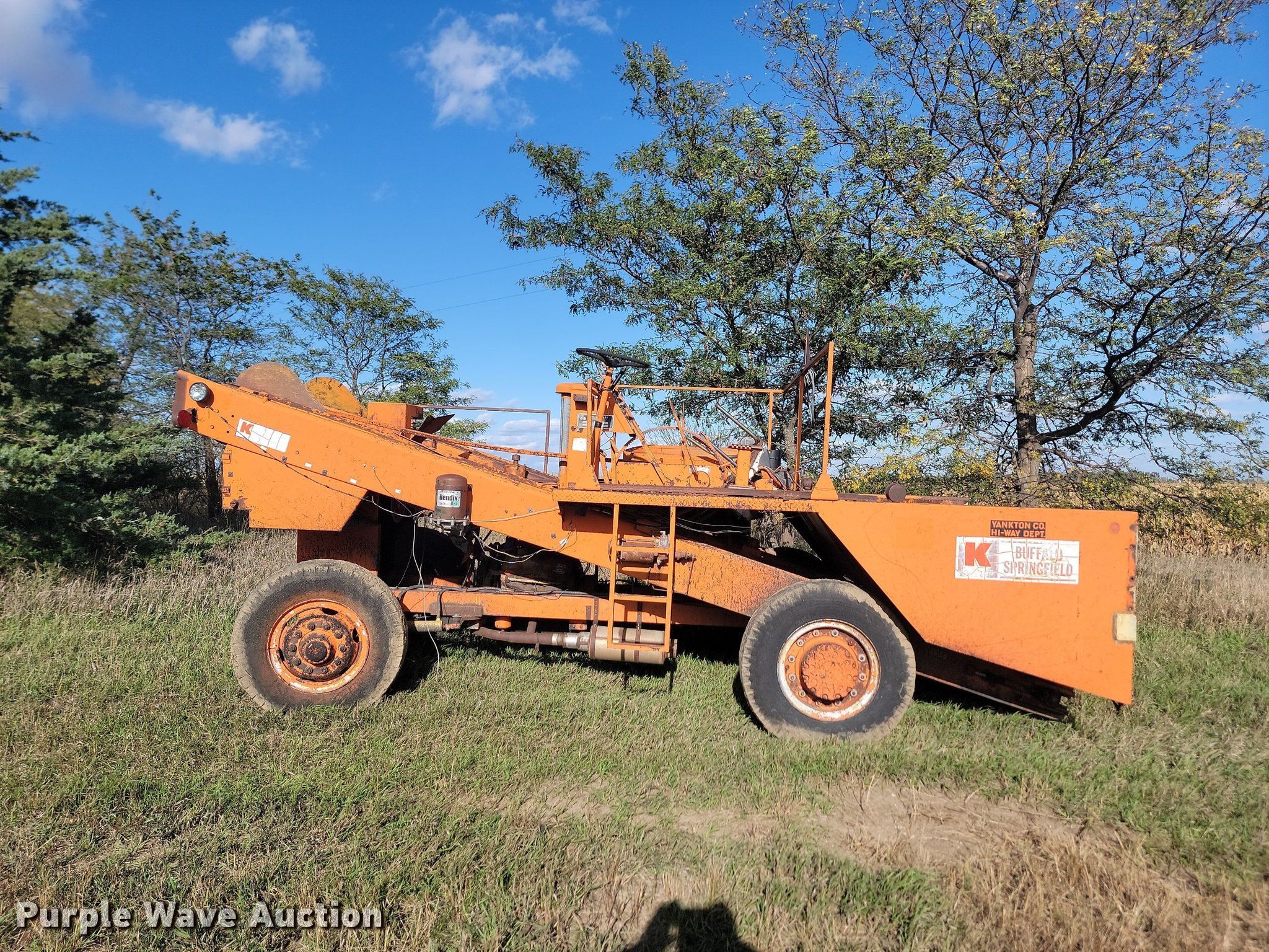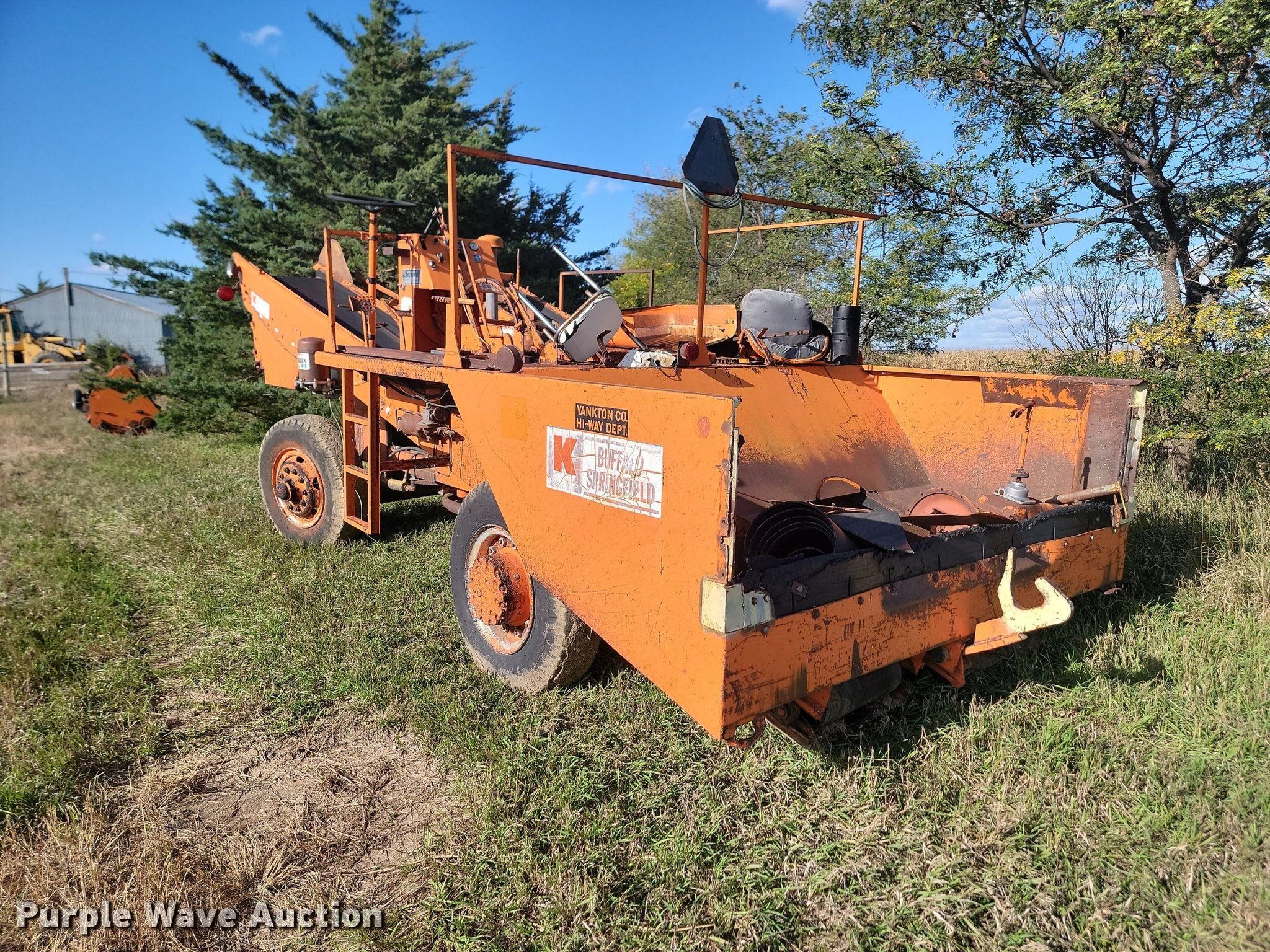 (2) chip spreaders. Buffalo-Springfield K Spreadmaster chip spreader. Hours: Unknown. Engine Ford, Cylinders: 8, Fuel type: Gas. Features Front spread hopper width: 14', Material conveyor. Tires Front: 10.00R20. Notes Parts only, Non-operational unit. Buffalo-Springfield Co. K chip spreader Hours: Unknown. Engine Ford, Cylinders: 8, Fuel type: Gas. Features Front spread hopper width: 14', Material conveyor. Tires Size: 10.00R20. Notes Non-operational unit. Bon Homme County, SD. 1310 Birch Street. Tyndall, SD 57066