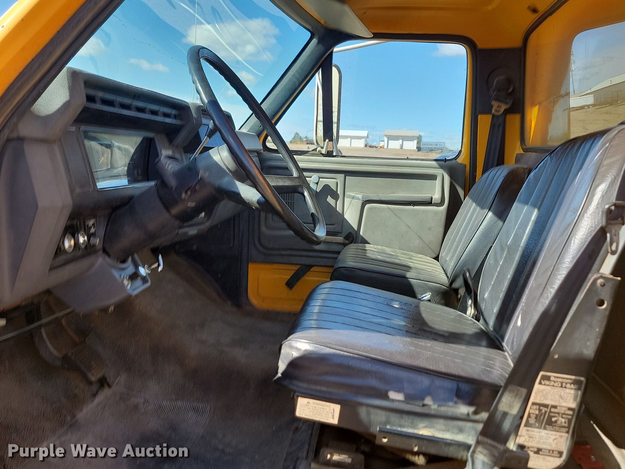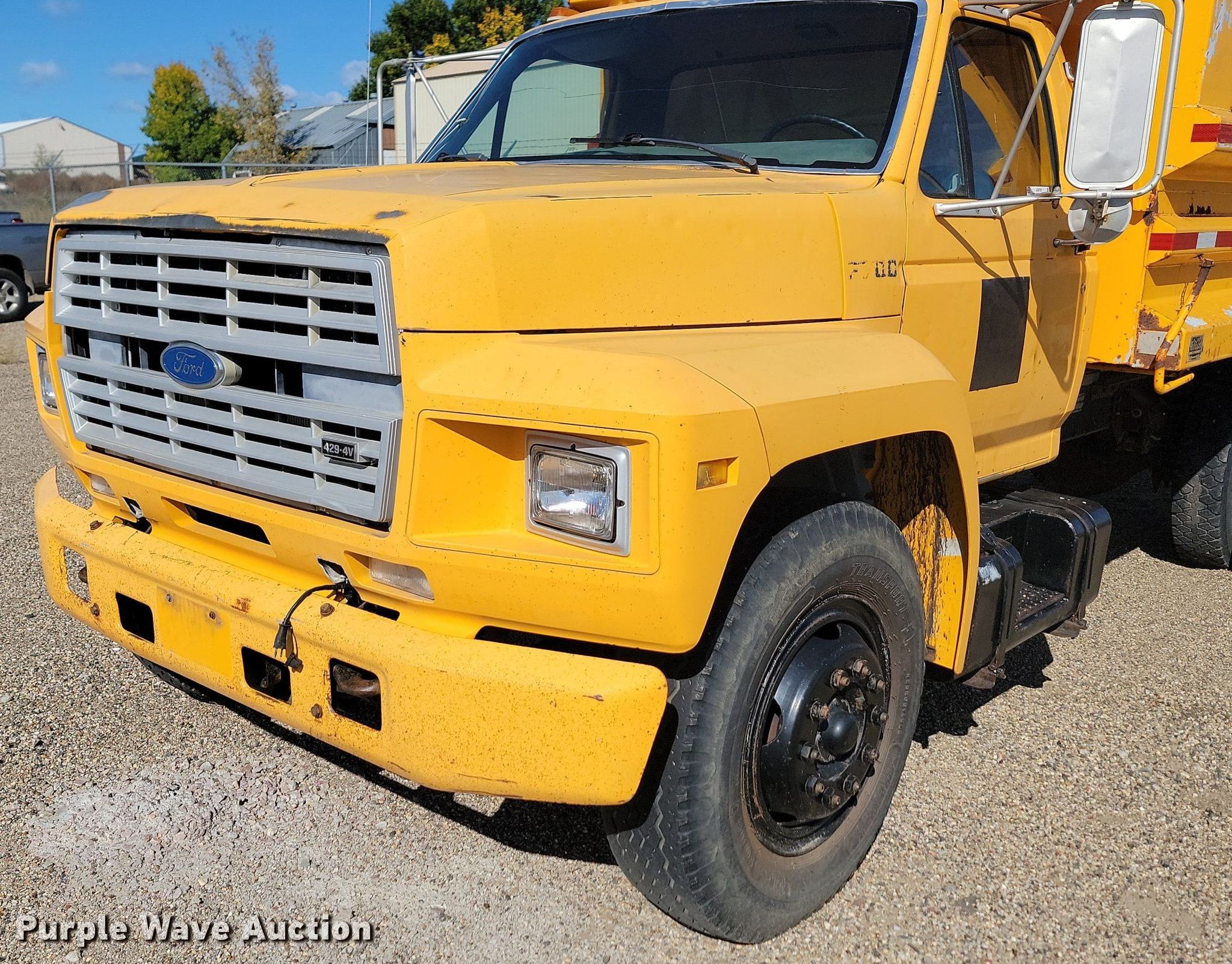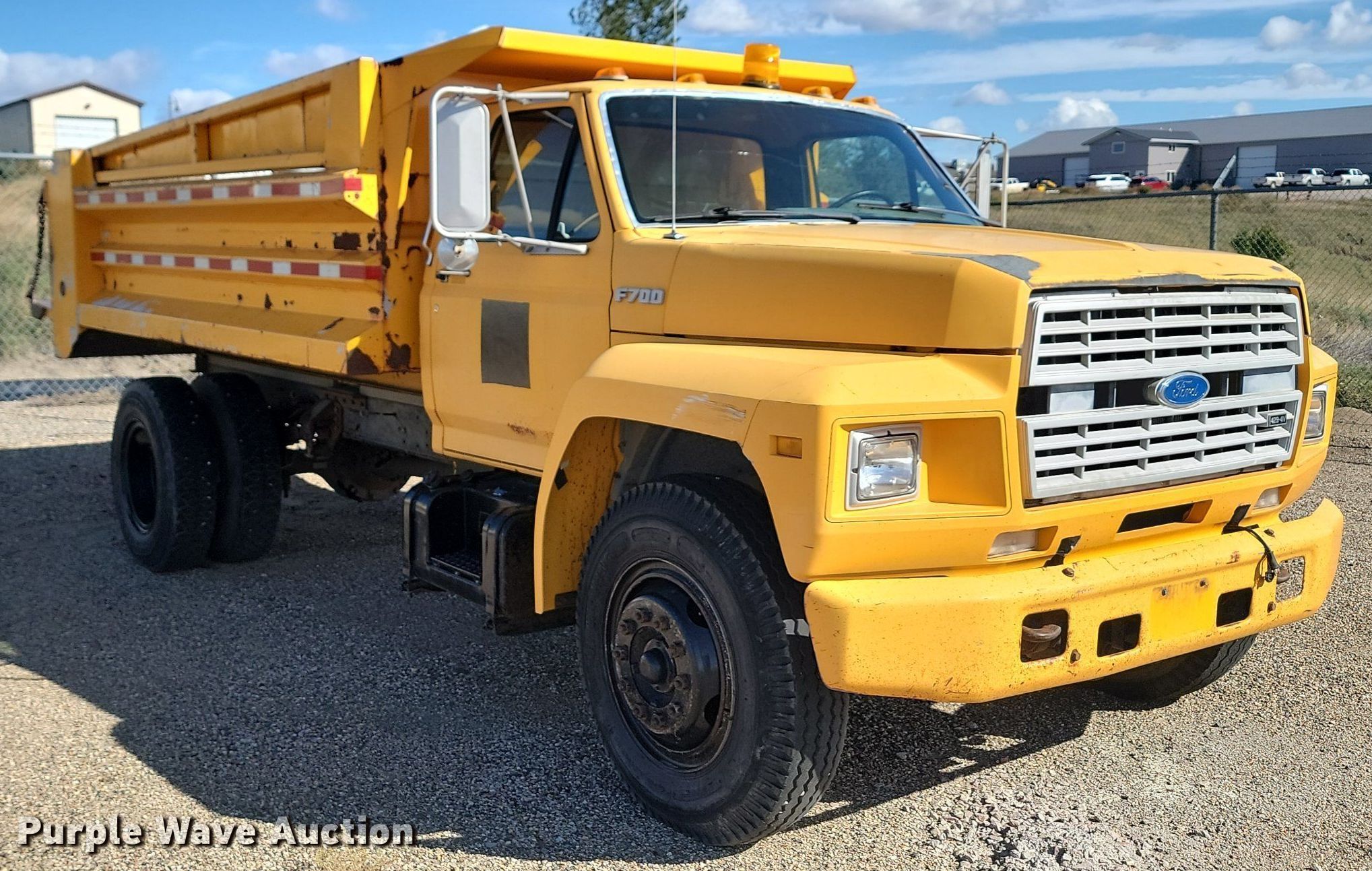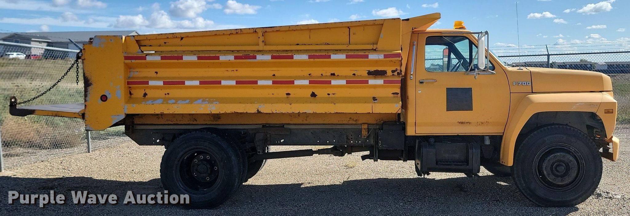 1990 Ford F700 dump truck. Miles: 73,724 on odometer, Hours: 1,929 on meter, VIN: 1FDPF70KXLVA47885, Unit #: DA152. Engine Displacement: 7.0L, Cylinders: 8, Fuel type: Gas. Transmission Automatic. Chassis Axles: Single, Suspension: Spring, Brakes: Hydraulic, PTO, GVWR: 27,000 lbs. Interior Heat. Features Dump bed 13' L x 96" W, Side height: 26", Side board height: 12", Bed type: Steel, Ram: Single , End gate: Manual. Tires Size: 9.00R20. Notes Windshield chipped or cracked, Possible engine issues, dies, Carburetor issues Possible fuel system issues, Non-operational unit. South Dakota title. State of South Dakota Bureau of Administration. 104 South Garfield Avenue. Pierre, SD 57501