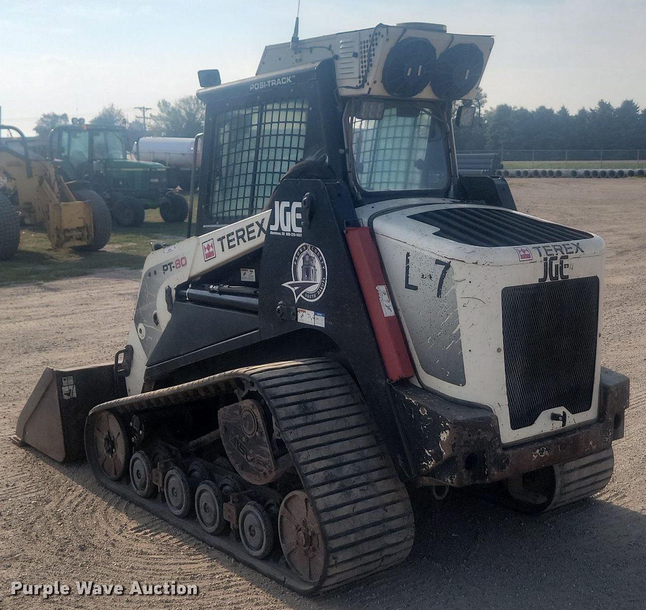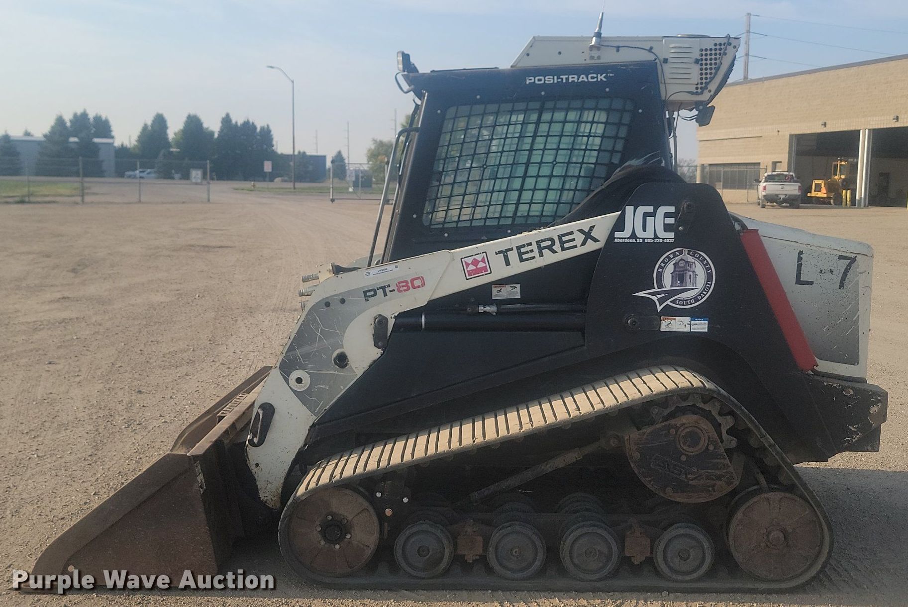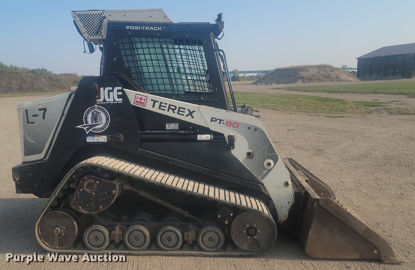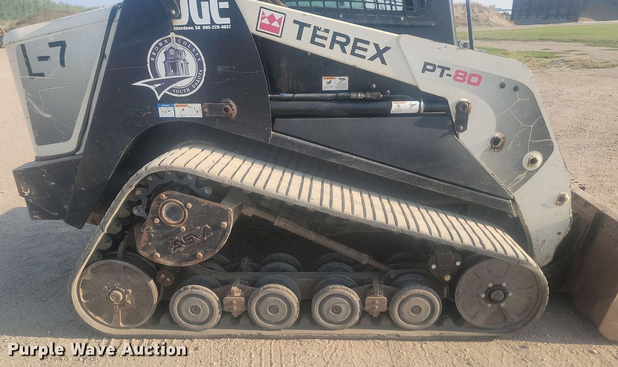 2010 Terex PT-80 tracked skid steer loader. Hours: 4,933 on meter, Serial: DTL01414. Engine Perkins, Cylinders: 4, Fuel type: Diesel. Transmission Hydrostatic, Two speed travel. Operators station Enclosed cab, AC, Heat, Bucket control: Hand. Features Auxiliary hydraulics High Flow Hydraulics, Auxiliary electrical outlet, Quick coupler: Hydraulic, Bucket Width: 72", Cutting edge: Bolt-on. Tracks Width: 18". Brown County. 3133 8th Ave NE. Aberdeen, SD 57401