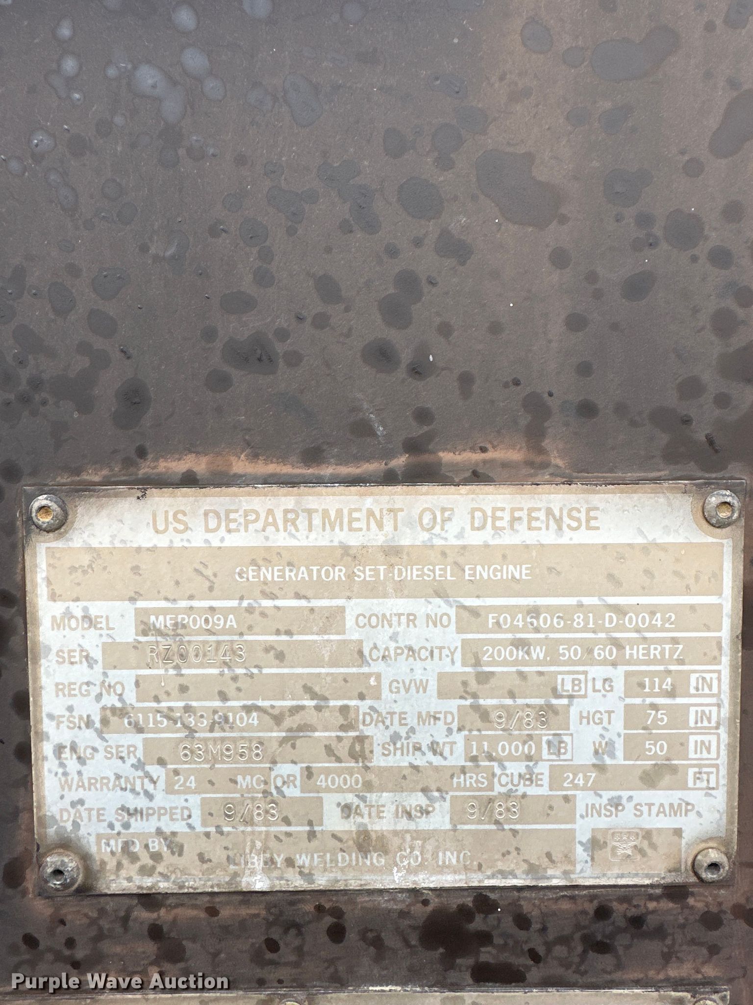 1983 U.S. Department Of Defense generator. Hours: 1,764 on meter. Engine Fuel type: Diesel. Features Generator kW: 200, Phase: Three, Electric start, Fuel tank, Skid mounted. Notes Dead battery, Unknown operating condition. Washington County, AR. 2615 Brink Dr. Fayetteville, AR 72701