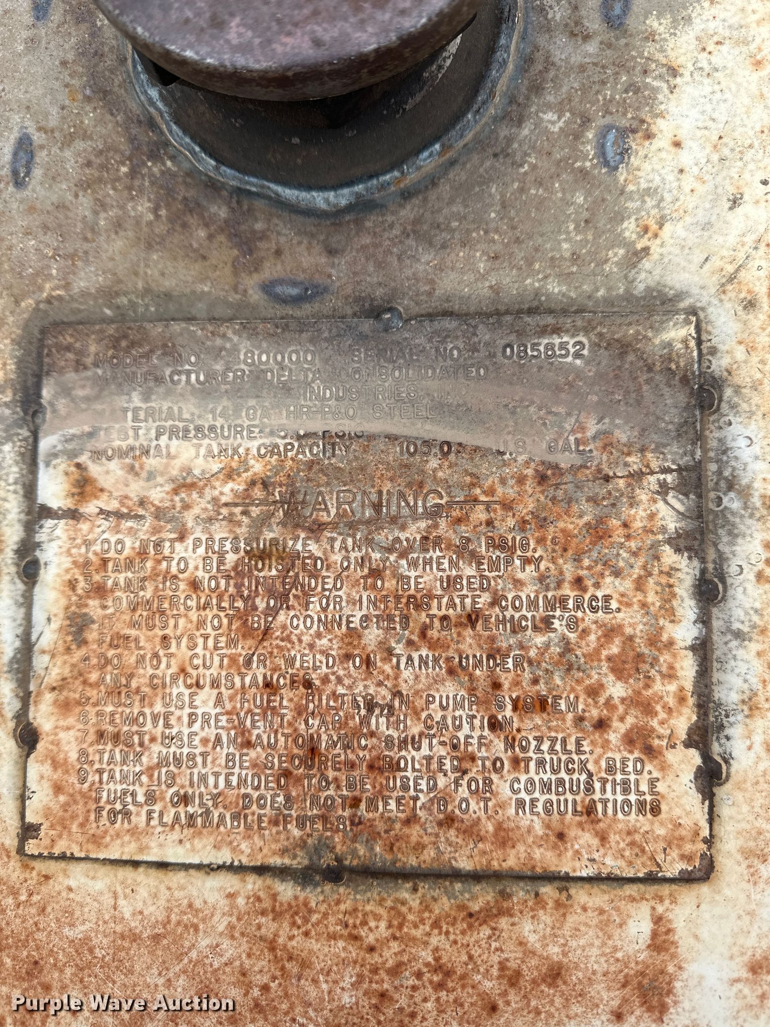 Purple Wave is selling a used Fuel and Lube in Arkansas. This item is a Delta fuel tank with the following: Serial: 085652, Fill-Rite FR1200G pump
