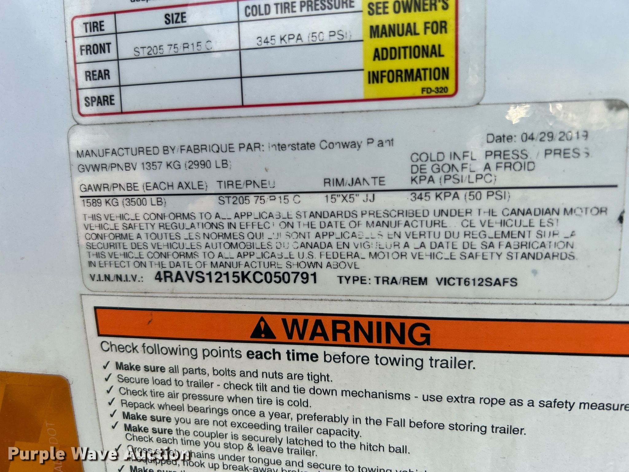 Purple Wave is selling a used Enclosed Cargo Trailer in Oklahoma. This item is a 2019 Interstate enclosed cargo trailer with the following: VIN: 4RAVS1215KC050791