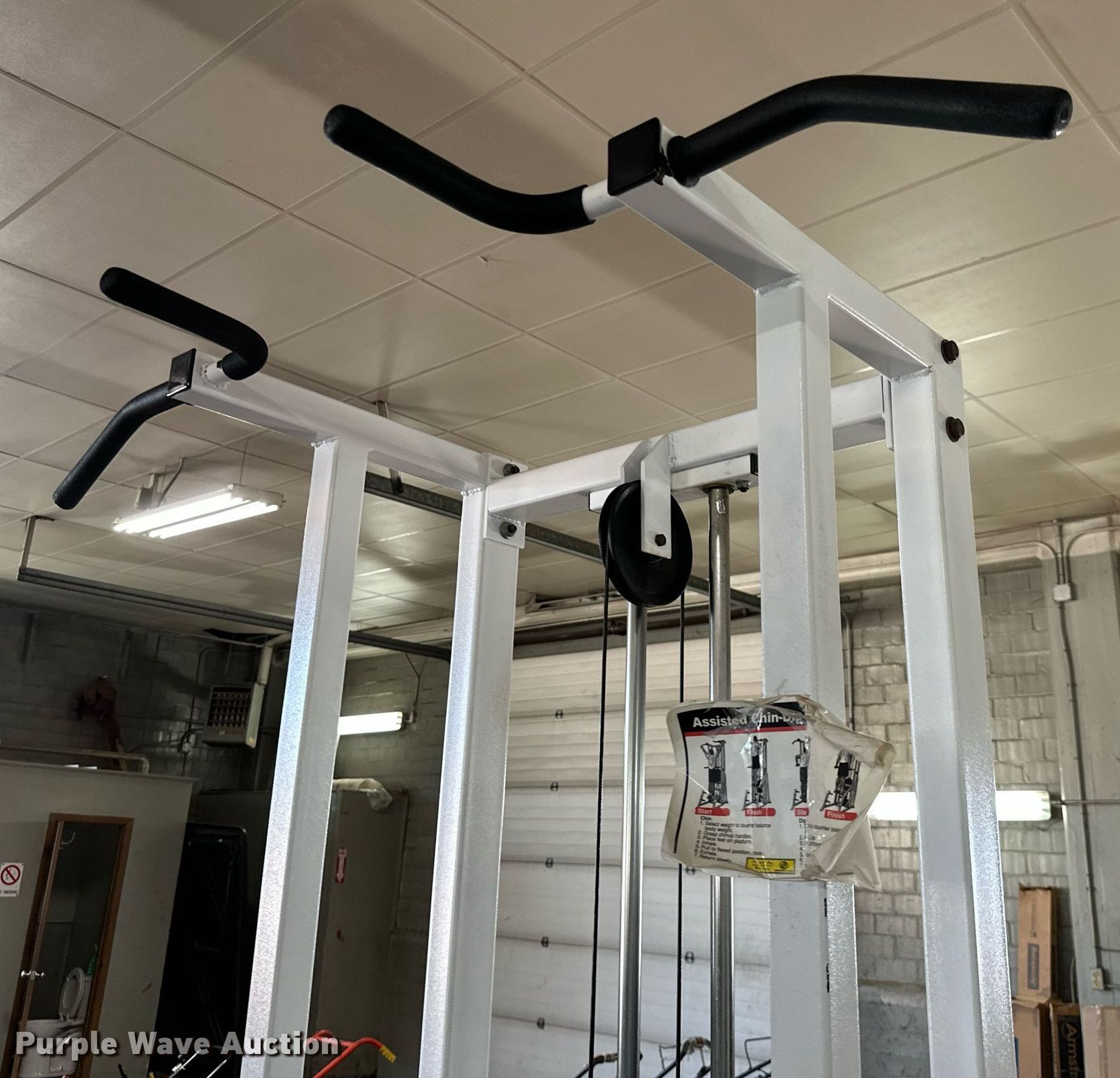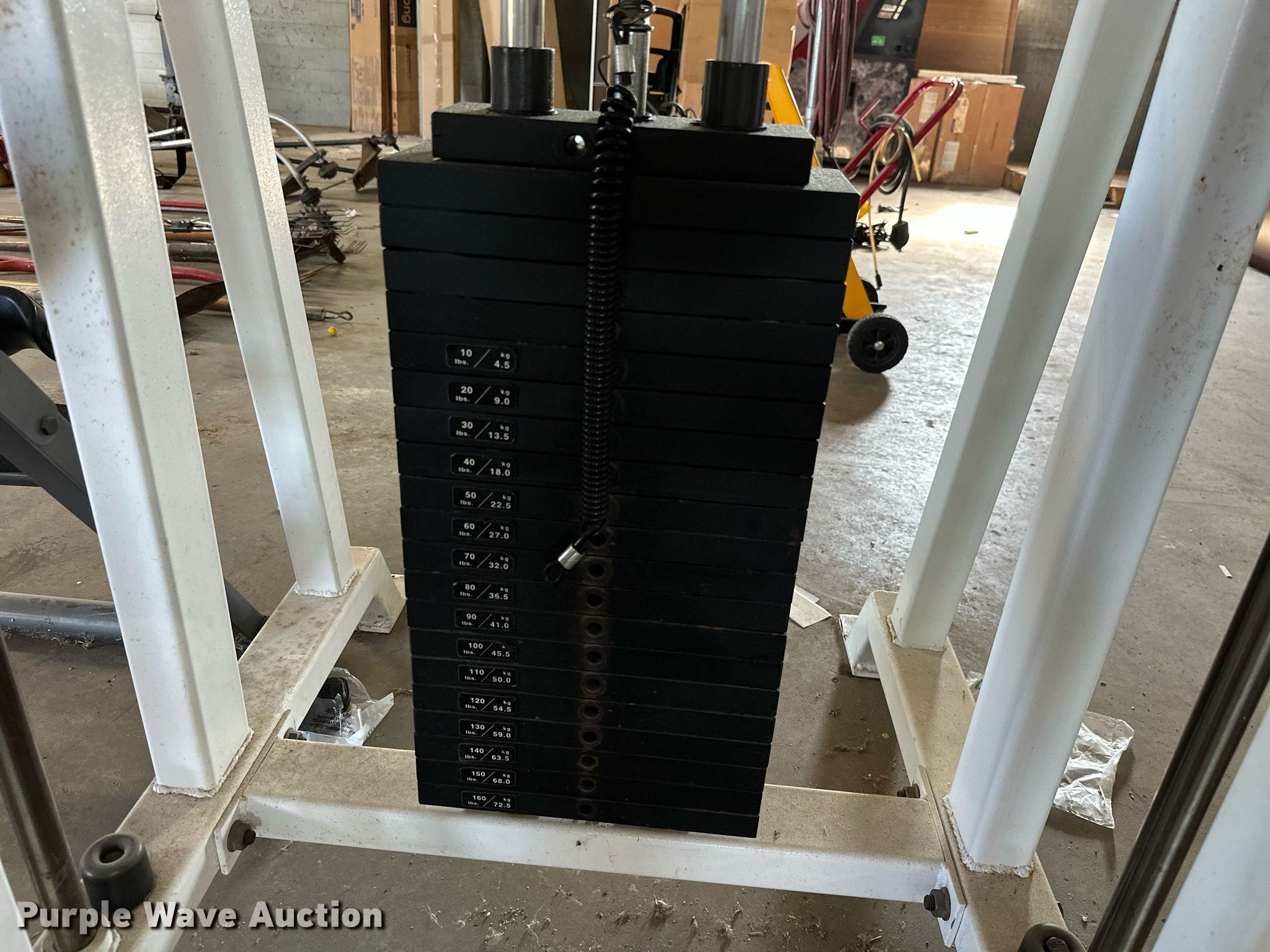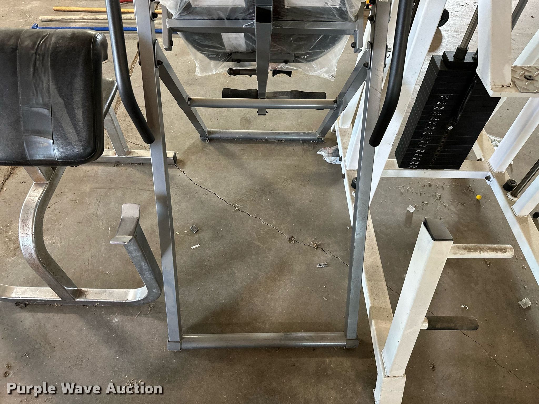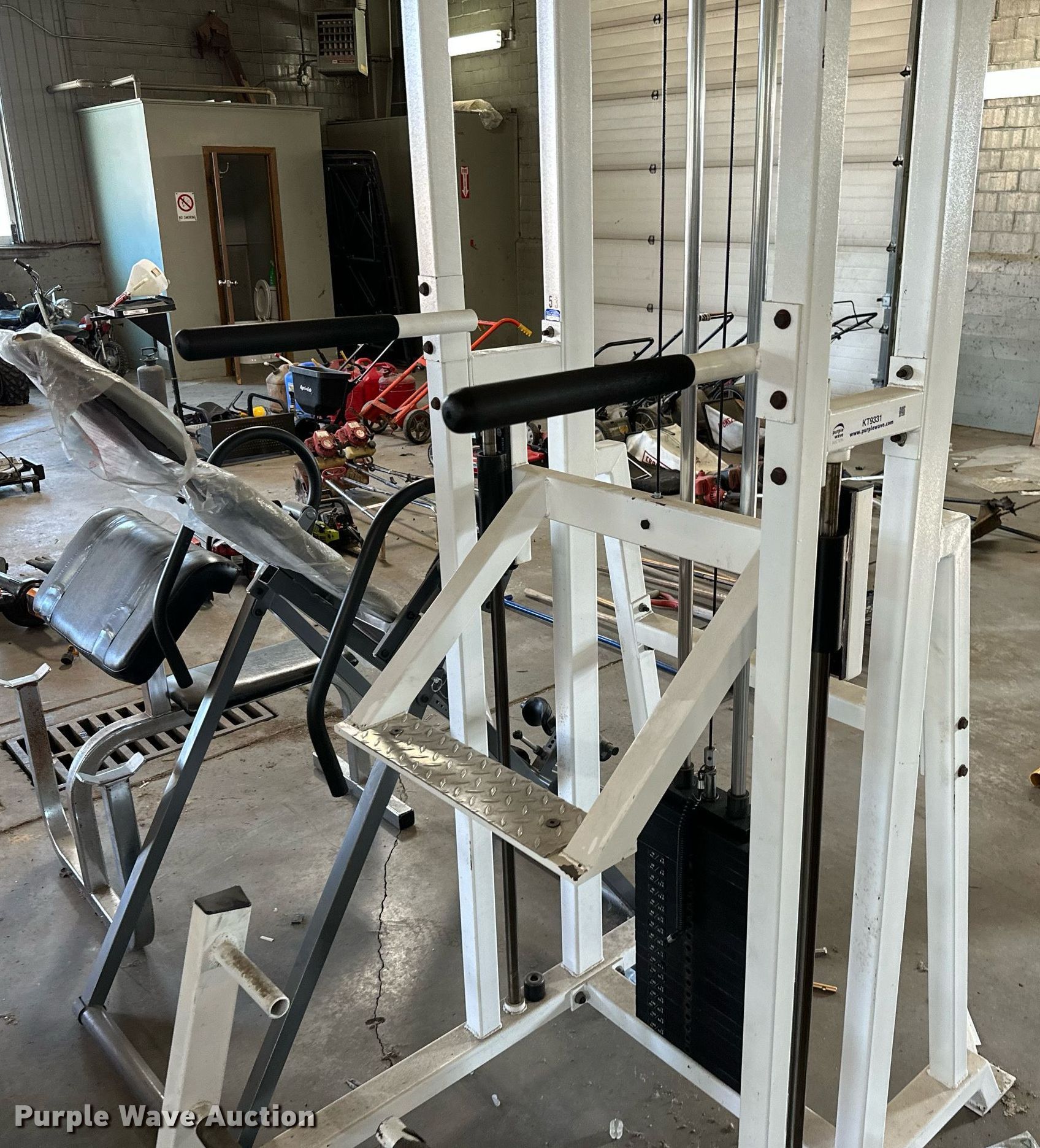 Purple Wave is selling a used Sporting Goods in Oklahoma. This item is a Exercise equipment with the following: Inversion table, Unused, Tricep extension machine, Pull up machine, Adjustable weights