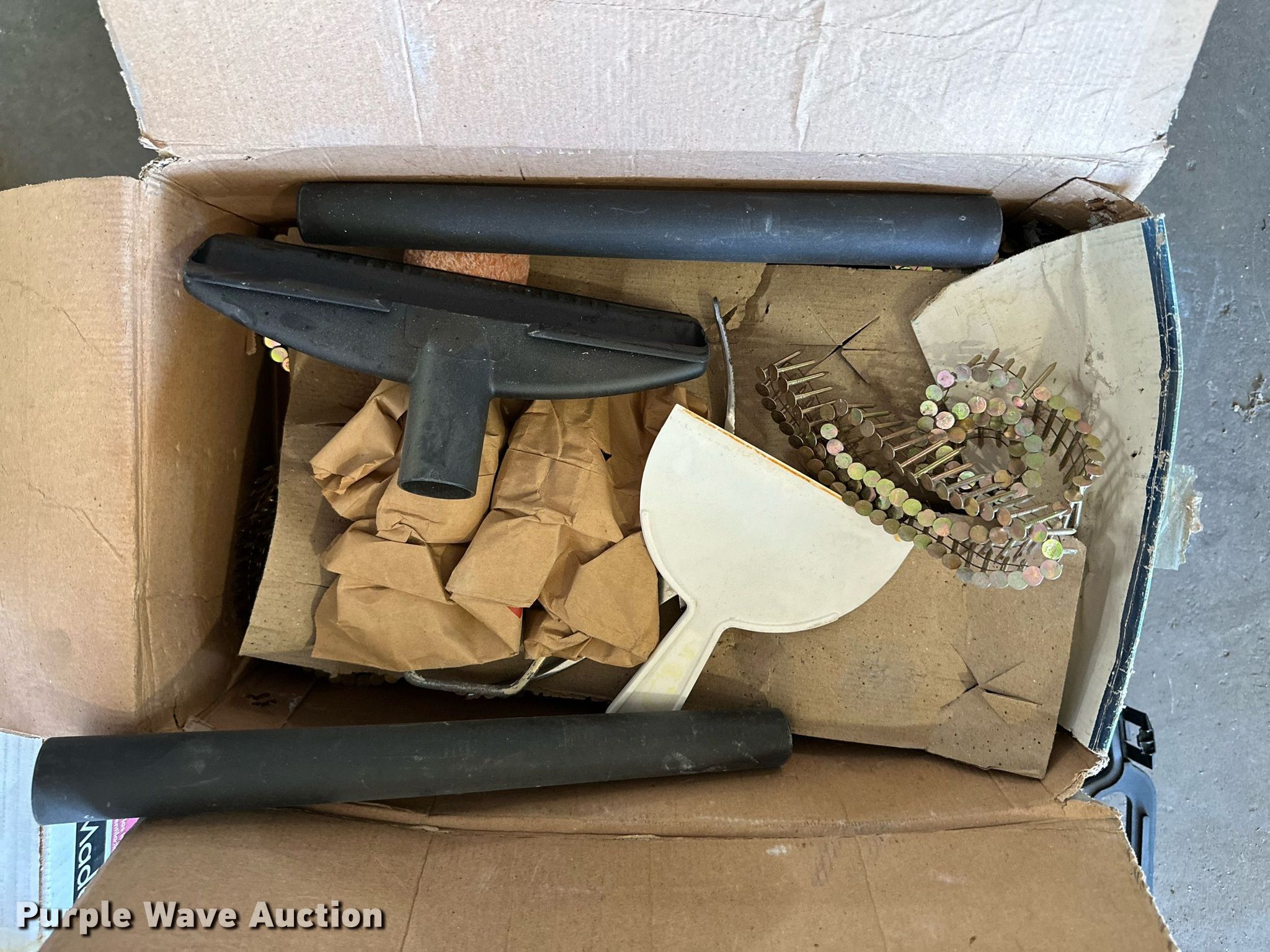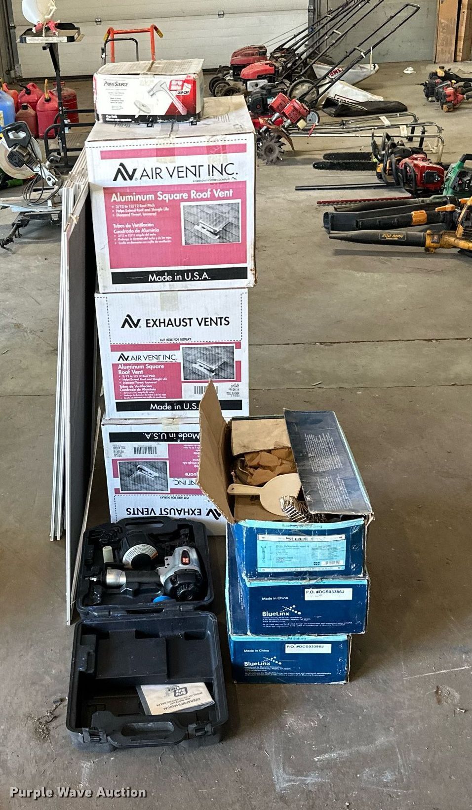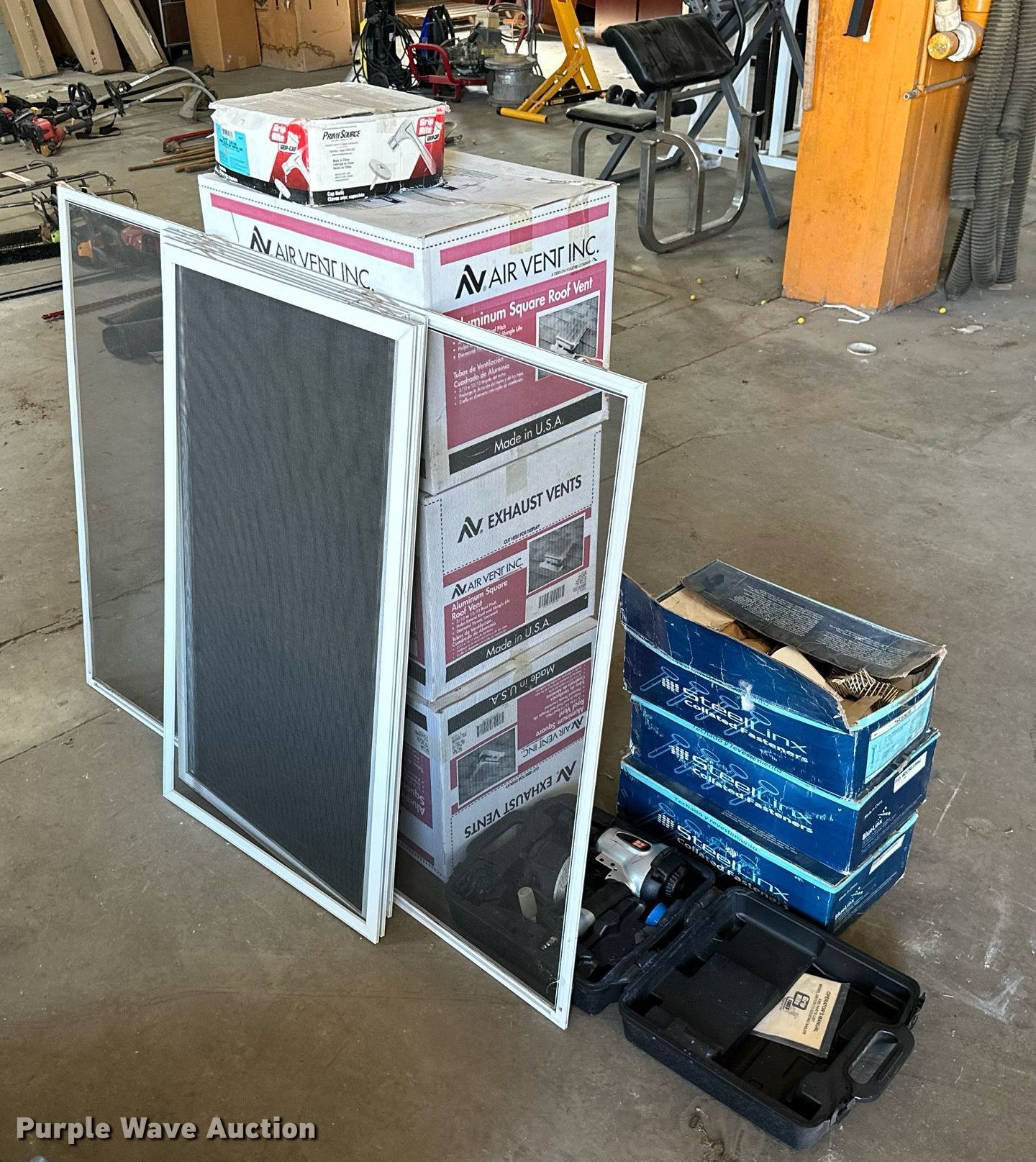 Purple Wave is selling a used Building Materials in Oklahoma. This item is a Building materials with the following: Air Vent Inc roof vents, (4) window screens, Grip Rite nail gun, Roofing nails, Cap nails