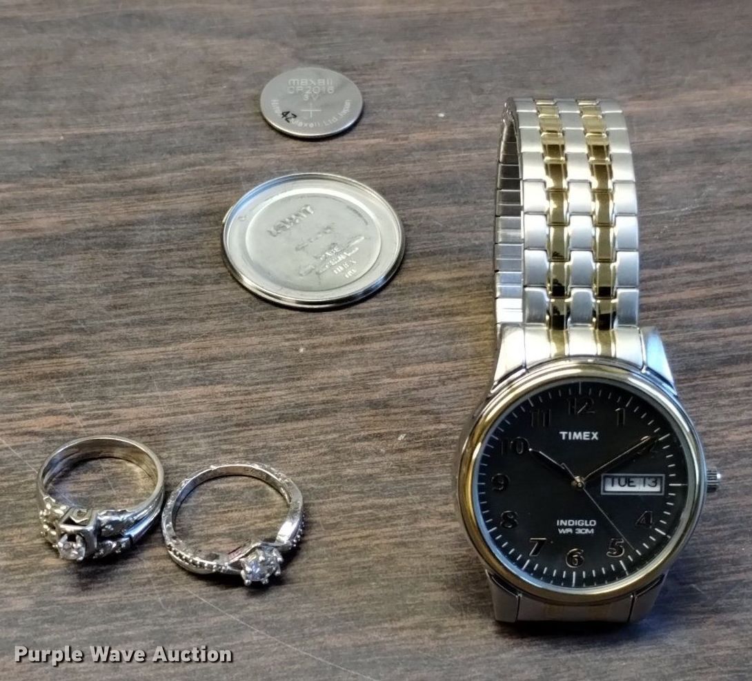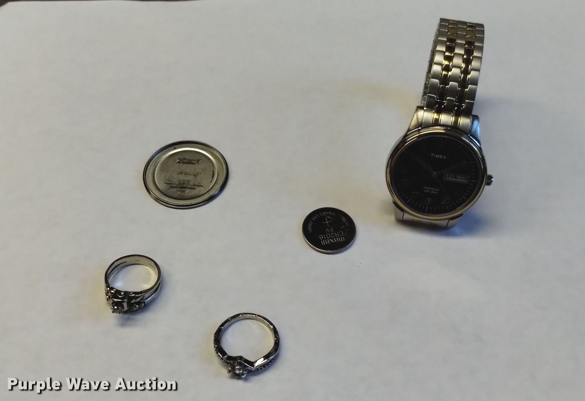 Purple Wave is selling a used Jewelery in Colorado. This item is a Jewelry with the following: (2) rings, Timex watch, Unknown operating condition