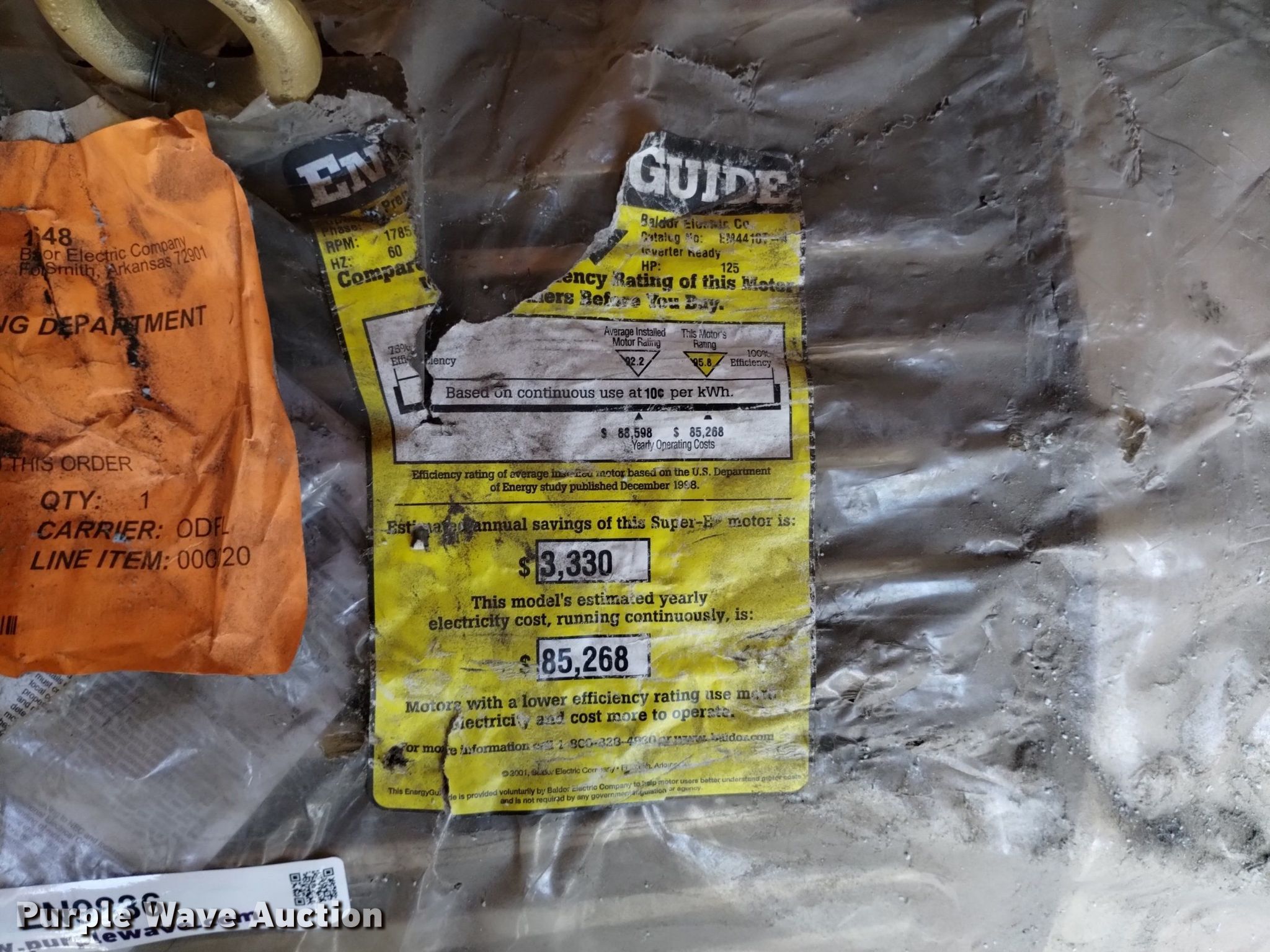 Purple Wave is selling a used Electric Motor in Colorado. This item is a Baldor M39B electric motor with the following: Serial: K1105, HP: 125, Volts: 460, Hz: 60, Three phase, Unused