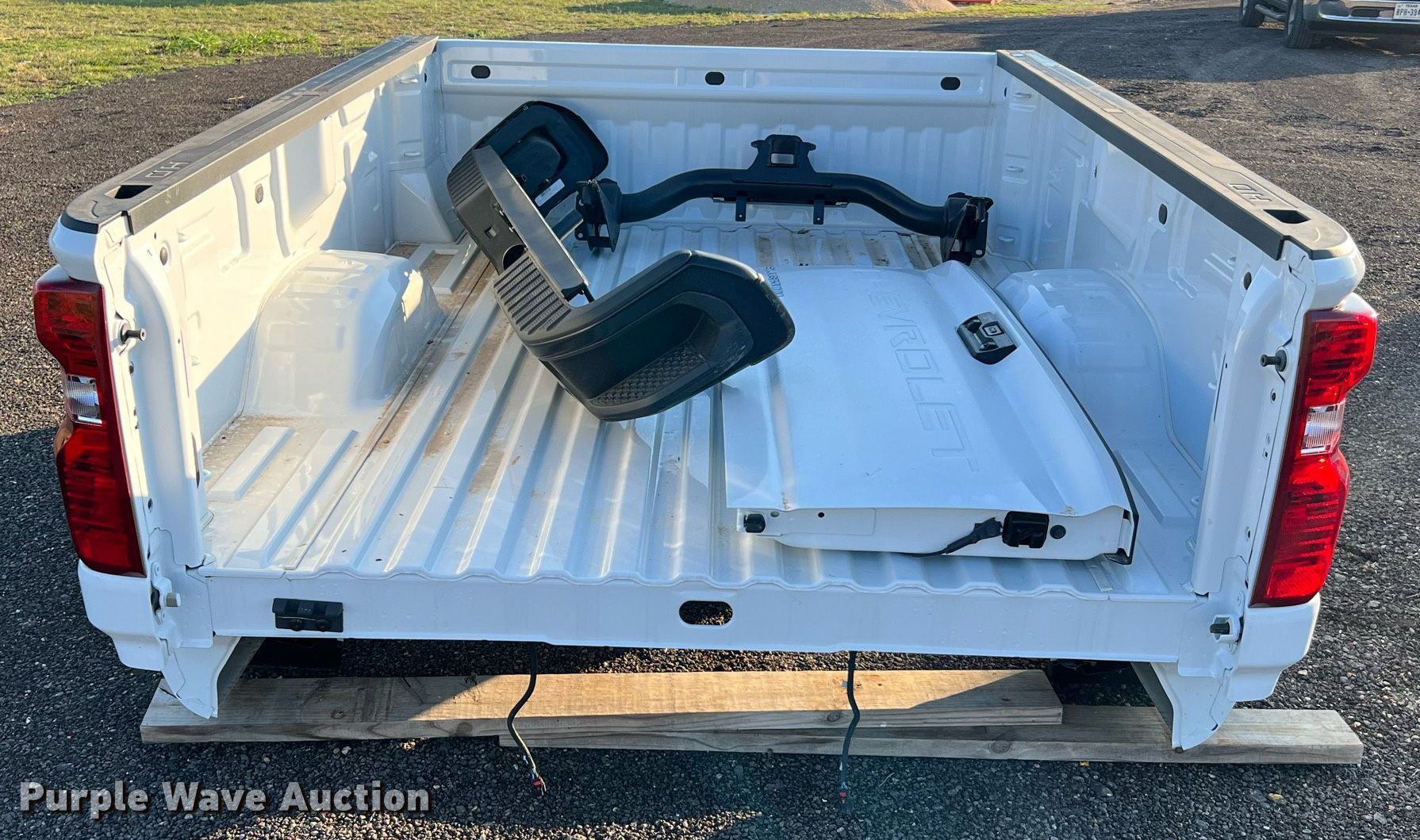 Purple Wave is selling a used Automotive Parts or Acces. in Texas. This item is a 2023 Chevrolet Silverado automotive parts with the following: 8' L pickup bed, Tailgate with camera, Black bumper, Receiver hitch