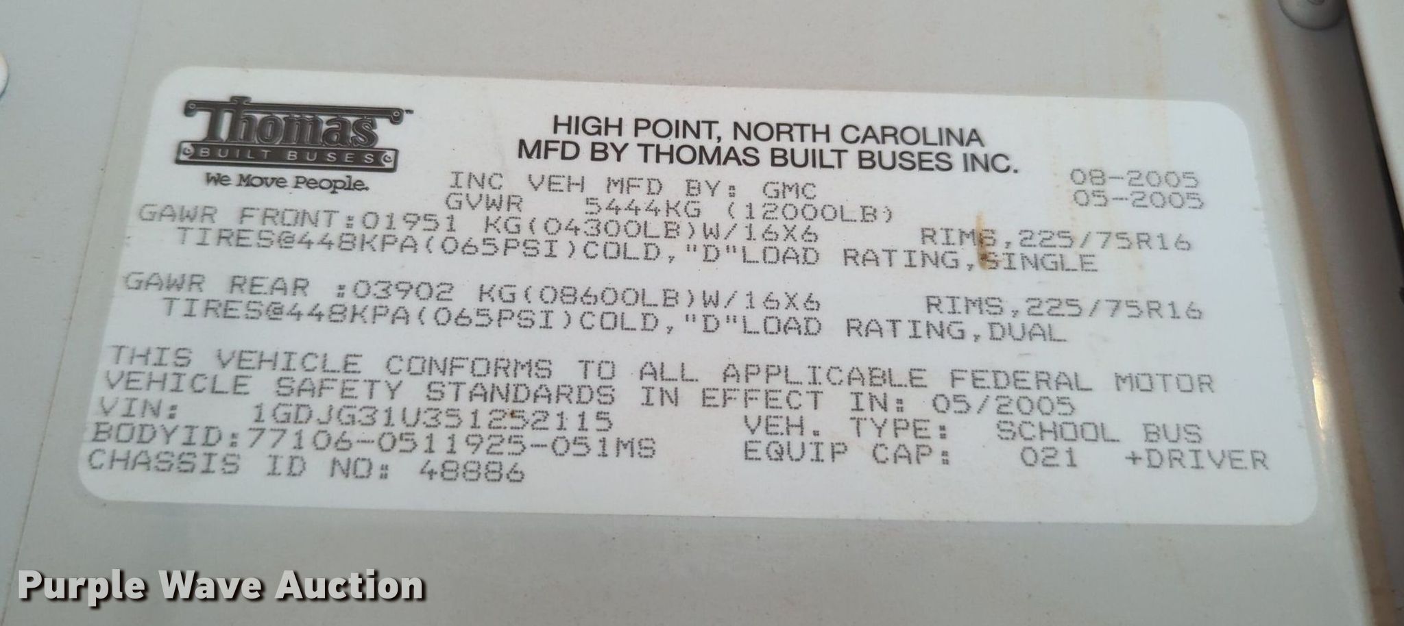 Purple Wave is selling a used Bus in Oklahoma. This item is a 2005 Thomas Built shuttle bus with the following: Miles: 90,248 on odometer, VIN: 1GDJG31U351252115