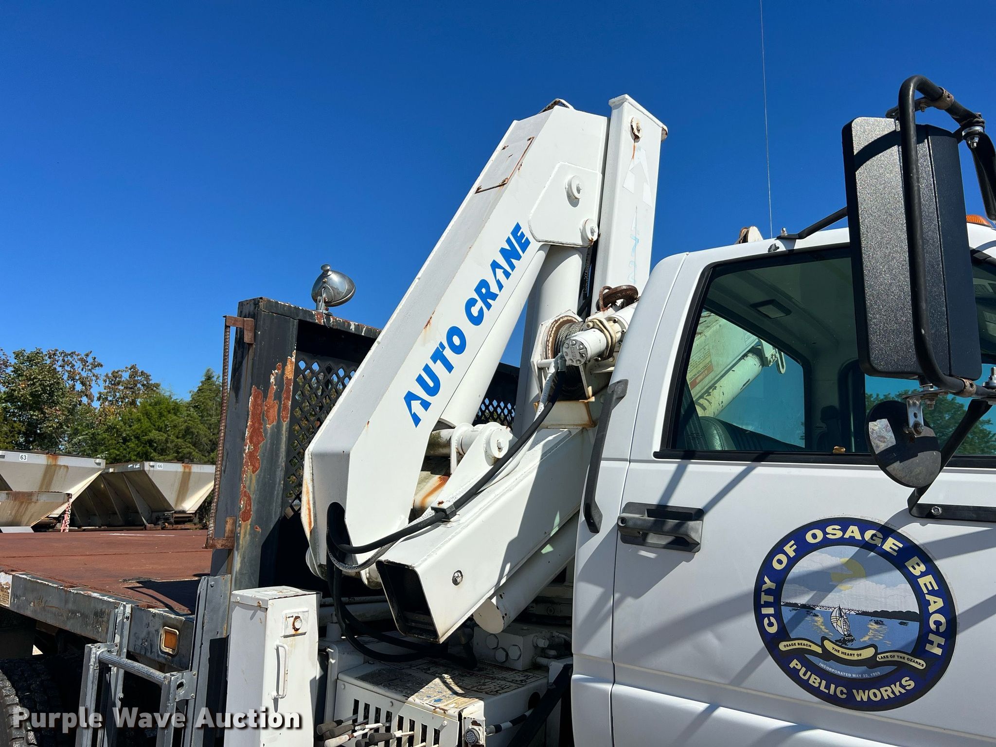1999 Chevrolet C6500 crane truck. Miles: 8,934 on odometer, Hours: 1,707 on meter, VIN: 1GBK7H1C4XJ105774. Engine Caterpillar 3126, Serial: 7AS55863, Displacement: 7.2L, Cylinders: 6, Fuel type: Diesel, HP: 330. Transmission Eaton Fuller, Manual, Speed: 9. Chassis Axles: Single, Suspension: Spring, Brakes: Air, PTO, GVWR: 25,950 lbs FAWR: 8,100 lbs, RAWR: 17,850 lbs. Interior AC, Heat. Features Flatbed Knapheide , Serial: 958882, 12' 3" L x 96" W, Crane Auto Crane A72A, Knuckle, Maximum boom length: 35' Maximum lift capacity: 10,000 lbs, Boom controls Ground.. Tires Size: 11/R22.5. Notes Hydraulic issues, driver side leak. Missouri title. Title distribution may be delayed up to 14 days from verification of funds. City of Osage Beach, MO. 5757 Chapel Drive. Osage Beach, MO 65065