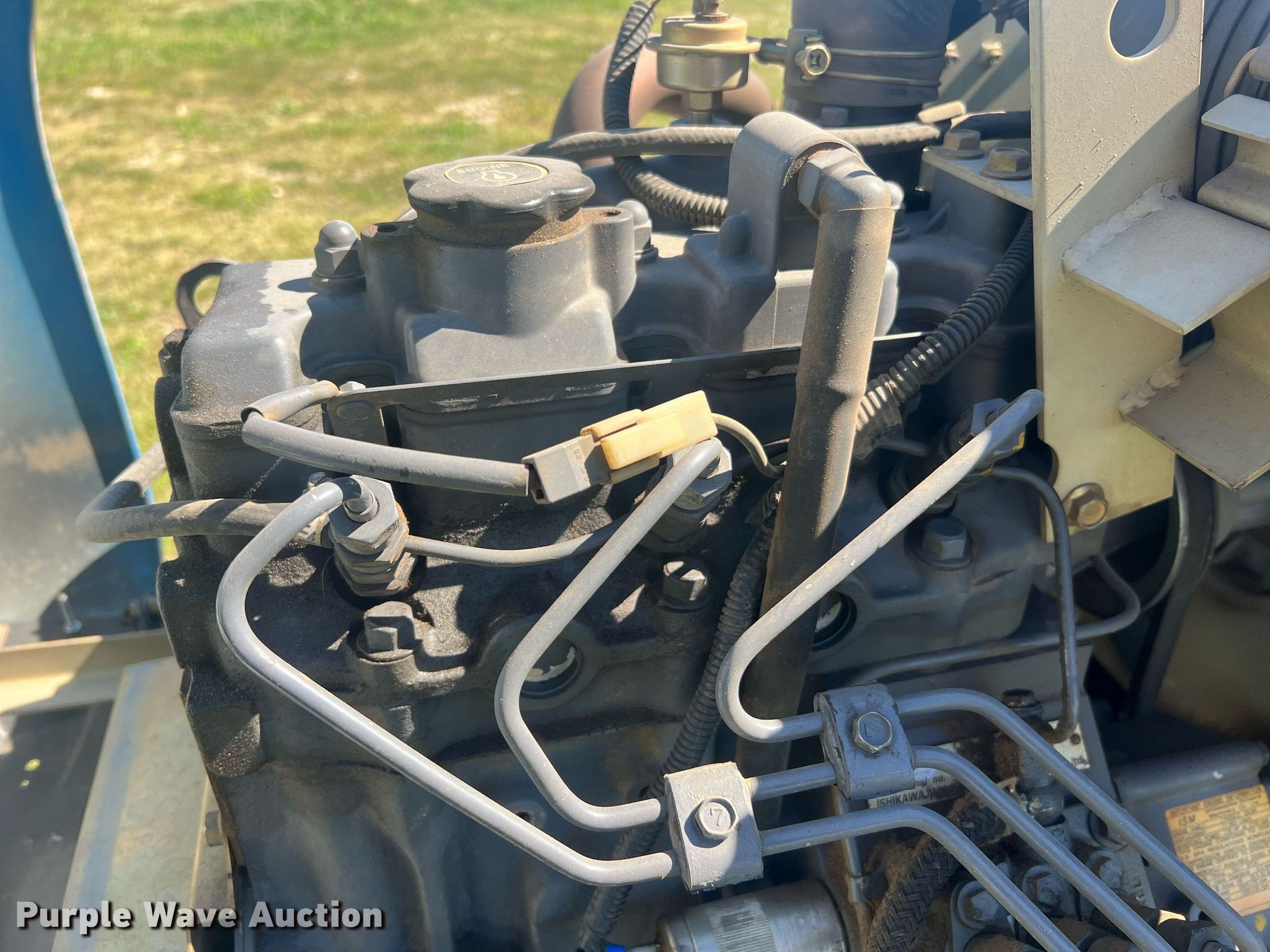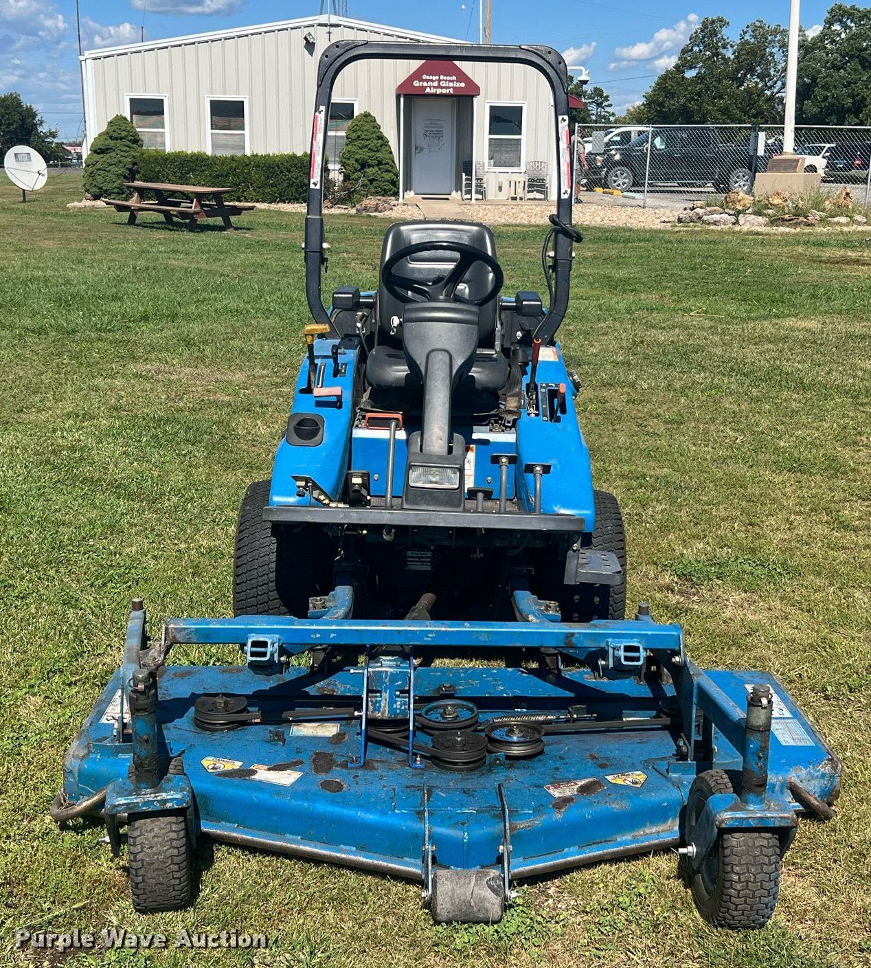 New Holland MC35 lawn mower. Hours: 1,628 on meter, Cutting width: 72", Serial: TF00157. Engine Displacement: 1.663L, Cylinders: 3, Fuel type: Diesel, HP: 35. Transmission Hydrostatic. Chassis Four wheel drive, PTO. Features Hydraulic front deck lift. Tires Front: 23X10.50-12, Rear: 20X8.00-10. Notes Fan blades damaged. City of Osage Beach, MO. 957 Airport Road. Osage Beach, MO 65065