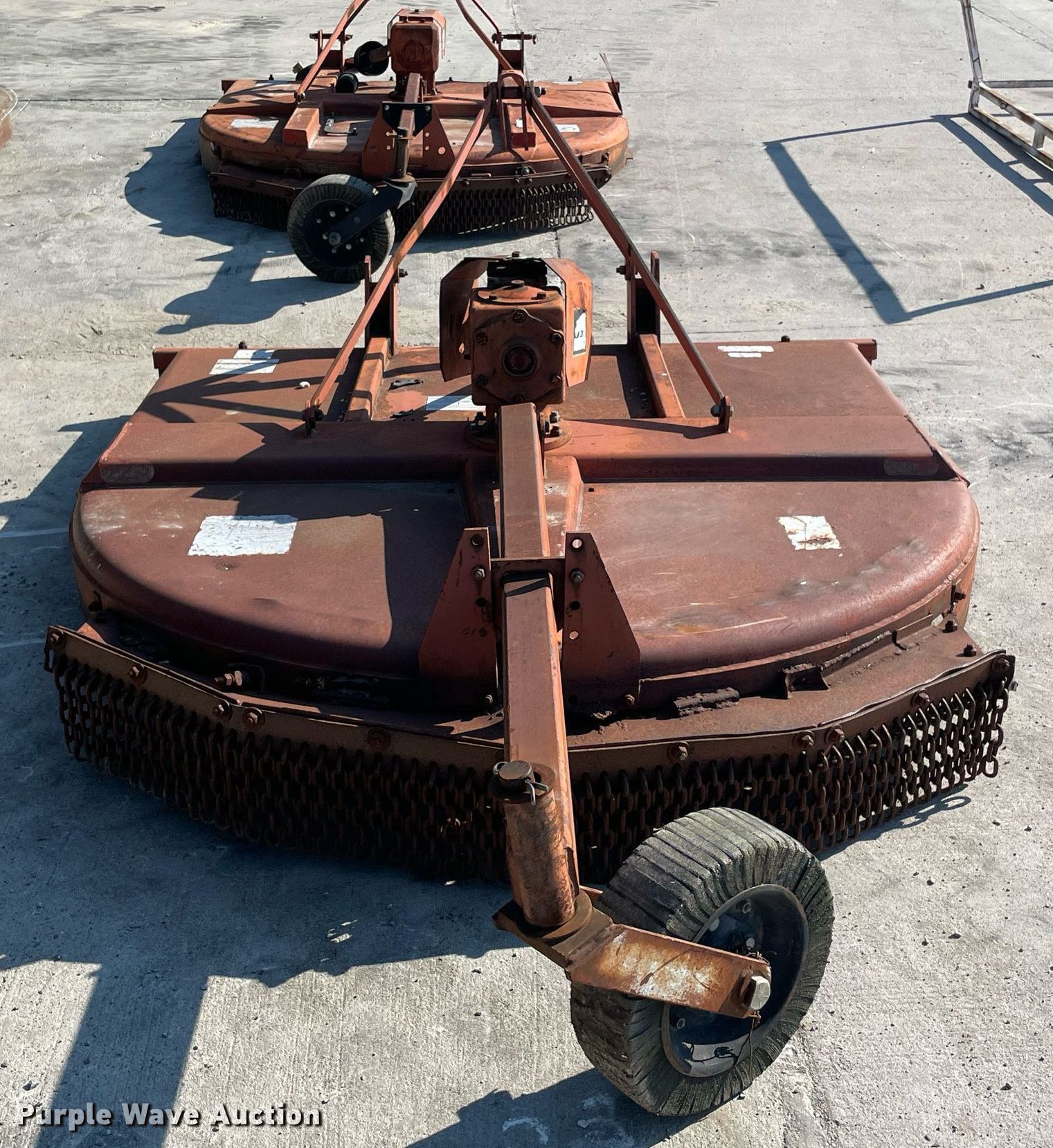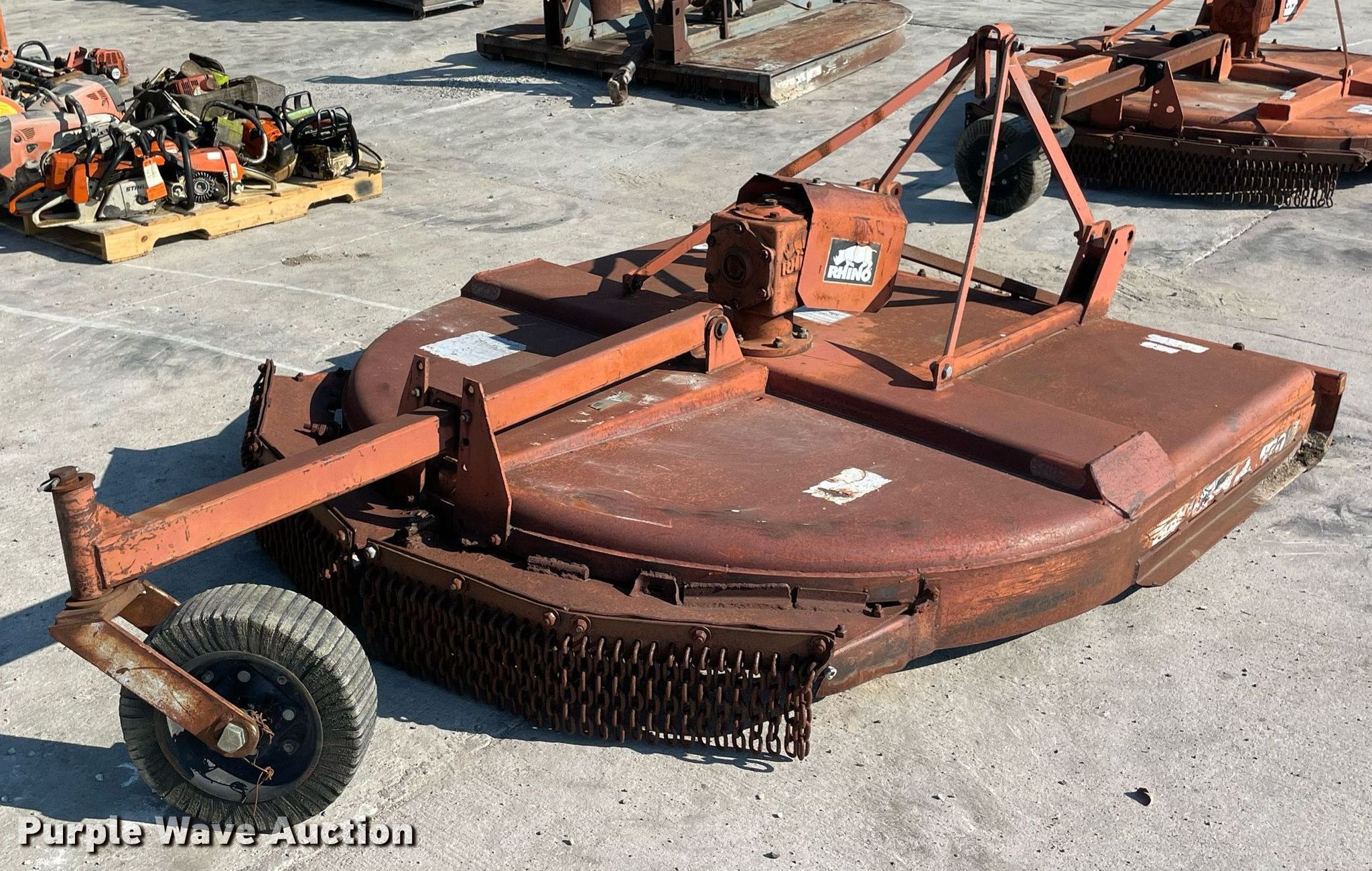 Rhino CY72 rotary mower. Serial: 22673. Features Width: 6', Hitch: Three point. Tires Solid. Notes PTO half shaft missing. 903 East Sam Rayburn Drive. Bonham, TX 75418