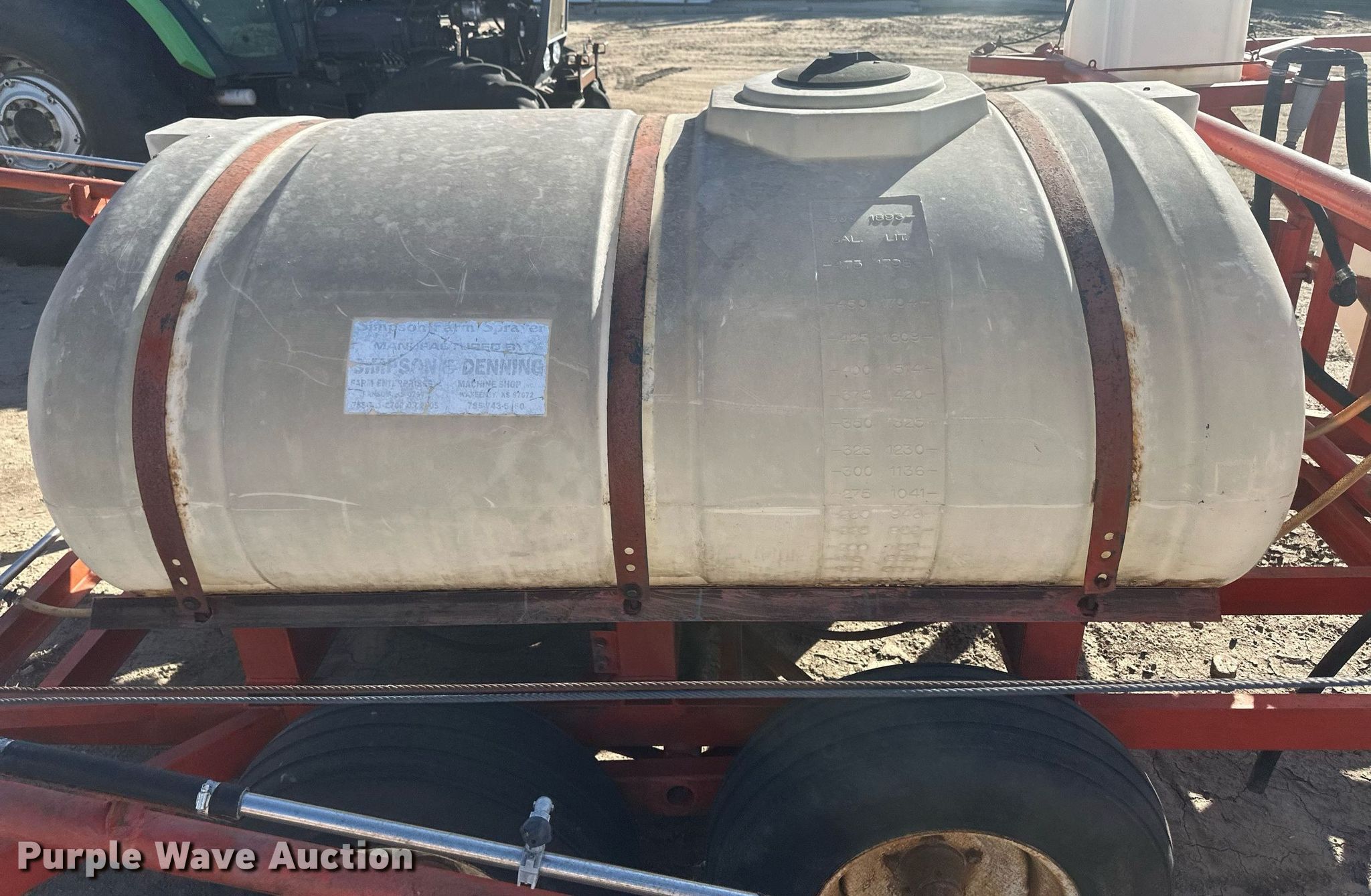 Simpson sprayer. Serial: 413. Features Solution tank Capacity: 500 gallons, Type: Poly, Chemical eductor Capacity: 16 gallons, Type: Poly, Foam markers, Clean water tank, Boom Width: 50', Sections: 3, Nozzles Spacing: 30", Nozzle bodies: Single.. Tires Size: 9.5L-15. Notes Foam marker nozzles missing. 1587 Cottonwood. Sublette, KS 67877
