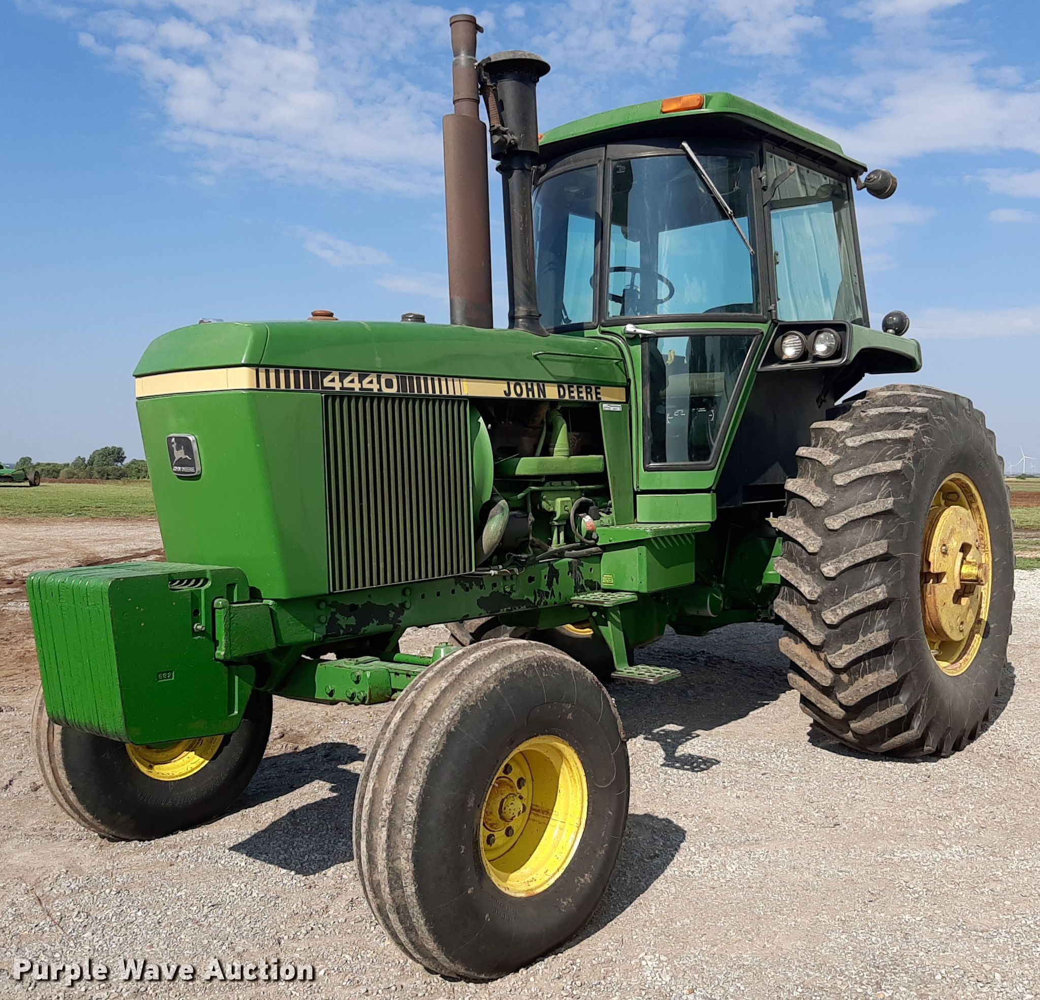 1980 John Deere 4440 tractor. Hours: 3,528 on meter, Serial: 038383R. Engine John Deere, Serial: 129863RG, Cylinders: 6, Fuel type: Diesel. Transmission Quad-range, 16F - 6R. Operators station AC, Heat. Features PTO: 1000, Three point Top link, Rear: 3, Suitcase weights: 12. Tires Front: 11.00-16, Rear: 20.8-34. Notes Hour meter replaced at 5,471 hours, Water pump issues, needs replaced. Jerry and Charlene Vap Trust. Ponca City, OK 74601