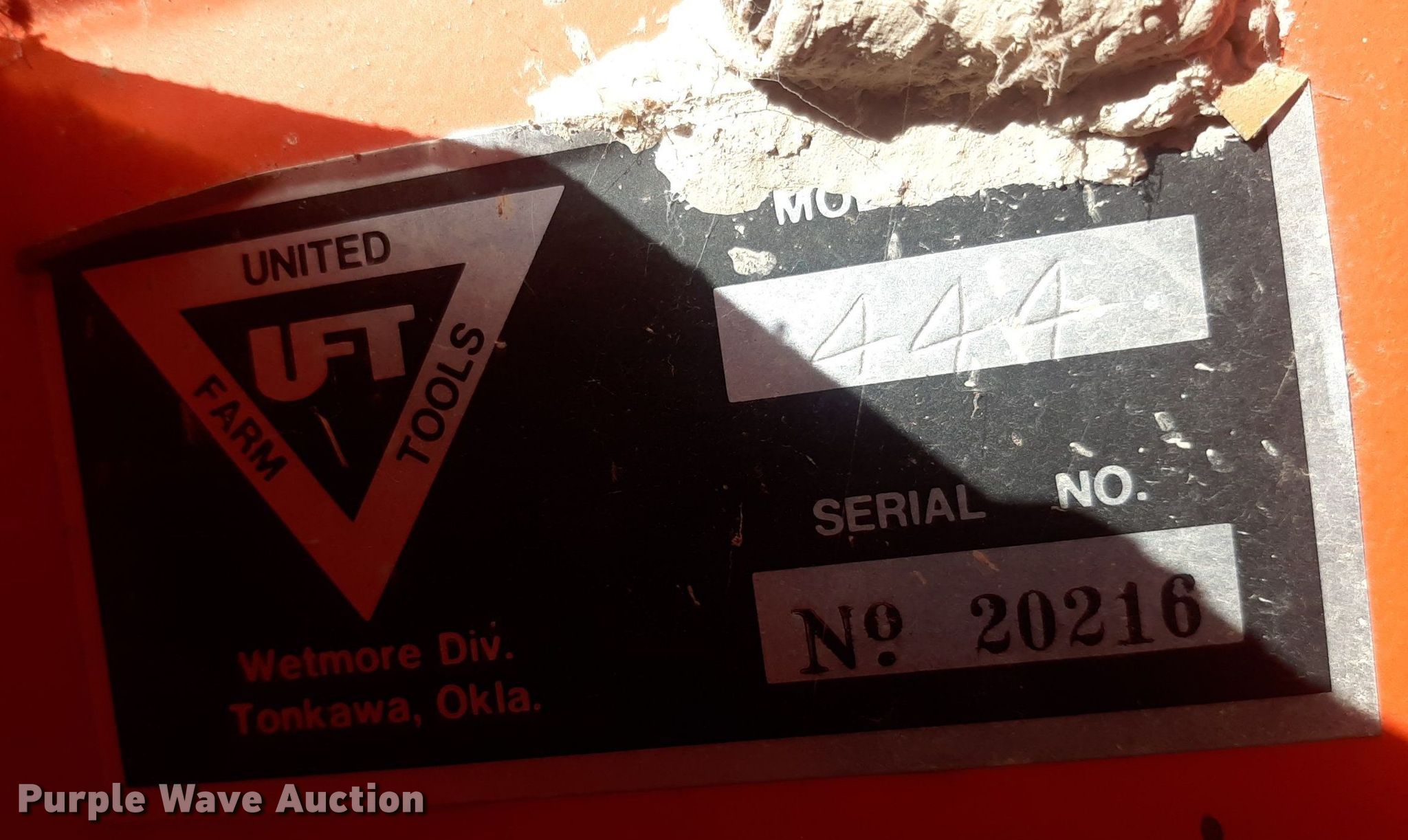 United Farm Tools grain cart. Serial: 20216. Features Capacity: 400 bushels, Auger diameter: 11", PTO: 540. Tires Size: 50x20.0-20. Notes Hydraulic hose issues, needs replaced. Jerry and Charlene Vap Trust. Ponca City, OK 74601
