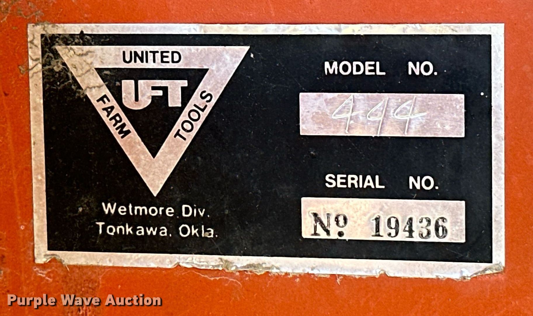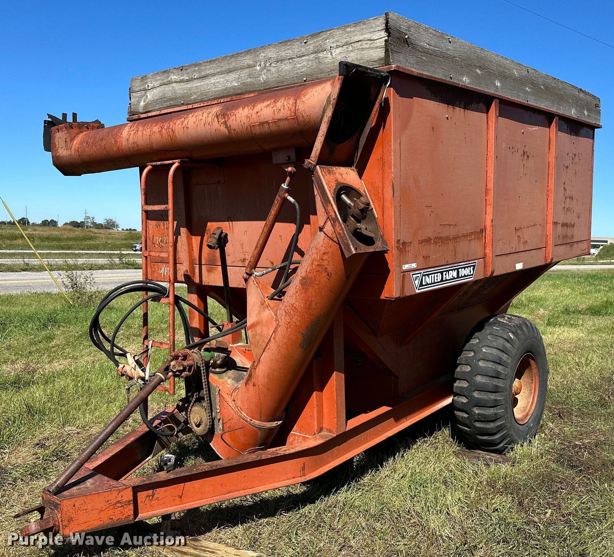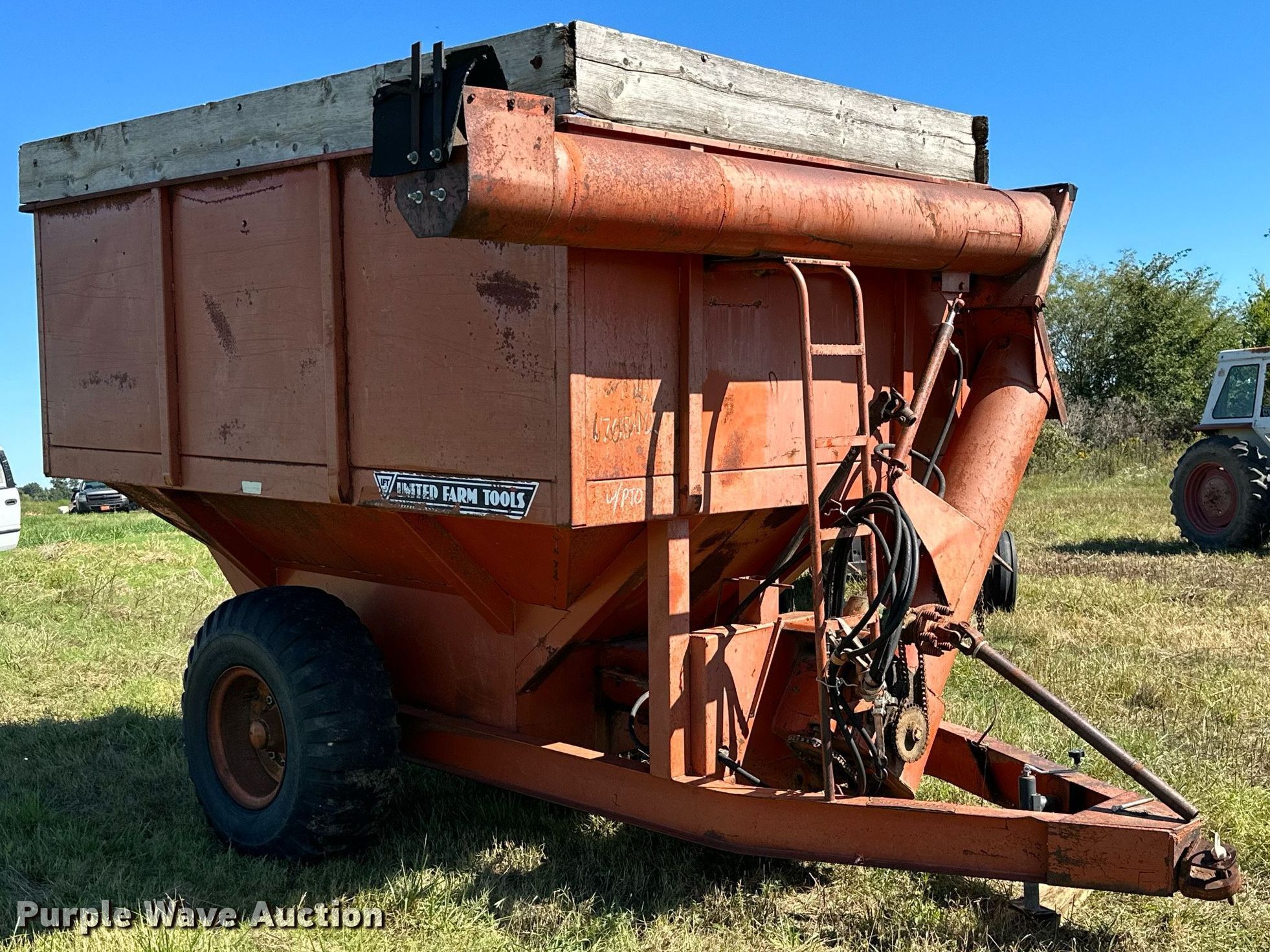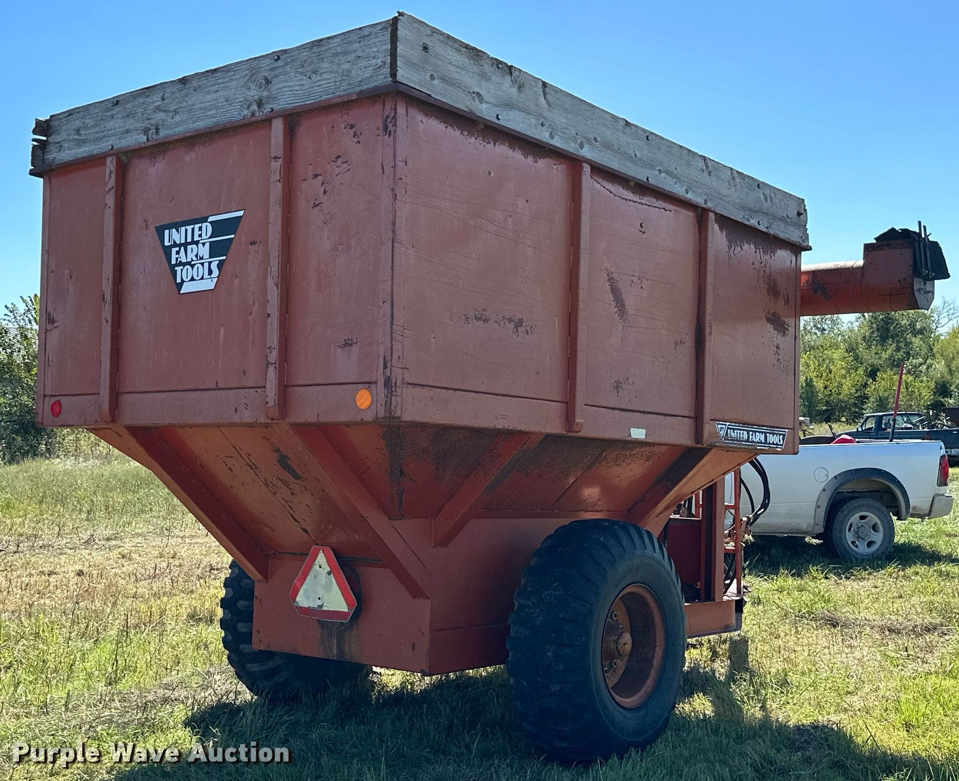 United Farm Tools 444 grain cart. Serial: 19436. Features Auger diameter: 12", PTO: 1000. Tires Size: 14.00-20. Notes Auger length: 14', Hydraulic auger lift, 12' L x 7'8" W x 50" H. Ken Brous. 245 SE 40th Rd. Lamar, MO 64759